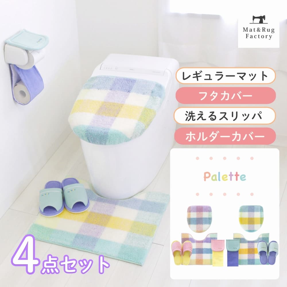 パレット トイレ4点セット ( トイレマット+トイレフタカバー+スリッパ+ホルダーカバー )(洗える 裏面すべり止め加工 チェック パステル ナチュラル 北欧 風水 )