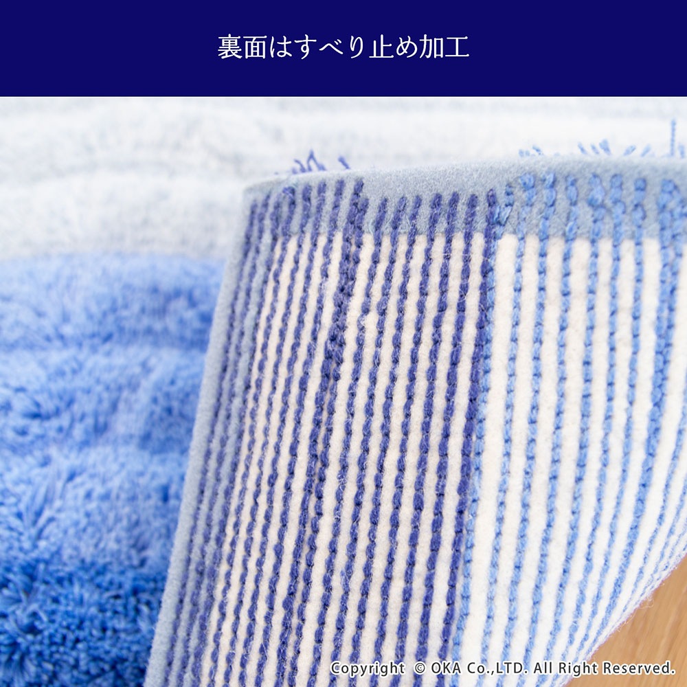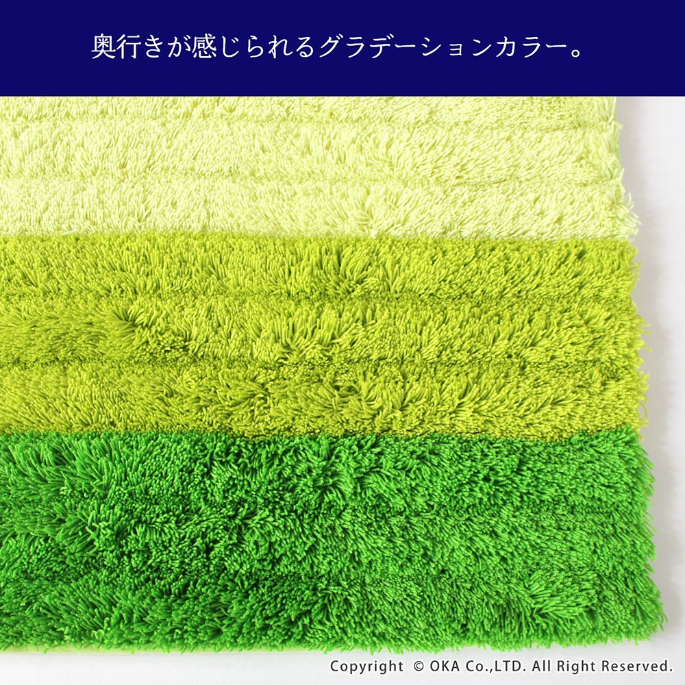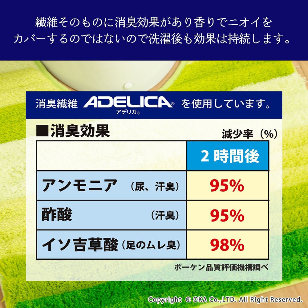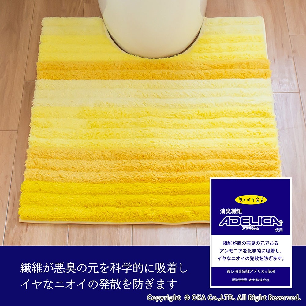 消臭機能がついたトイレタリー「フレッシュデオ」シリーズのトイレマット。香りでニオイをカバーするのでなく、繊維が悪臭の元を化学的に吸着しイヤなニオイの発散を防いでくれます。繊維そのものに消臭効果があり、洗濯しても効果は持続。トイレの中で気になるアンモニア臭にも効果があります。日光に当てたり、洗濯し乾燥させることによって消臭機能は回復します。奥行きが出るグラデーションカラーが美しくトイレ空間が広く感じられる効果も。もこもことした楽しい見た目、ふかふかとした踏み心地も良いマットになりました。裏面にはすベリ止め加工が施されています。