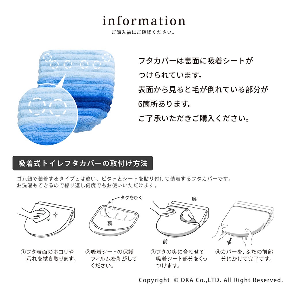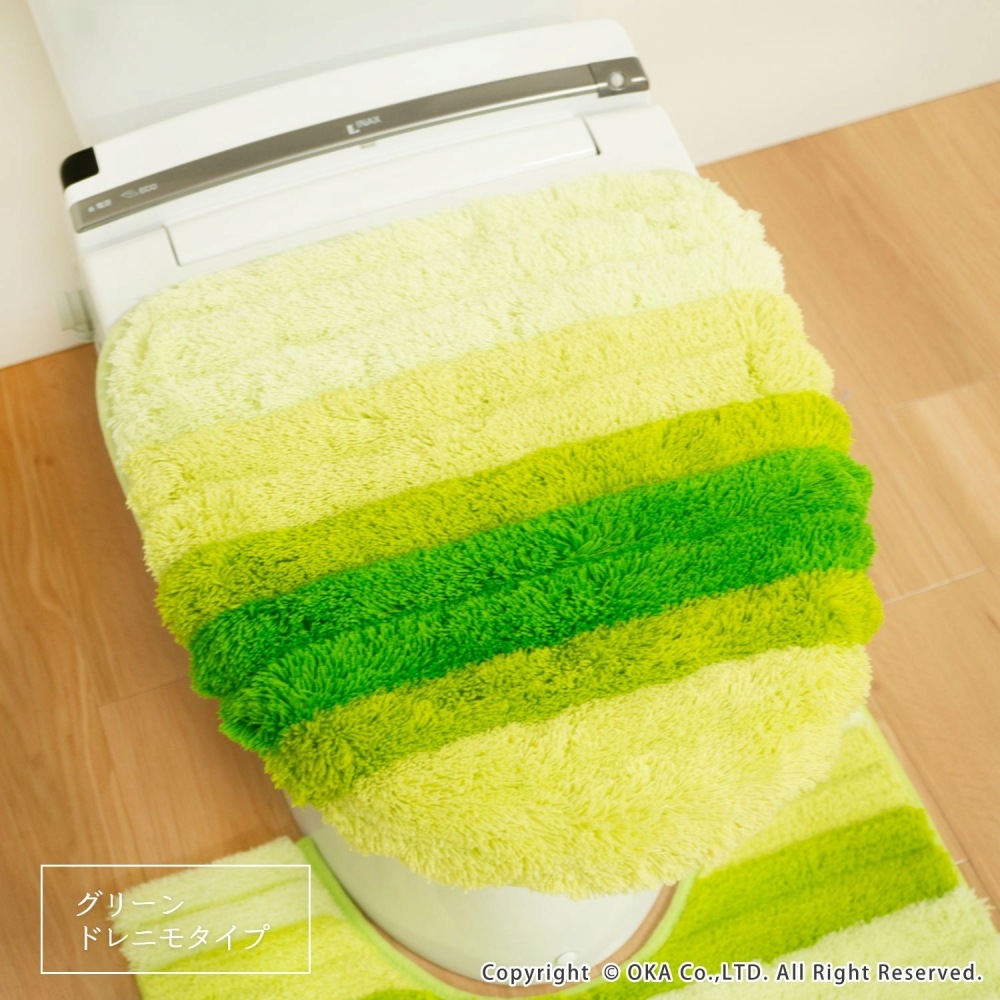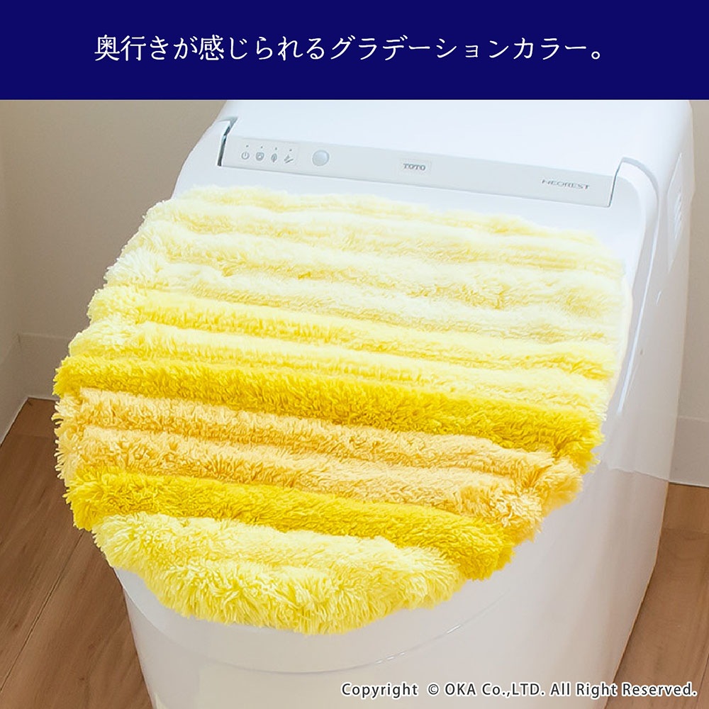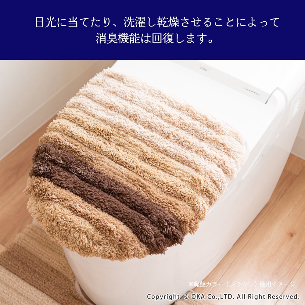 消臭機能がついたトイレタリー「フレッシュデオ」シリーズのトイレフタカバー。香りでニオイをカバーするのでなく、繊維が悪臭の元を化学的に吸着しイヤなニオイの発散を防いでくれます。繊維そのものに消臭効果があり、洗濯しても効果は持続します。トイレの中で気になるアンモニア臭にも効果があります。日光に当てたり、洗濯し乾燥させることによって消臭機能は回復します。奥行きが出るグラデーションカラーが美しく広く感じられます。もこもことした楽しい見た目、ふかふかとしたやわらかなタッチのカバーになりました。裏面にはすベリ止め加工が施されています。