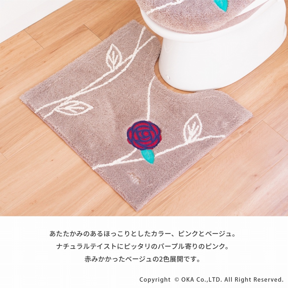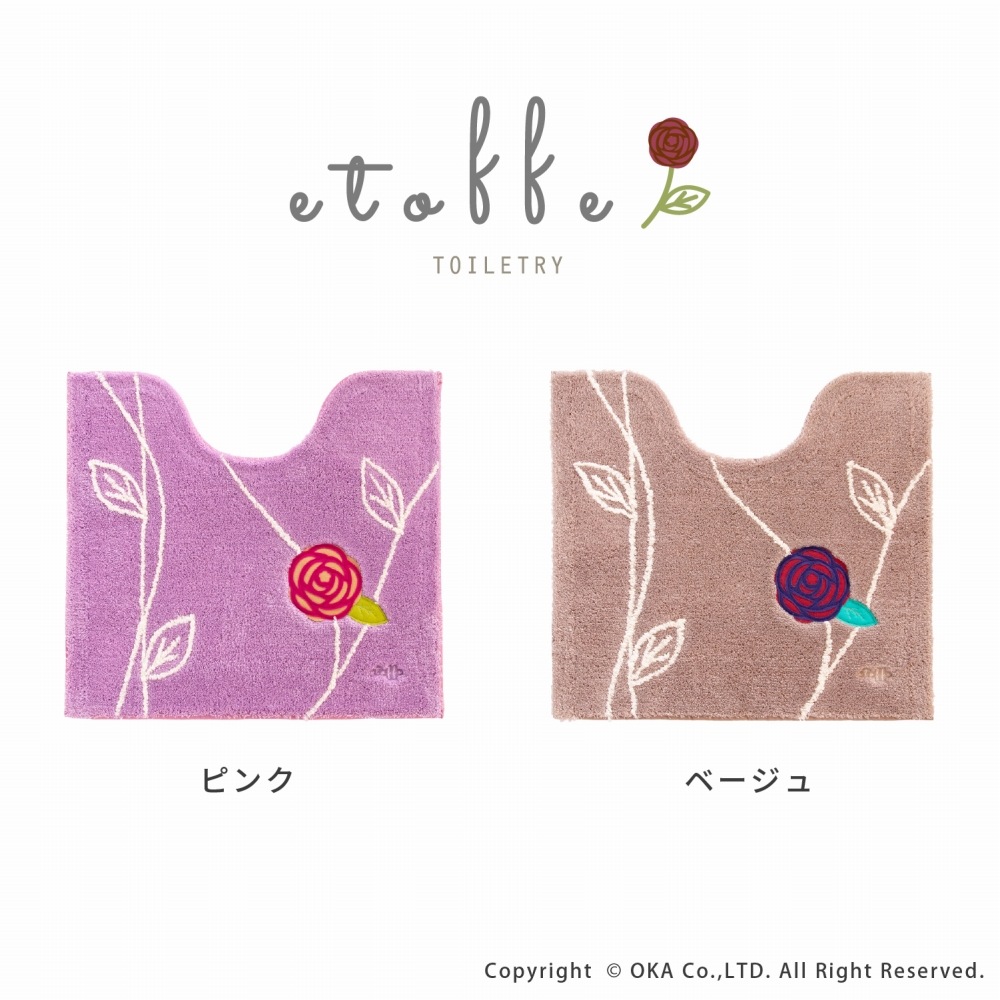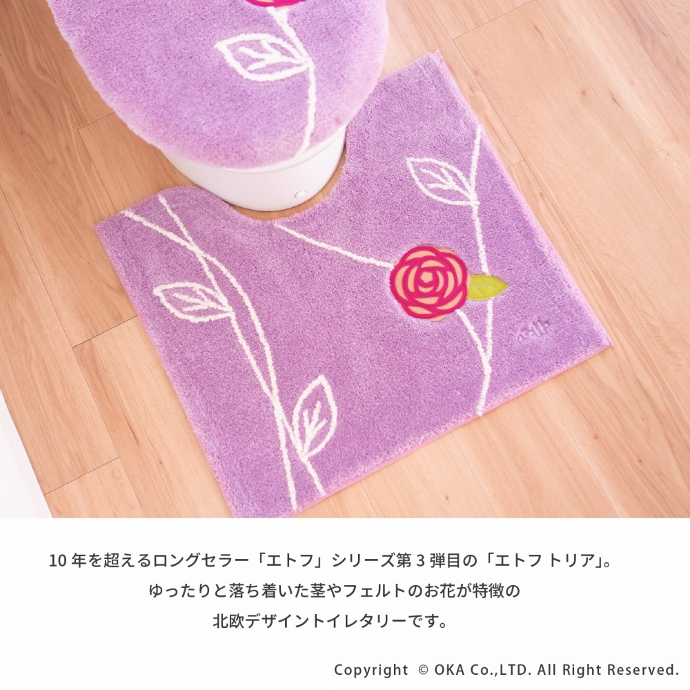 「エトフ」シリーズ第3弾目「エトフ トリア」シリーズのトイレマット レギュラーサイズ 。ゆったりと落ち着いた茎やフェルトのお花が特徴の北欧デザイントイレタリーです。あたたかみのあるほっこりとしたカラー、ピンクとベージュ。エトフシリーズの特徴である大きなアップリケパッと目を引く大胆なデザインです。またふかふかでクッション性もよく素足で触れたくなるやわらかさです。このシリーズはすべてお洗濯可能。気になる汚れがあればすぐにお洗濯いただけます。