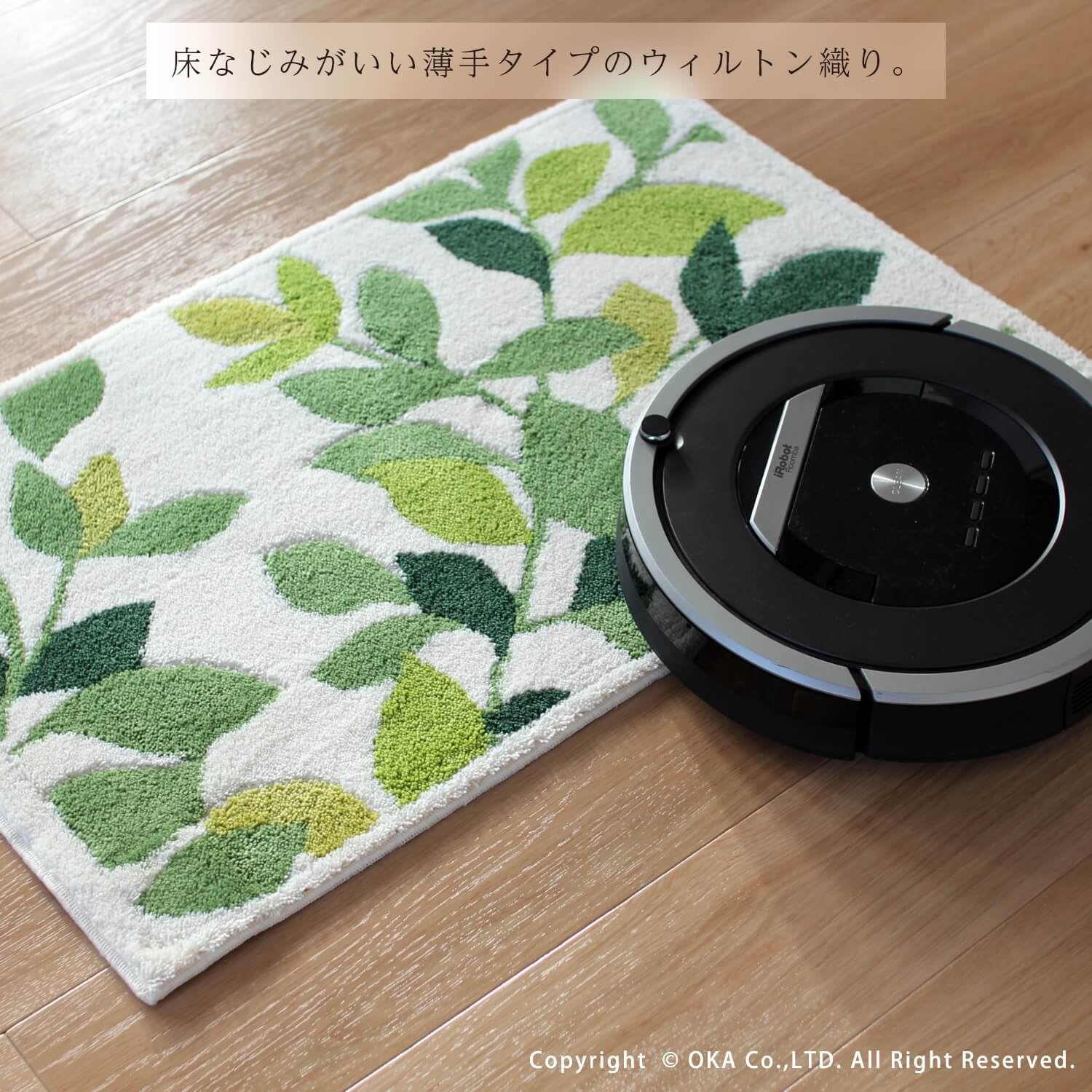 ナチュラルで爽やかな植物柄を大胆に表現した日本製ウィルトン織りの洗える玄関マット「リーフグリーン」。季節やインテリアを選ばず、長くお使いいただける定番のデザインです。爽やかなイエローグリーンと濃いグリーンで、玄関に観葉植物を飾った時のようなフレッシュな雰囲気にしてくれます。日本製の丁寧な作りのマットですので、洗濯を繰り返してもへたれにくくなっています。マットの細部の縫製まで手を抜かない日本製で毛羽立ちが少ないのが特徴です。扱いやすく薄手でしっかりしたウィルトン織りのマットですので、玄関だけではなく洗面所やベッドサイドなで、インテリアラグとしてもお使いいただけます。裏面の4コーナーに吸着シートを施しているので、ロボット掃除機を利用してもズレに強く、人通りが多い玄関でも快適にお使いいただけます。
