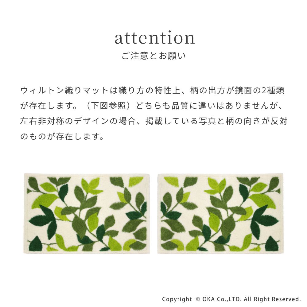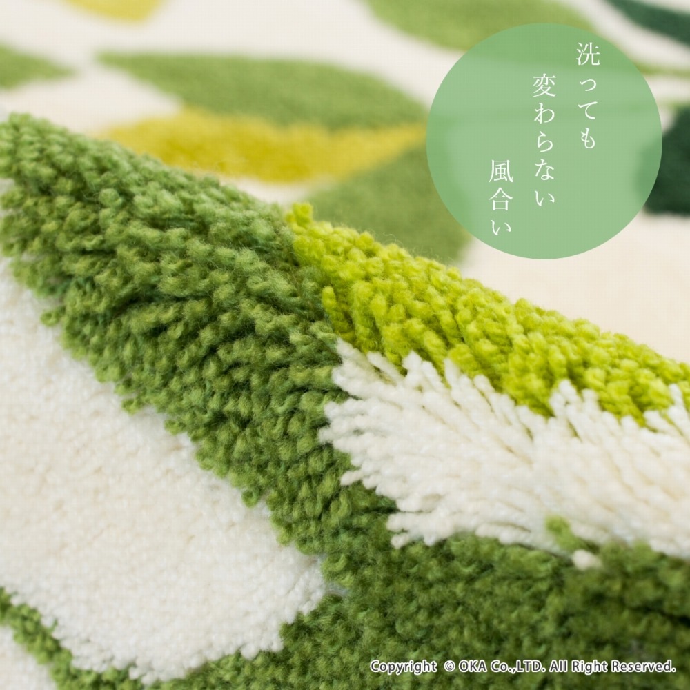 ナチュラルで爽やかな植物柄を大胆に表現した日本製ウィルトン織りの洗える玄関マット「リーフグリーン」。季節やインテリアを選ばず、長くお使いいただける定番のデザインです。爽やかなイエローグリーンと濃いグリーンで、玄関に観葉植物を飾った時のようなフレッシュな雰囲気にしてくれます。日本製の丁寧な作りのマットですので、洗濯を繰り返してもへたれにくくなっています。マットの細部の縫製まで手を抜かない日本製で毛羽立ちが少ないのが特徴です。扱いやすく薄手でしっかりしたウィルトン織りのマットですので、玄関だけではなく洗面所やベッドサイドなで、インテリアラグとしてもお使いいただけます。裏面の4コーナーに吸着シートを施しているので、ロボット掃除機を利用してもズレに強く、人通りが多い玄関でも快適にお使いいただけます。