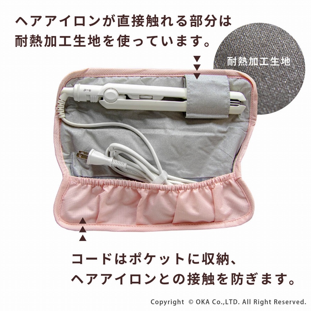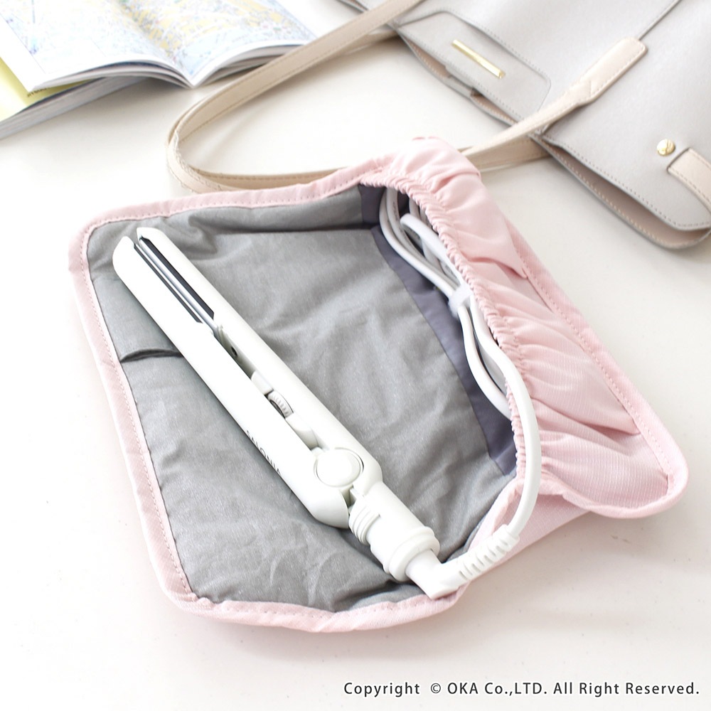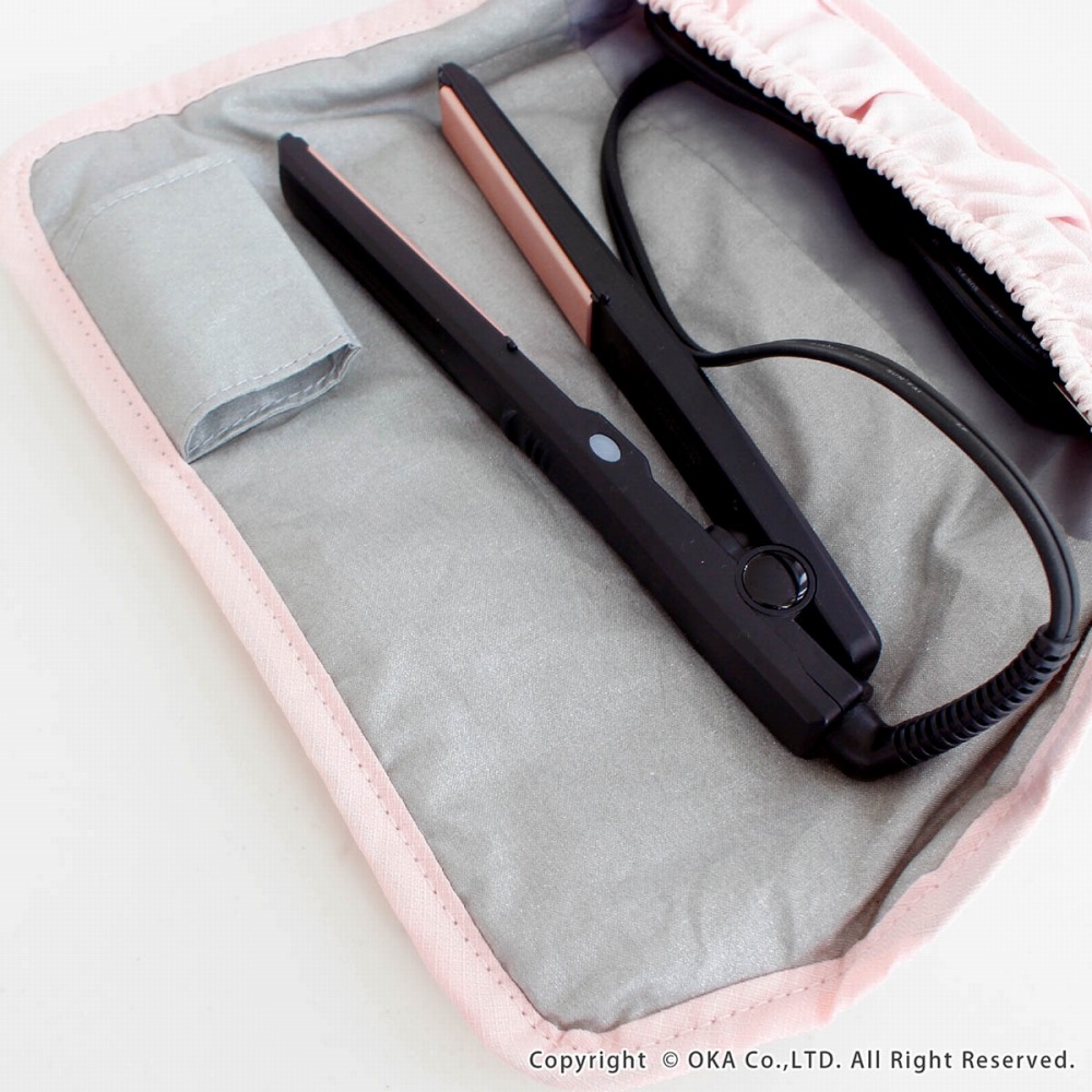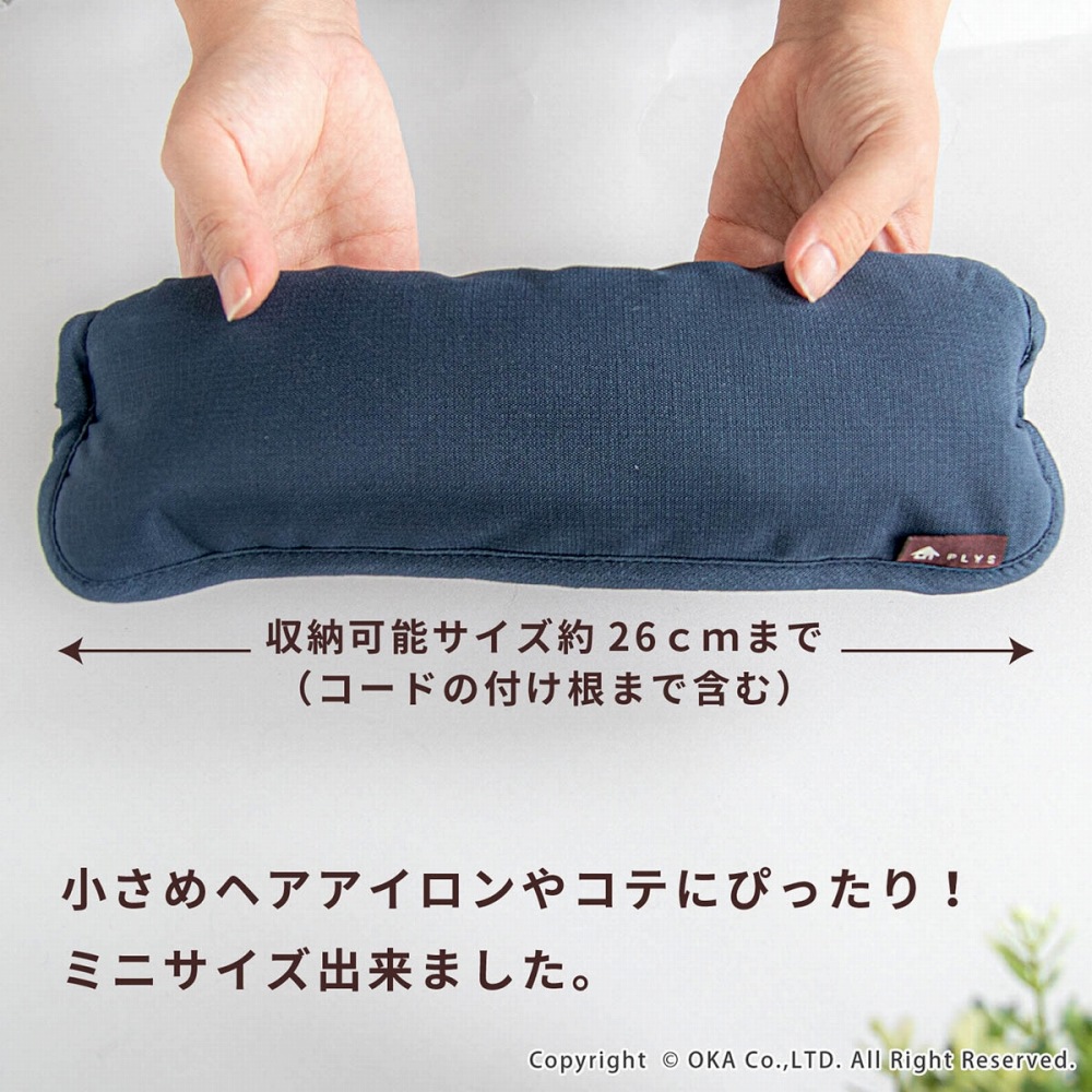 ミニサイズのヘアアイロンを持ち運ぶのに便利なヘアアイロンポーチミニ。コンパクトになるので、カバンなどに入れてもかさばりません。コードはポケットに収納でき、直接熱が当たらないので、コードを傷めるのを防ぎます。くるくる巻いて簡単収納。巻き式なのでそれぞれのヘアアイロンに合ったコンパクトなサイズに折りたためます。クッション性を持たせたので、ヘアアイロンを優しくカバーしてくれます。 ※耐熱加工生地を使用していますが、使用する際はアイロンの熱が十分に冷めてから収納してください。 ※全長約26cmまで収納可能ですが、メーカーや形状によってはサイズ内でも入らない場合がございます。