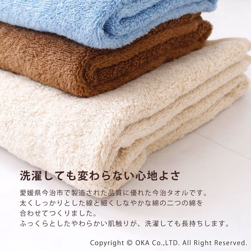 確かな品質でぬくもり感のある、四国・今治生まれのタオル。太い綿糸と細くてしなやかな綿糸を合せて、やわらかな肌ざわりでボリューム感のあるタオルに仕上げました。心地よい肌ざわりとふっくらとしたボリューム感は洗濯しても長持ちします。一般的なサイズで使いやすい34×77cm。タオルハンガーにもかけやすく、洗面所やキッチンでも活躍します。