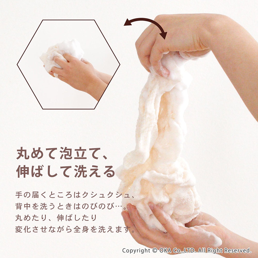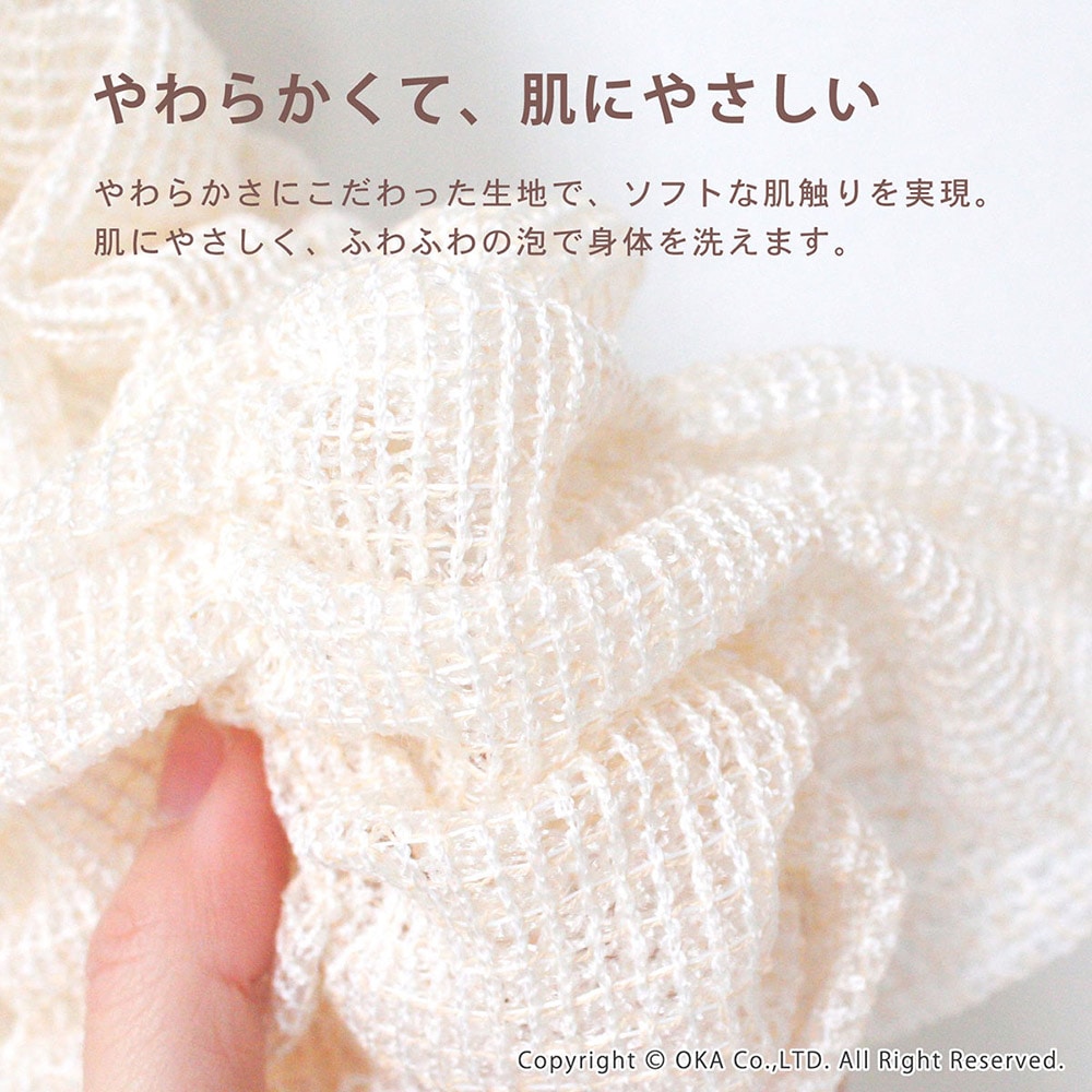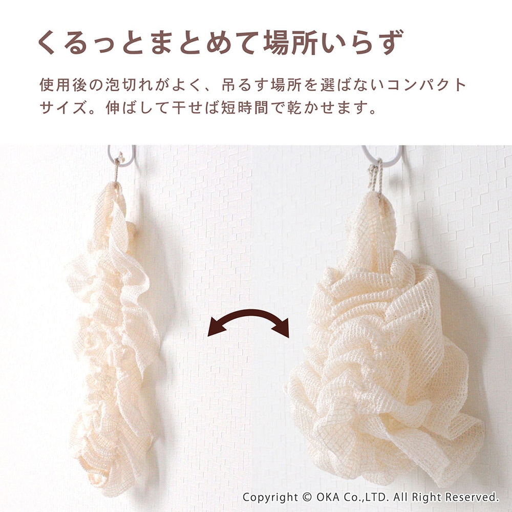 手の届くところはクシュクシュ、背中を洗うときはのびのび…。吊るす場所を選ばないコンパクトサイズで、伸ばして干せば早く乾かせます。クロスして編み込まれた生地によってたくさんの空気層ができ、ふわふわの泡立ちを実現。たっぷりの泡で心地よく洗えます。お肌に優しいやわらかタイプです。