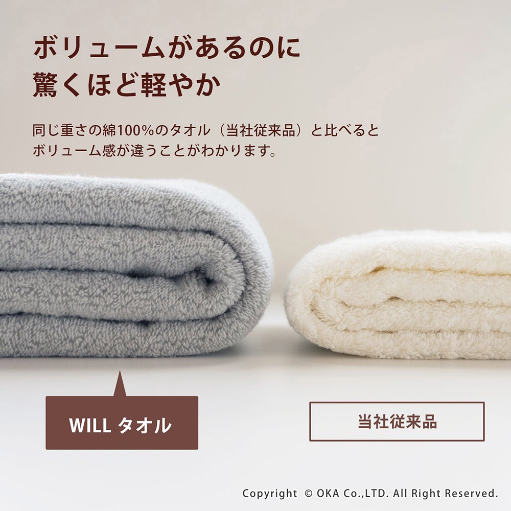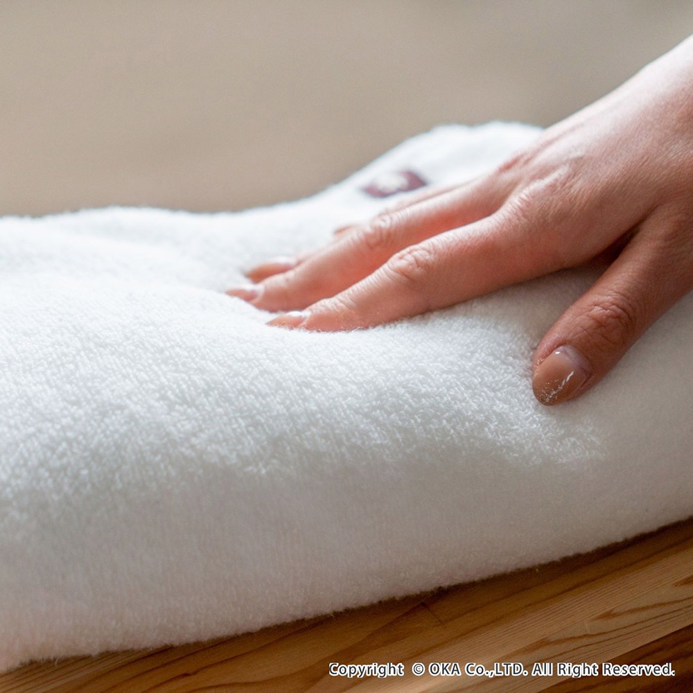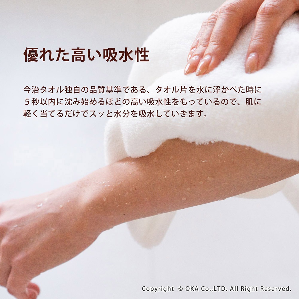 まるでマシュマロにふれているかのようなもっちりとした肌触り。柔らかさ、ふっくらとしたボリューム感があるので、贅沢な使い心地です。無撚糸は綿本来のふっくらとしたやわらかい風合いと、繊維と繊維の間に空気を含み、高い吸水性がある糸です。この撚りのほとんどない糸「無撚糸」を使用してタオルを作りました。「今治タオル工業組合」が定める独自の品質基準に合格した今治タオルブランド商品認定マークがついた高品質なタオルです。経済や環境、社会的責任を思案し責任のある綿花生産を行い、サステナビリティな目標を心がけているアメリカ綿「COTTON USA」のコットンを使用しています。アメリカ綿は耐久性に優れ、丈夫で長持ちする点が特徴です。