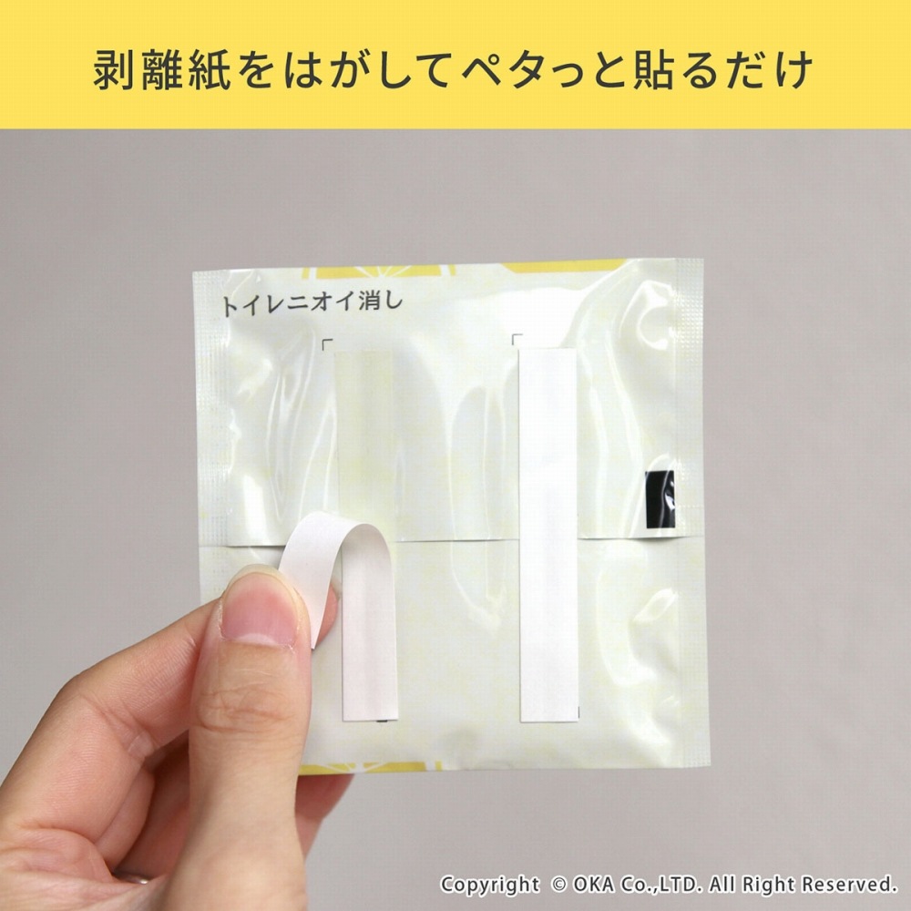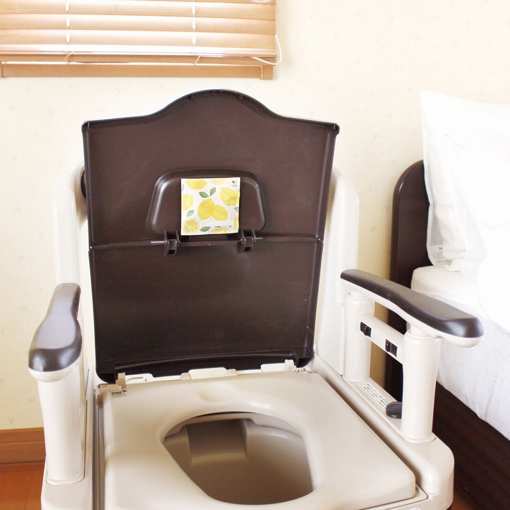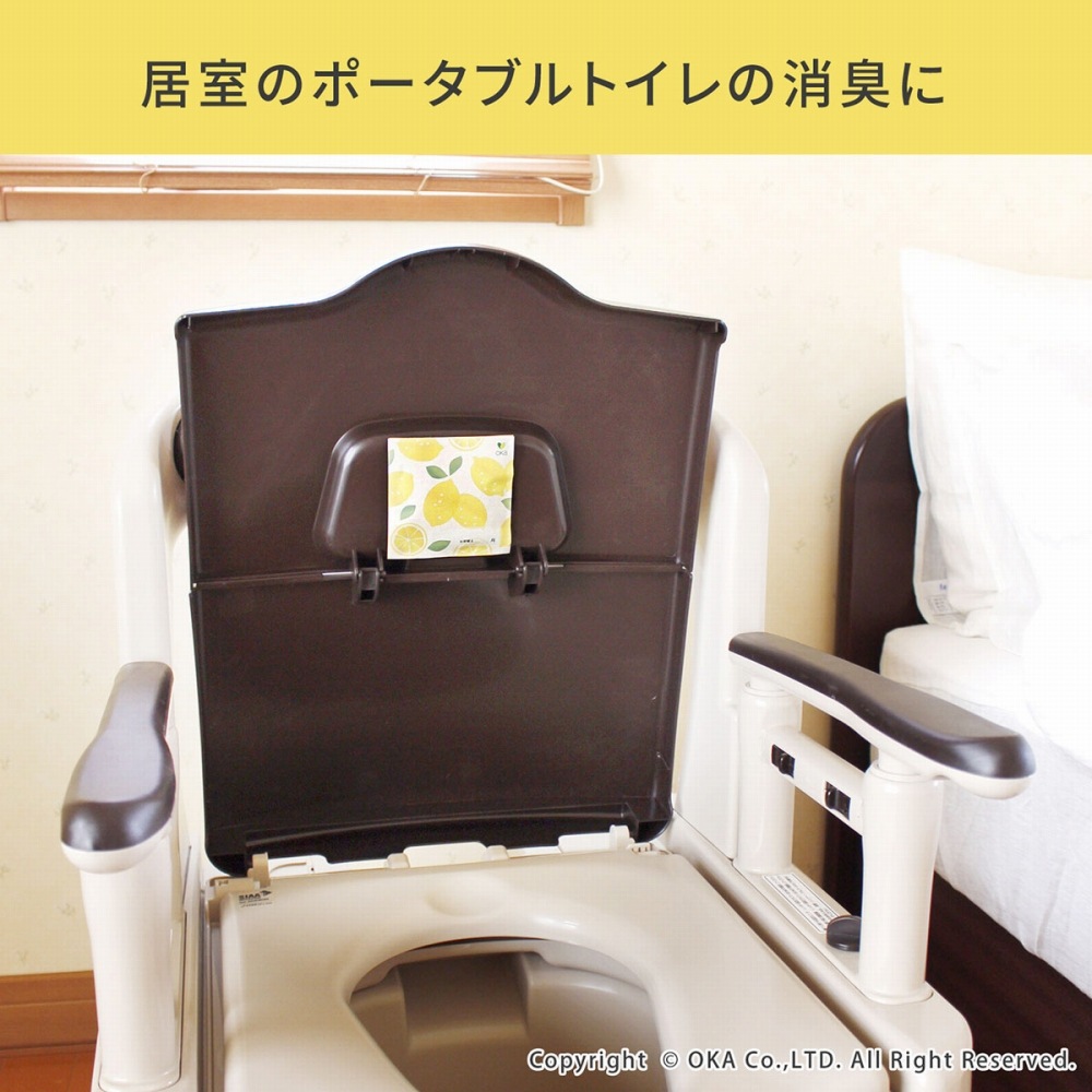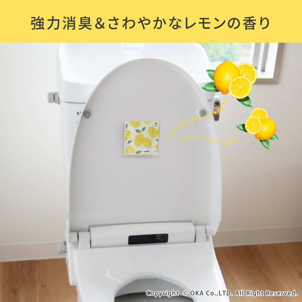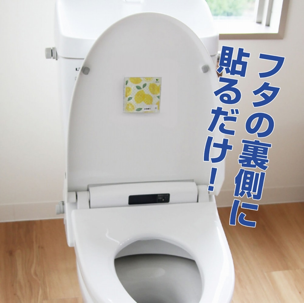 洋式トイレやポータブルトイレ、おまるの蓋の裏側に貼るだけでイヤなニオイを強力に消臭します。空気中の悪臭が、シート表面に塗布された持続性消臭基材に触れると「無臭」に!生ゴミのイヤなニオイを強力に消臭します。ベッドサイドに置かれるポータブルトイレでもニオイが広がるのを予防することができます。イヤなニオイ4大悪臭、例えば尿や汗の分解物であるアンモニア、腐敗卵臭や硫黄系臭気などの硫黄水素、腐敗玉ねぎ臭などのメチルメルカブタン、腐敗魚臭などのトリメチルアミンをおそよ10分程で消臭してくれます。また消臭だけではなくレモンの芳香剤でいつも爽やかに。消臭効果は使用環境等により若干異なる場合がありますが、約3ヵ月間持続します。