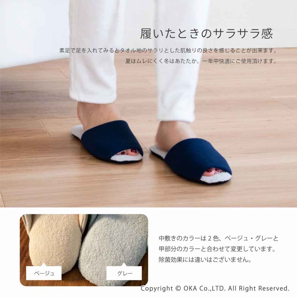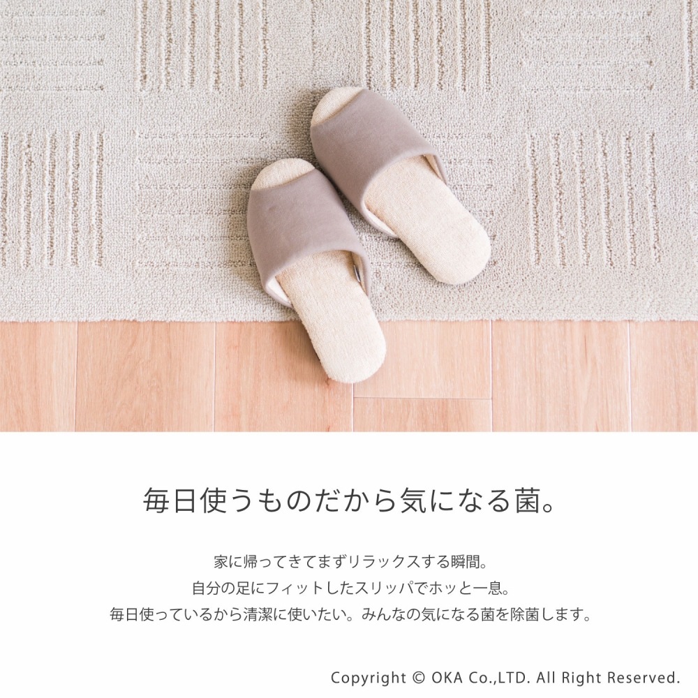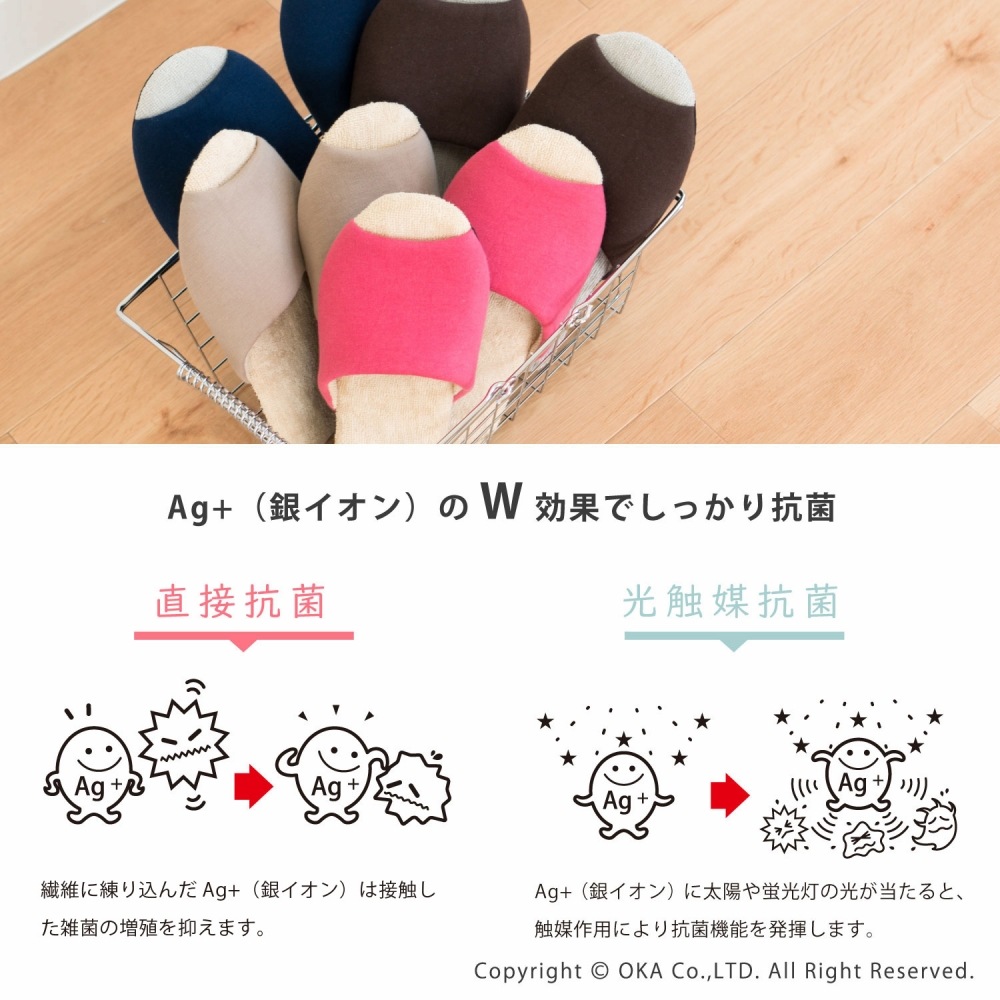 銀の力で足元清潔、Ag+安心スリッパソフティ。中敷部分は厚みを加え、ゆったりとしていながらも安定感のある履き心地を実現。どんなインテリアにもなじみやすいデザインにしました。足に直接触れる甲裏と中敷きには銀イオンが練りこまれた繊維を使用。ニオイの元となる雑菌の育成を抑えます。光触媒抗菌ももっているので、太陽や蛍光灯が当たると抗菌機能を発揮。家族の足元をスリッパで清潔に守ります。