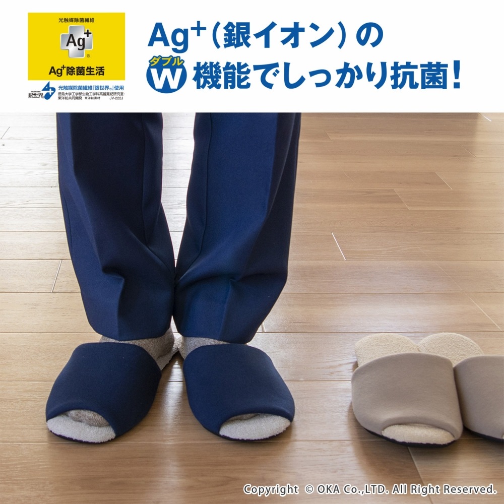Ag+でイヤなニオイがしないソフティ2 スリッパの機能や素材感をそのままに、たくさんのお声があった通気性がのよい前開きタイプができました。どんなインテリアにもなじみやすいフォルムで、お部屋の邪魔をしません。もちろん足に直接触れる甲裏と中敷きには銀イオンが練りこまれた繊維を使用。 ニオイの元となる雑菌の育成を抑えます。光触媒抗菌ももっているので、太陽や蛍光灯が当たると抗菌機能を発揮。家族の足元をスリッパで清潔に守ります。