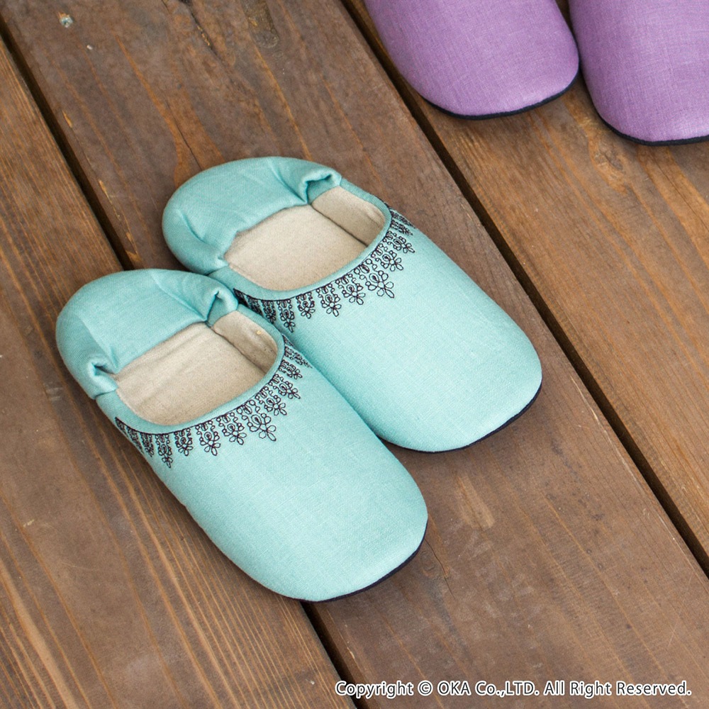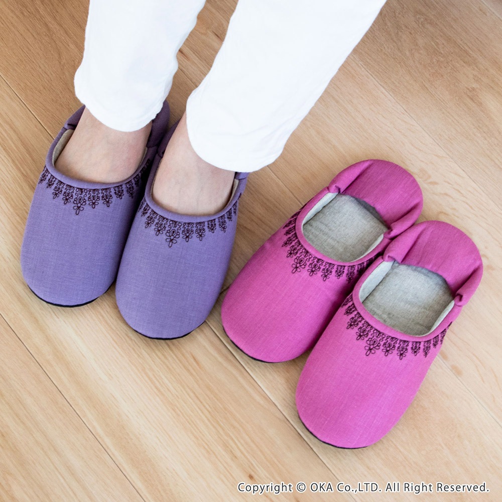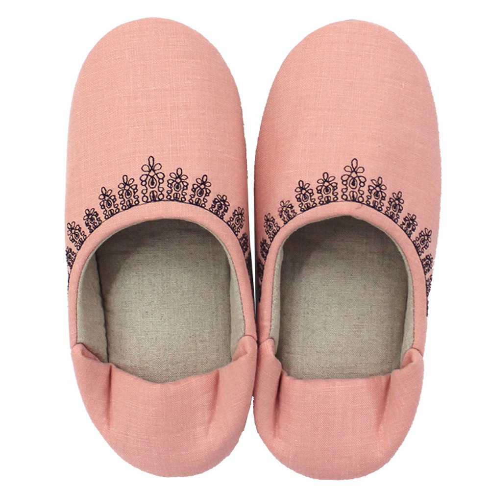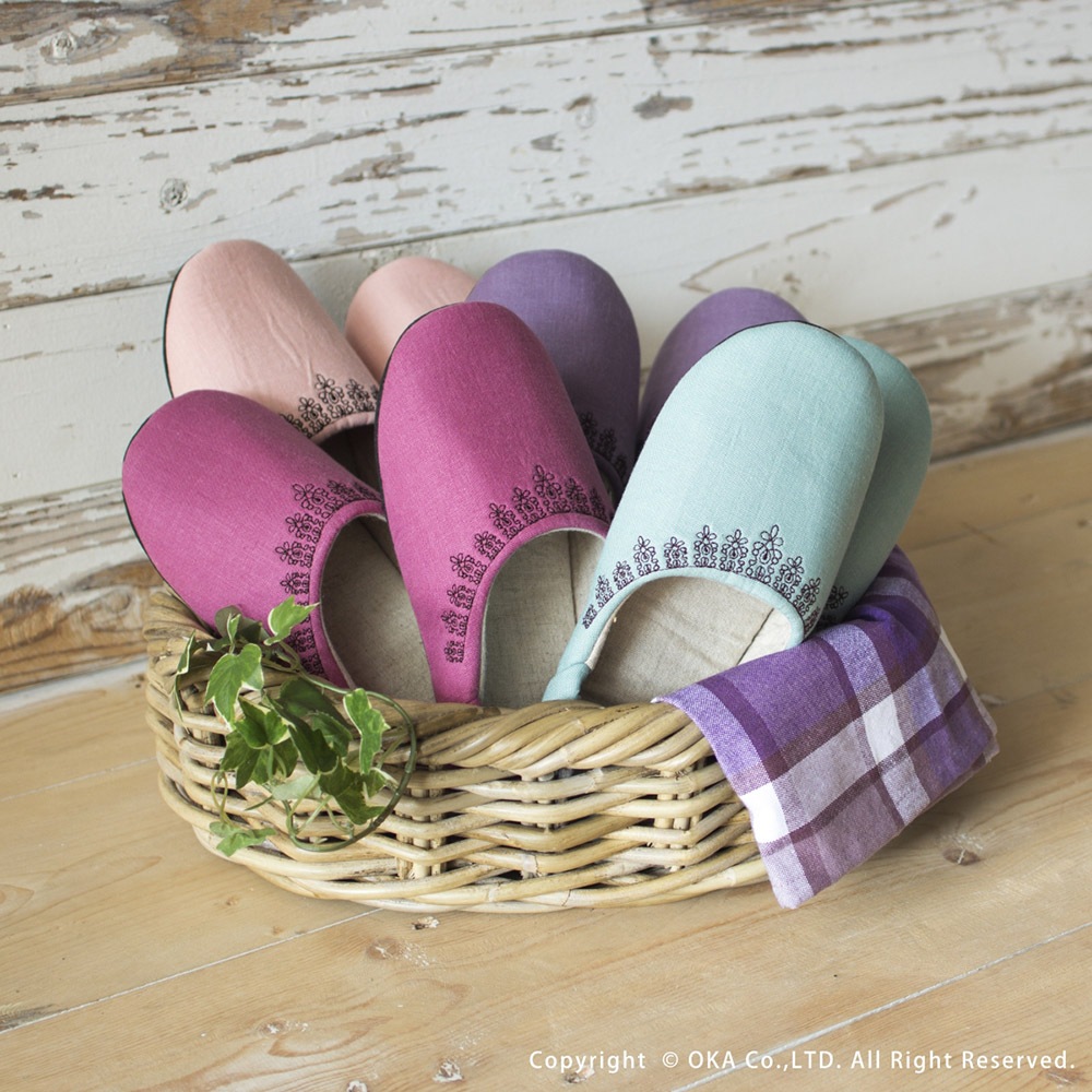 ナチュラルでシンプルな作りが可愛いバブーシュタイプのルームシューズです。カラフルなマカロンのような甘いカラーで揃えました。リネンを使用していますので、お洗濯するうちにだんだんと風合いが増していくのが特徴です。甲表に黒い糸でレース模様を刺繍していて可愛らしくちょっとした贈り物にもお薦めです。家の中でもおしゃれに可愛く、冷え対策にも!丸洗いできるので日常使いにピッタリです。