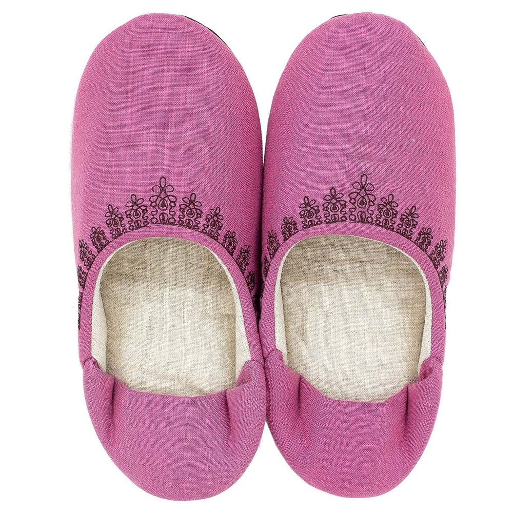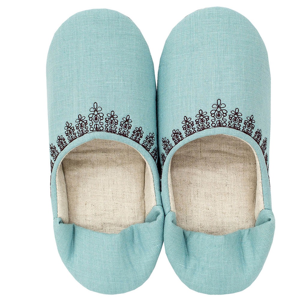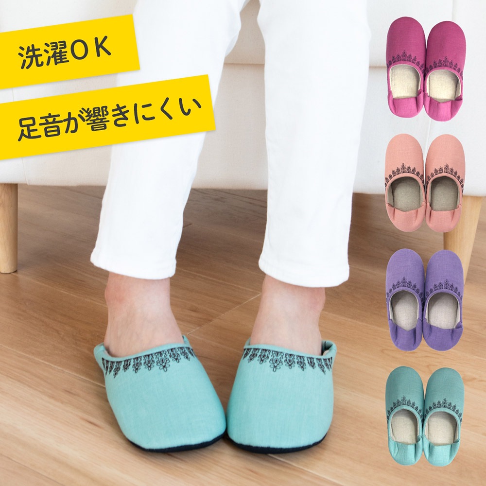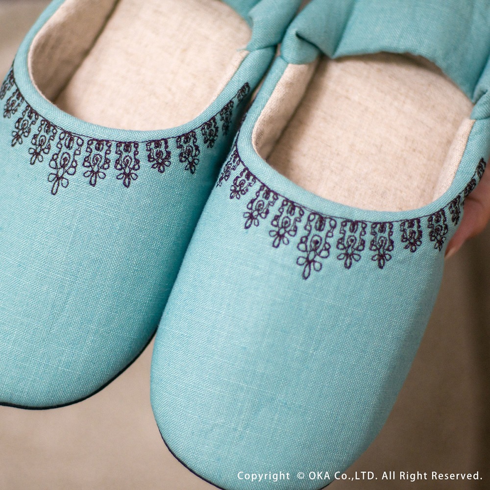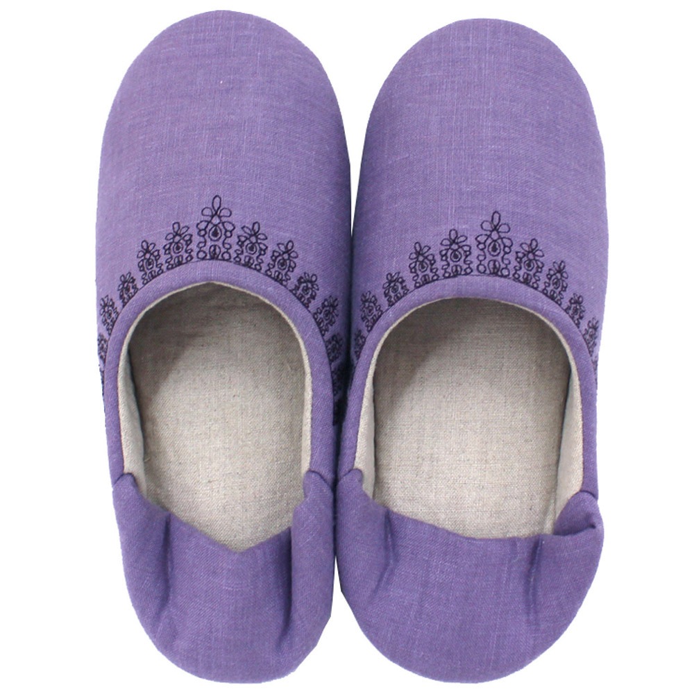 ナチュラルでシンプルな作りが可愛いバブーシュタイプのルームシューズです。カラフルなマカロンのような甘いカラーで揃えました。リネンを使用していますので、お洗濯するうちにだんだんと風合いが増していくのが特徴です。甲表に黒い糸でレース模様を刺繍していて可愛らしくちょっとした贈り物にもお薦めです。家の中でもおしゃれに可愛く、冷え対策にも!丸洗いできるので日常使いにピッタリです。