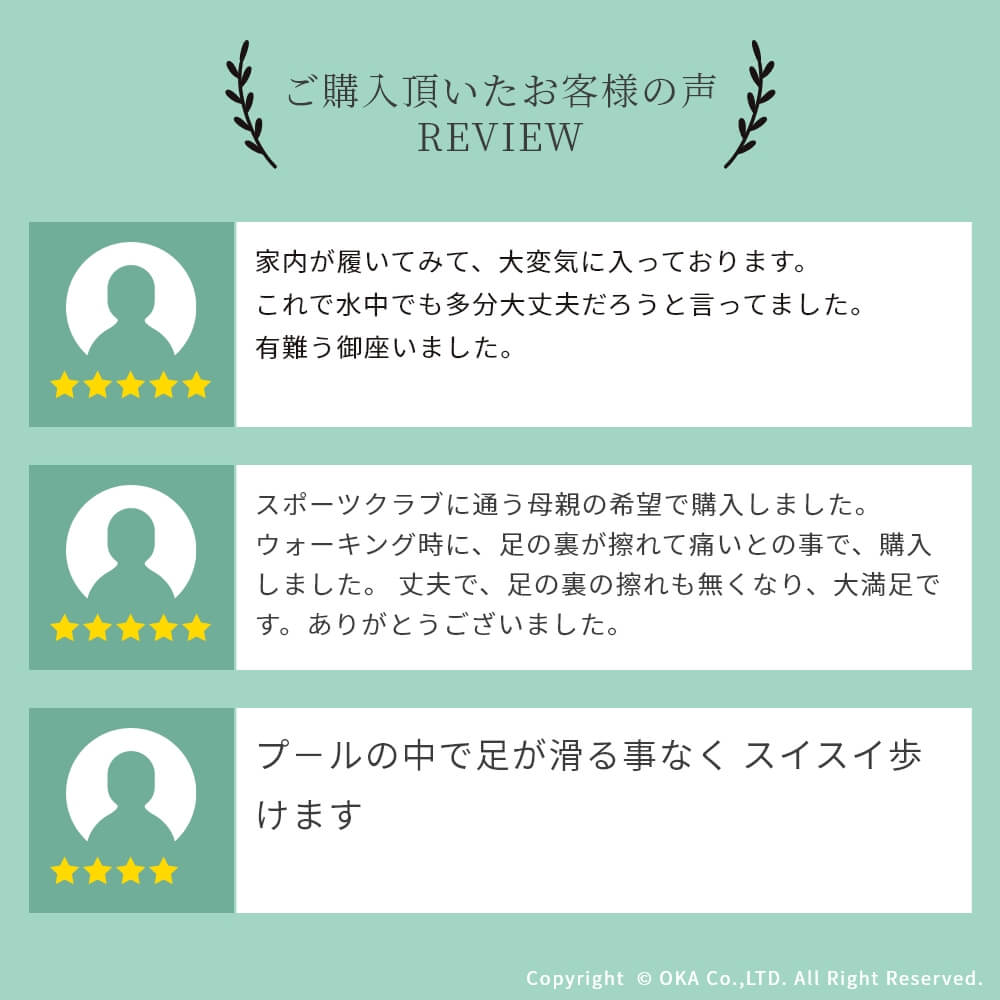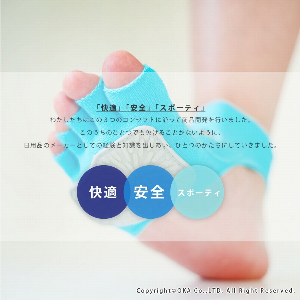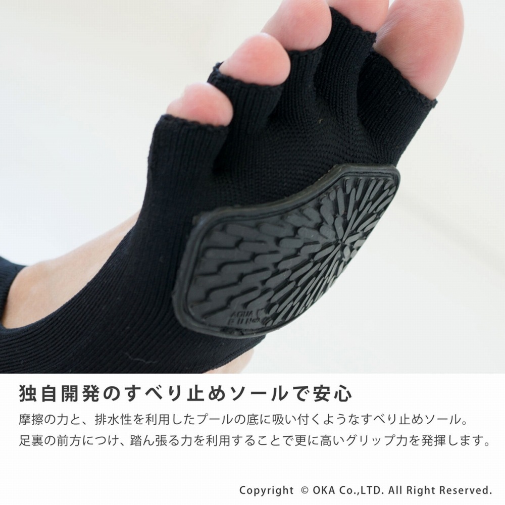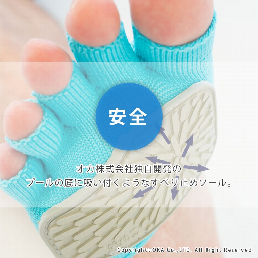 プールでのアクアウォークやアクアエクササイズを行う際滑らないように履くアクアシューズ。持ち運びが大変だったり、お手入れが面倒だったり…もっと手軽に水中運動を楽しんでもらいたい。そんな思いからオカ株式会社はゼロからプールエクササイズ専用サポーターの開発に取り組みました。水着の素材を参考に柔軟性と排水性を兼ね揃えたオリジナル生地を開発。激しい動いても破れず、だけどお手入れは簡単。また、5本指靴下の開発を参考に指先開放型を採用。ふんばる力をサポートしより快適なアクアライフの手助けをします。特殊パターン設計で排水性と高摩擦性能を実現した、独自開発の水中すべり止めソール。水中での滑りや転倒を予防し、快適でリズミカルなステップが踏める高いグリップ力を発揮します。また快適なすべり止めソールに加えまるで素足のような軽さが特徴。足への負担を軽減します。
