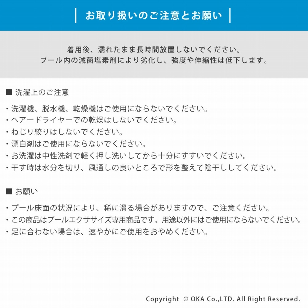 - ●プール床面の状況により、稀に滑る場合がありますので、ご注意ください。 ●この商品はプールエクササイズ専用商品です。用途以外にはご使用にならないでください。 ●足に合わない場合は、速やかにご使用をおやめください。