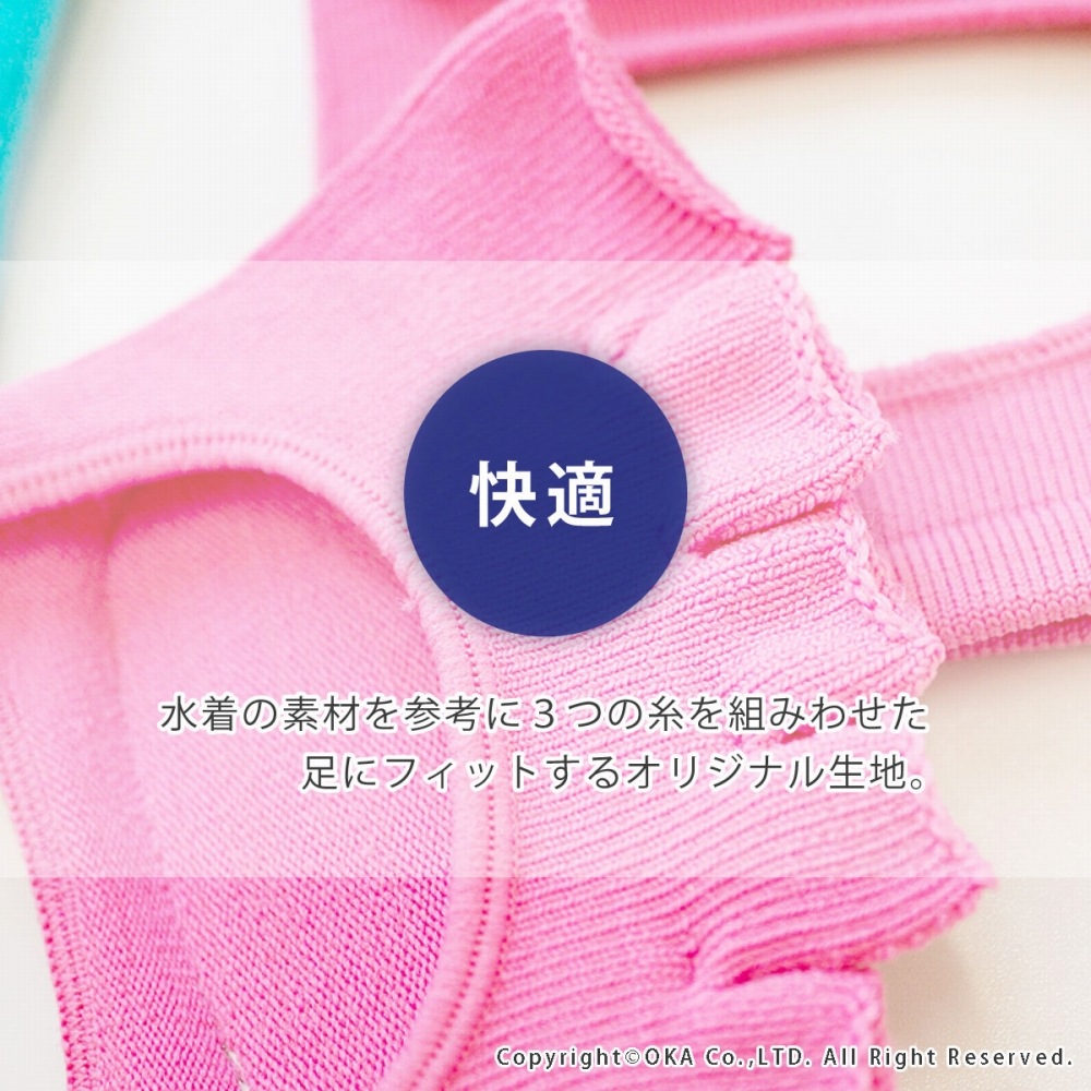 水着の素材を参考に柔軟性と排水性を兼ね備えたオリジナル生地を開発。30種類の中から現行の生地をセレクト。激しく動いても破れず、だけどお手入れは簡単。また、五本指靴下の開発を参考に指先開放型を採用。ふんばる力をサポートし、より快適なアクアライフの手助けをします。