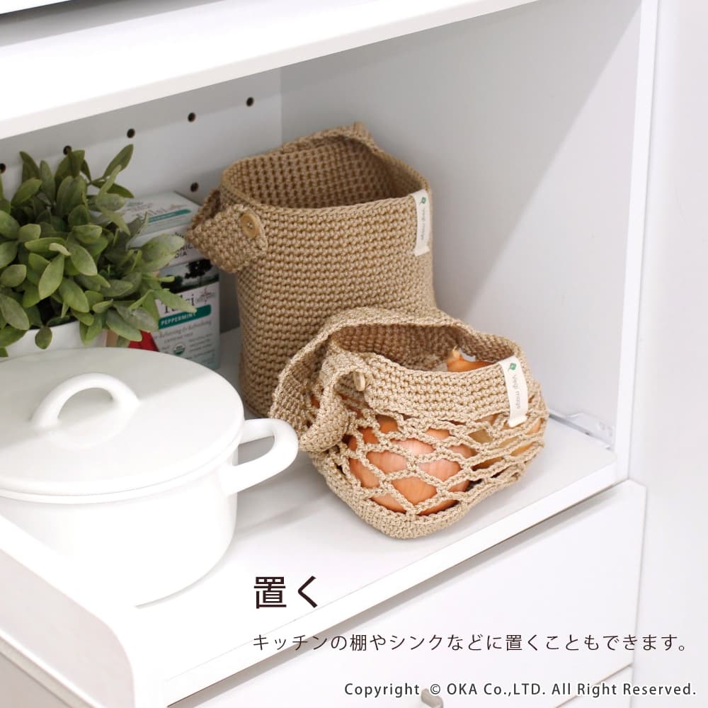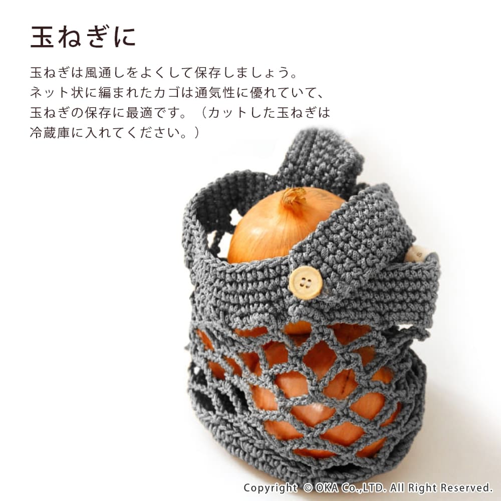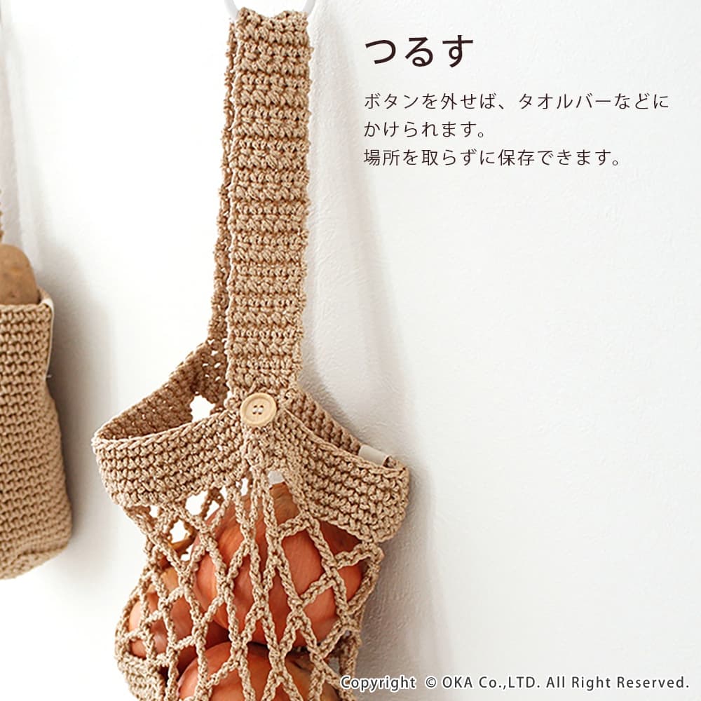 健康と美容のために毎日食べたい野菜だから、いつも常備しておきたい。でも、買ったはいいけど忙しさに追われて気づくと傷んでる...もう食べられない...心もお財布も傷みます。そんな野菜の保存の不便を解決するベジマジシリーズは、意外と知らない野菜の正しい保存方法が簡単にできるグッズです。玉ねぎは風通しをよくして保存しましょう。ネット状に編まれたカゴは通気性に優れていて、玉ねぎの保存に最適です。(カットした玉ねぎは冷蔵庫に入れてください。)ボタンを外せば、タオルバーなどにかけられて場所を取らずに保存できます。洗濯ネットに入れて洗濯機で丸洗い可能です。