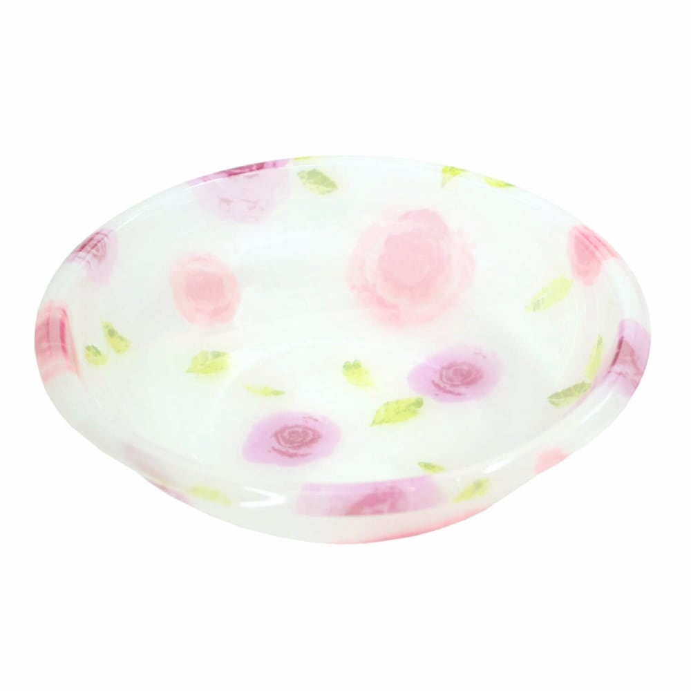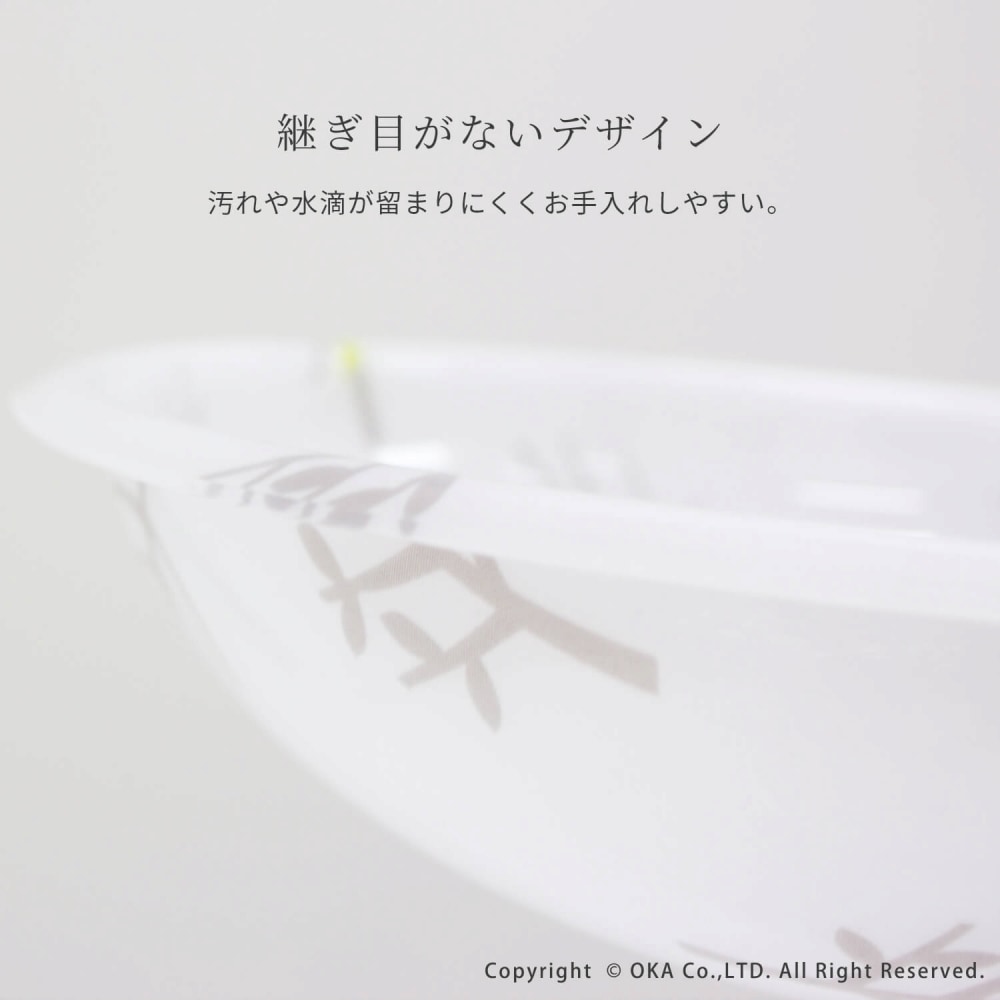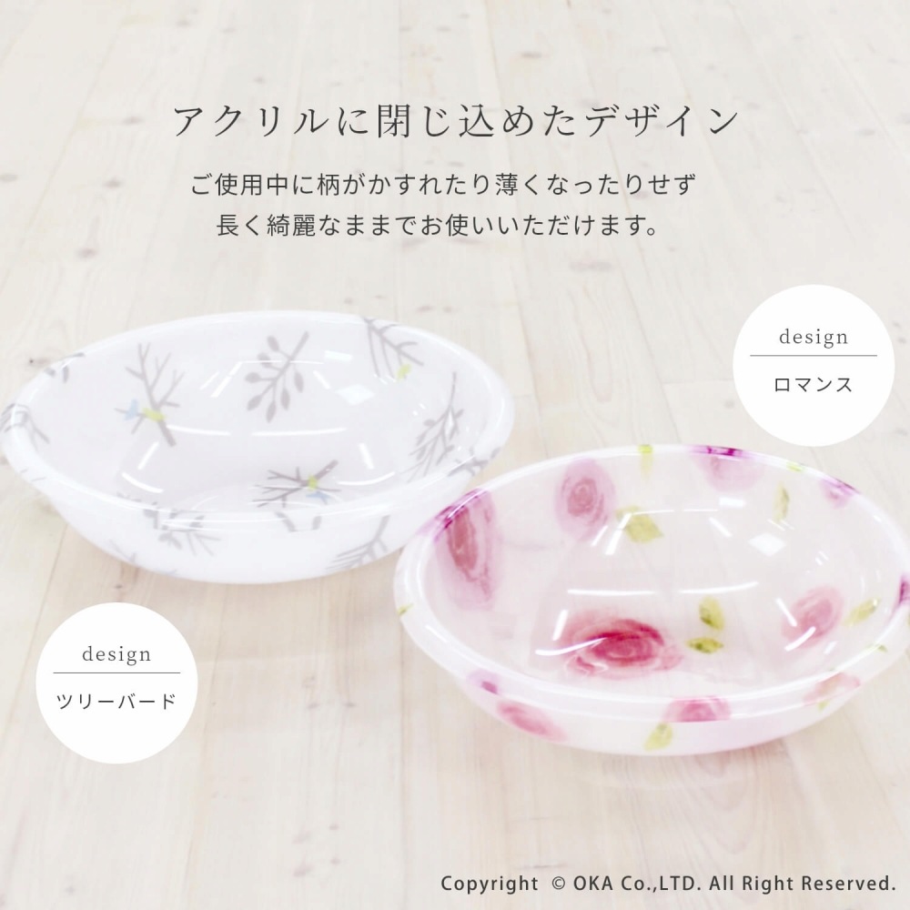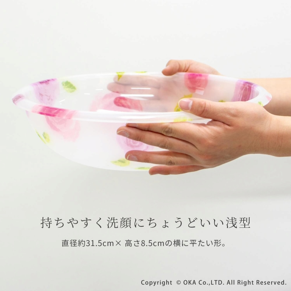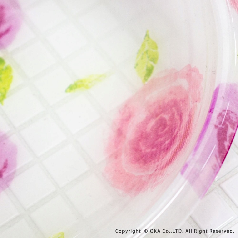 ハイグレードでリッチなこのウォッシュボウルは、透明度が高く壊れにくいアクリル樹脂を使用した継ぎ目のないウォッシュボウルです。バスチェアと同じく一枚の板から作られているのでカビや汚れなど細かい隙間に入り込むこともなく簡単に掃除できます。プラスチックとは違いアクリル樹脂なので少々重く感じますがたっぷりと水を汲み取ることができます。まわりがくるんとそっているのでつかみやすくなっています。女性が両手で持つと少し余るくらいの一般的な大きさ。直径約31cm× 高さ8.5cmの横に平たい形です。デザインは2タイプご用意しました。透明なアクリルにピンクのバラ模様が美しい「ロマンス」。 木にちょこんととまった鳥がかわいい「ツリーバード」です。 ※ギフトラッピング不可商品です。