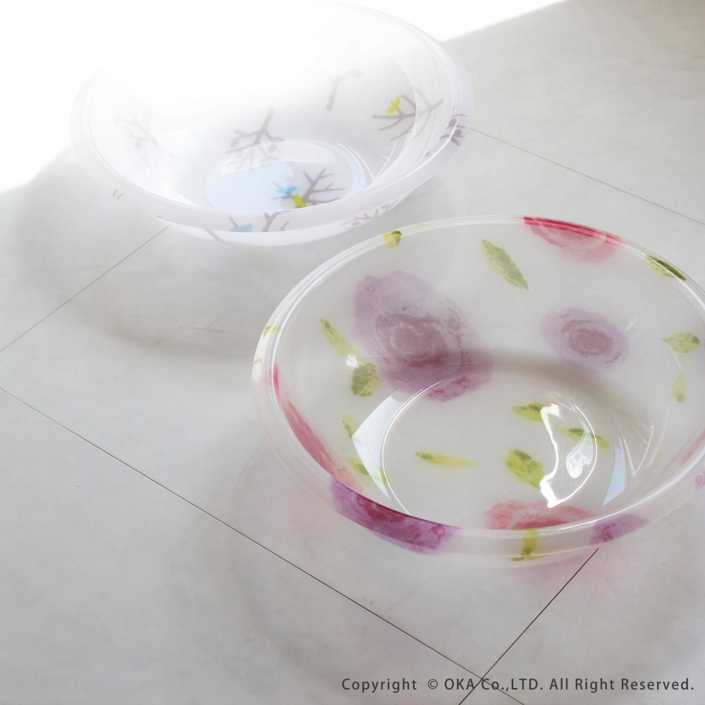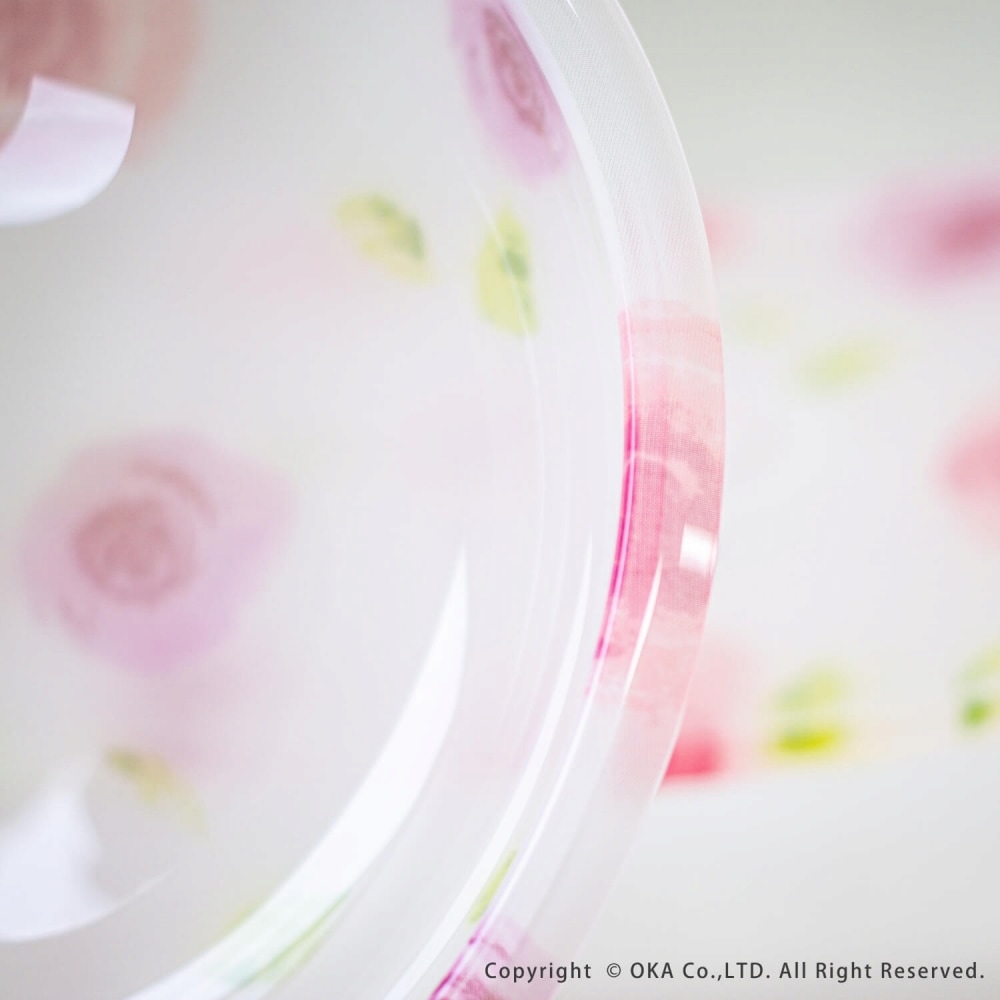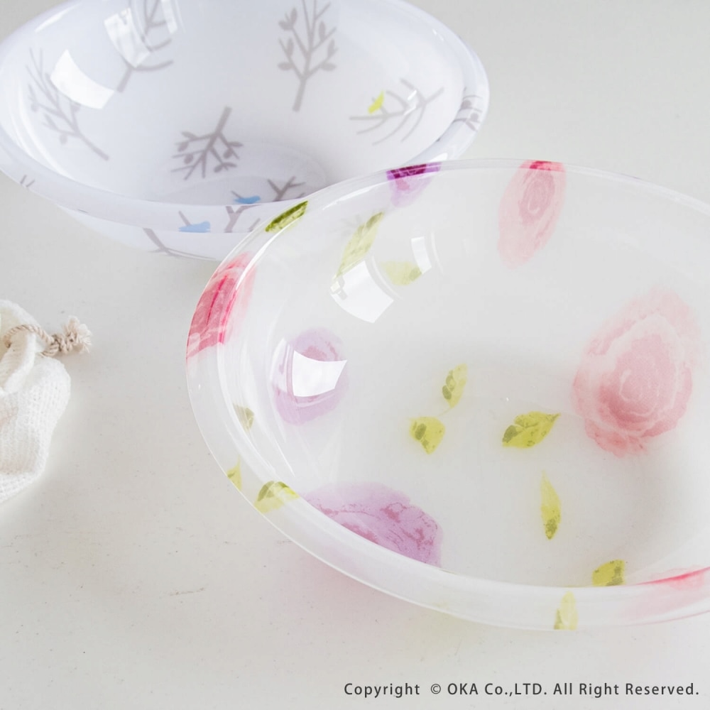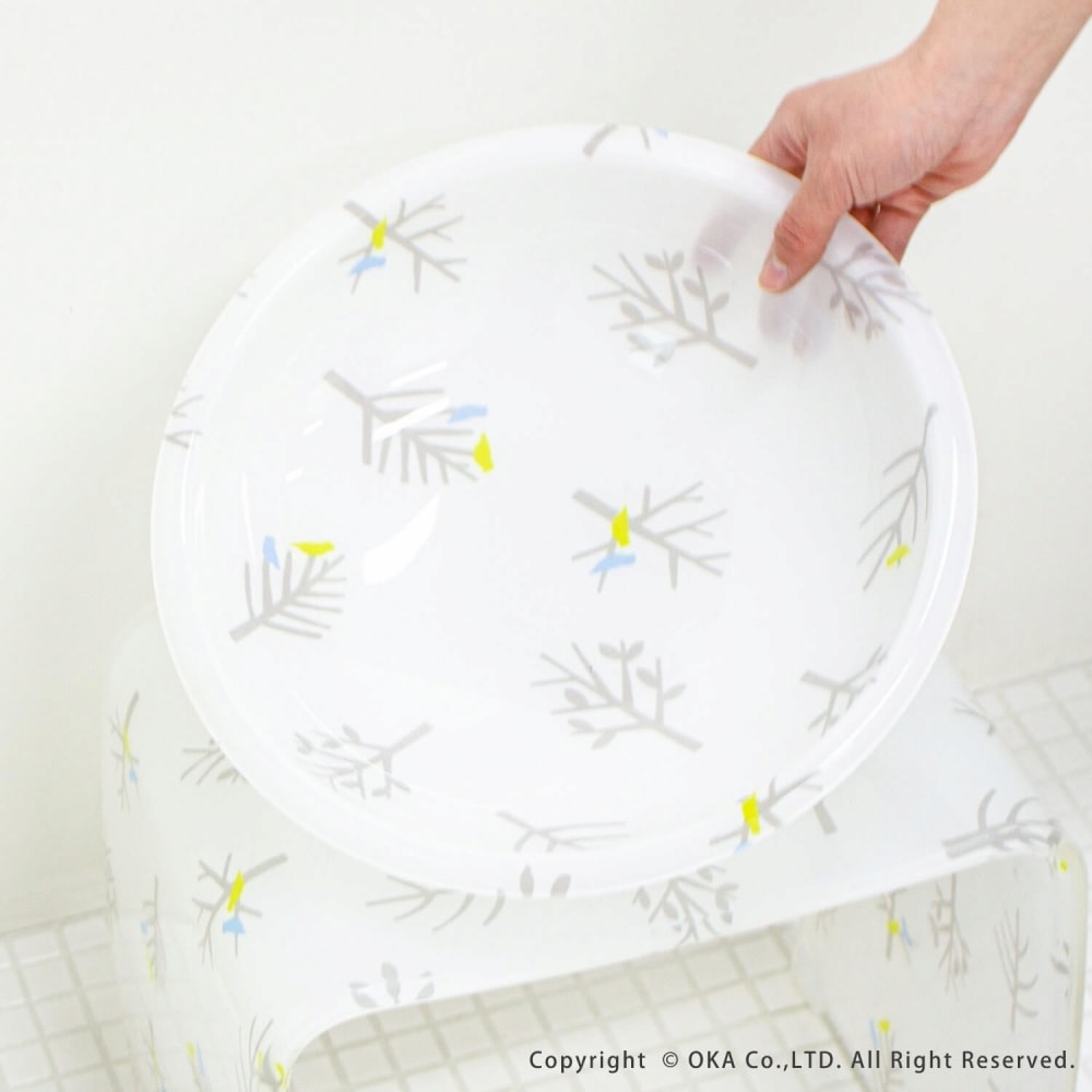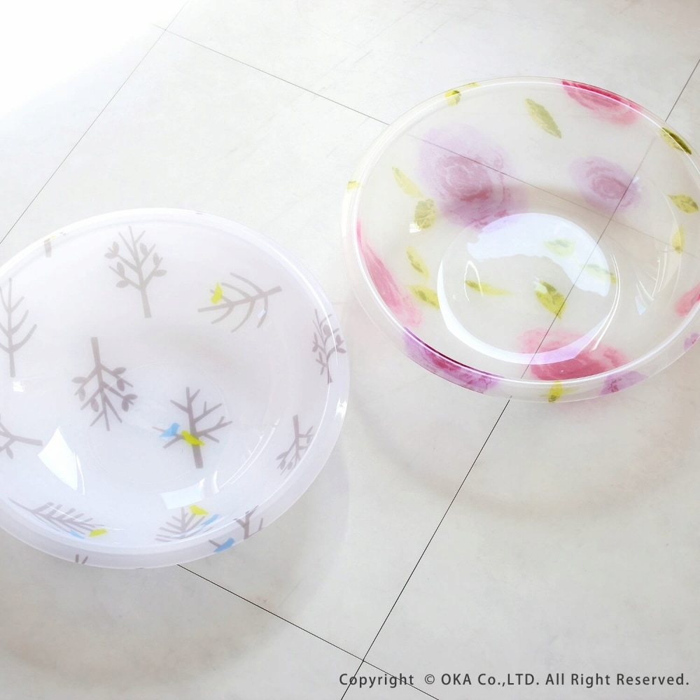 ハイグレードでリッチなこのウォッシュボウルは、透明度が高く壊れにくいアクリル樹脂を使用した継ぎ目のないウォッシュボウルです。バスチェアと同じく一枚の板から作られているのでカビや汚れなど細かい隙間に入り込むこともなく簡単に掃除できます。プラスチックとは違いアクリル樹脂なので少々重く感じますがたっぷりと水を汲み取ることができます。まわりがくるんとそっているのでつかみやすくなっています。女性が両手で持つと少し余るくらいの一般的な大きさ。直径約31cm× 高さ8.5cmの横に平たい形です。デザインは2タイプご用意しました。透明なアクリルにピンクのバラ模様が美しい「ロマンス」。 木にちょこんととまった鳥がかわいい「ツリーバード」です。 ※ギフトラッピング不可商品です。