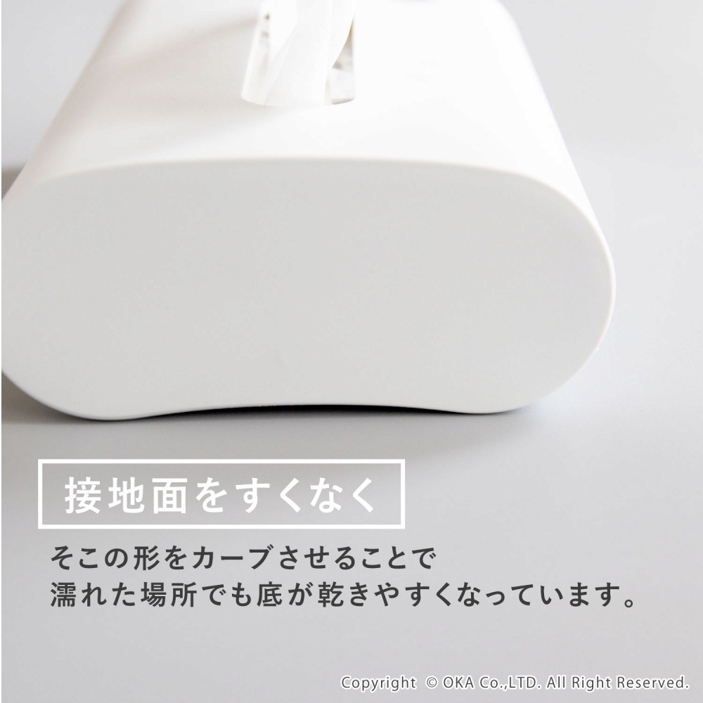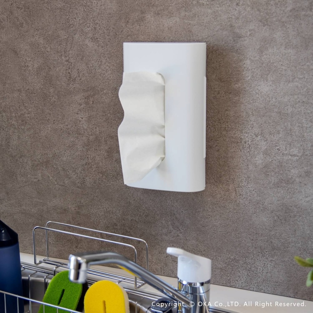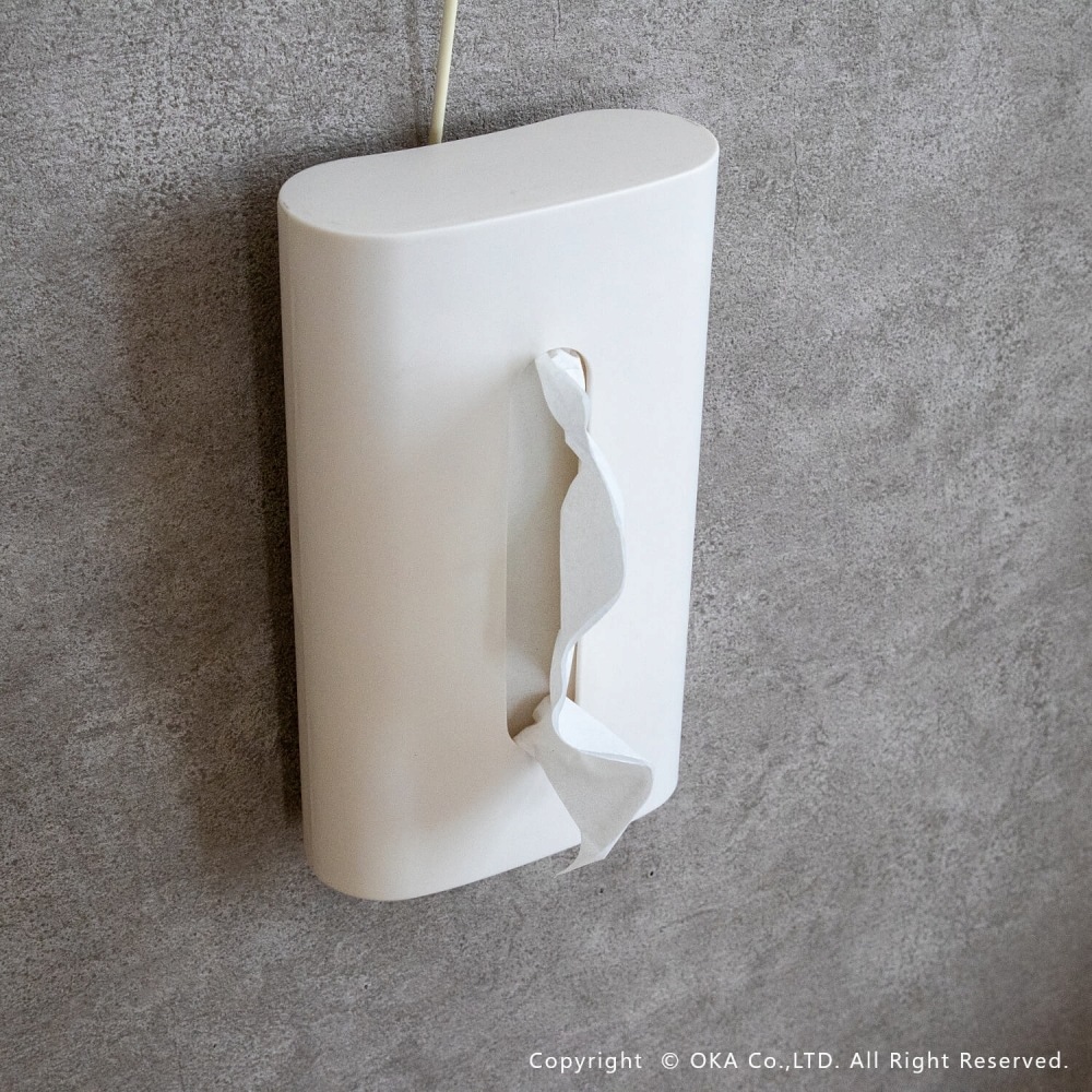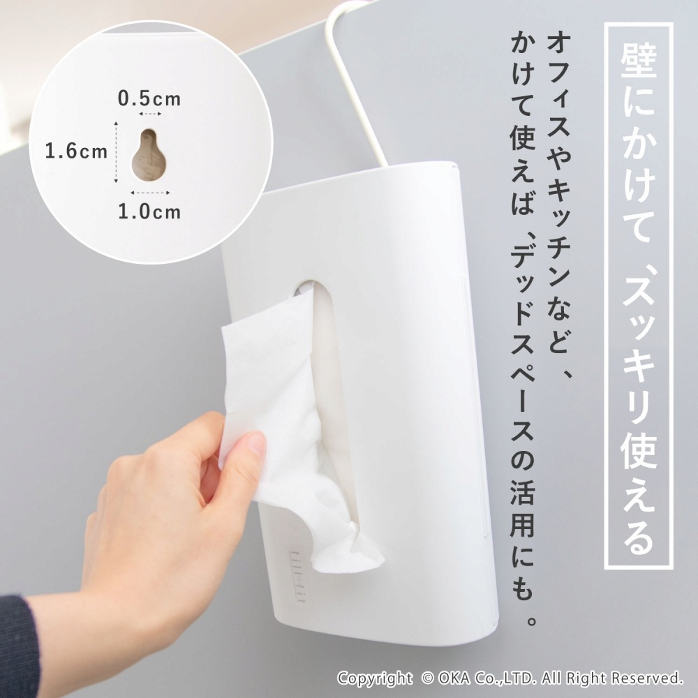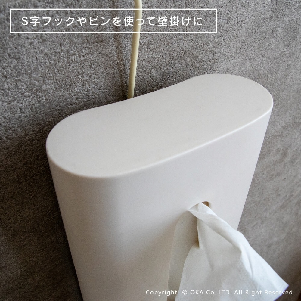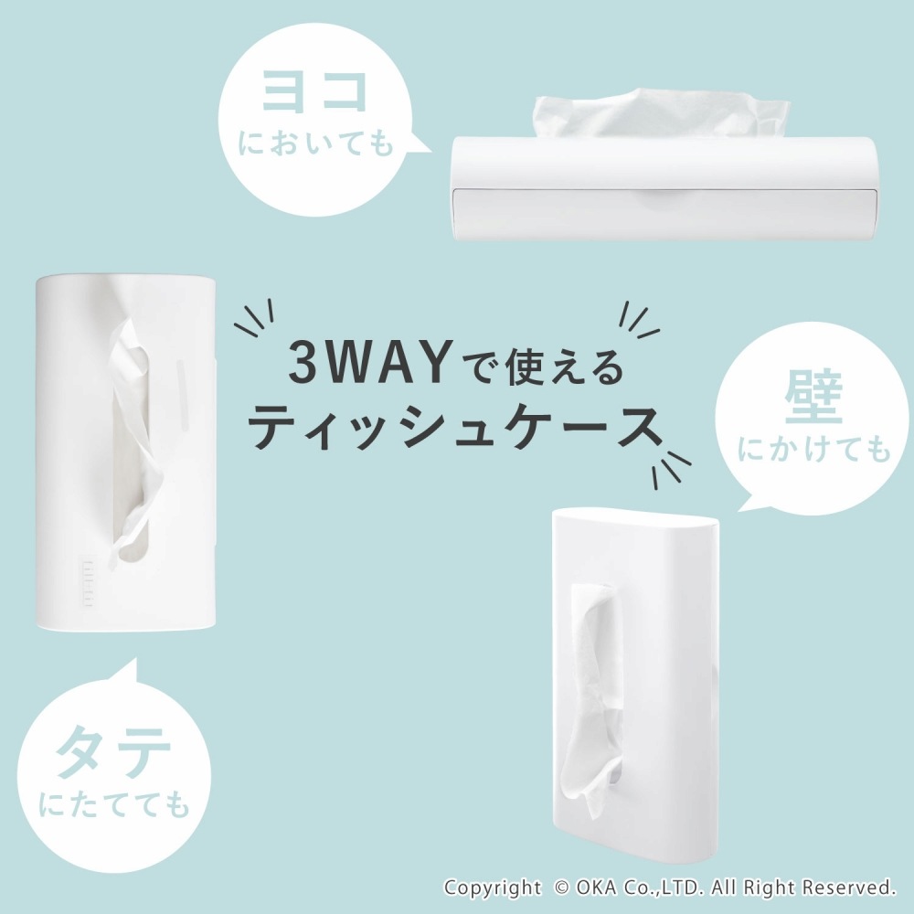 3WAYで使えるシンプルで使いやすいティッシュケース。ヨコにおいてもタテにおいても、かけても使えます。背面にフックをかけることのできる穴が一か所あいているのでフックにかけてご使用頂けます。ボックスティッシュ、袋入りティッシュ、ペーパータオルを入れてご使用ください。くっつぎすぎない底面にカーブがかかったかたちで水まわりにも置きやすい素材と接着面で清潔に保ちます。手が届きやすいデスク周りの壁にかけたりすることでちょっとした使い勝手のよさで毎日がもっと快適になります。