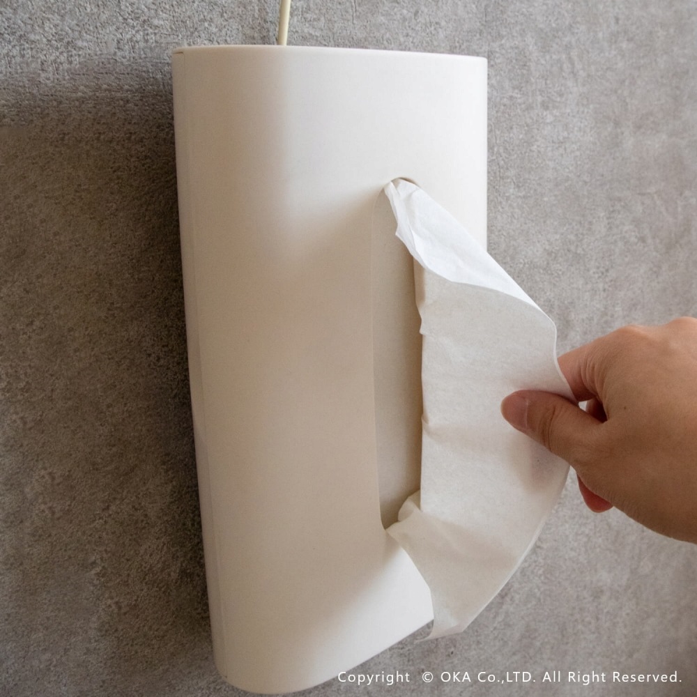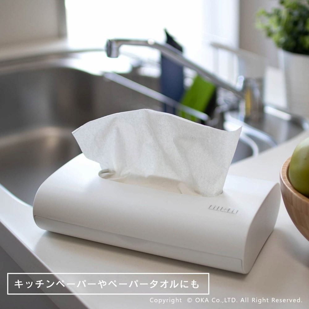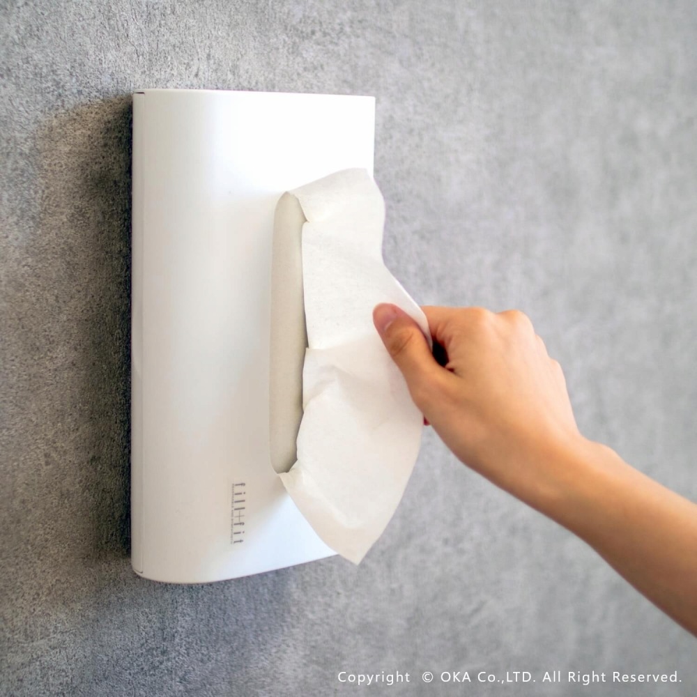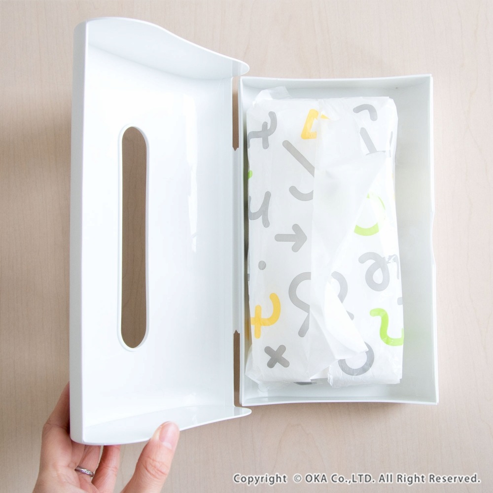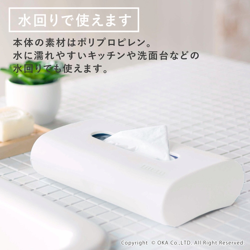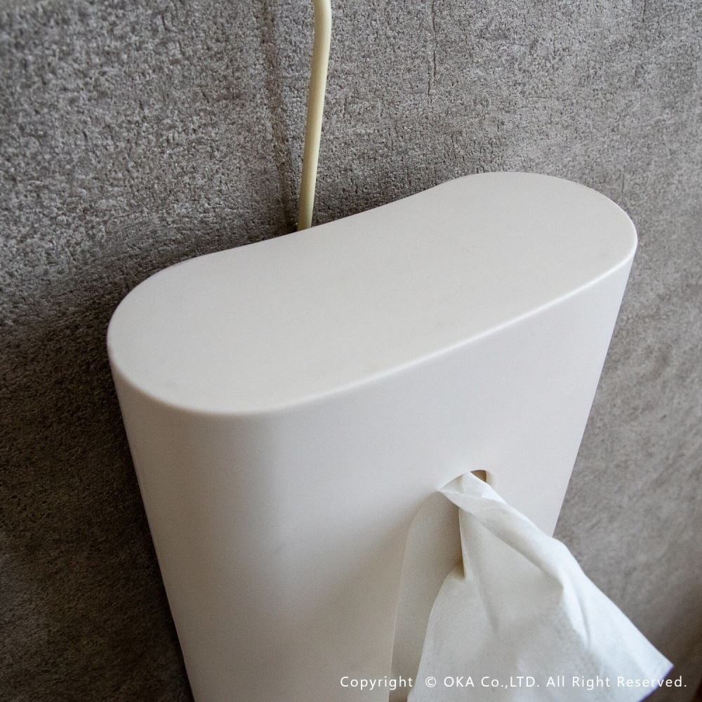 3WAYで使えるシンプルで使いやすいティッシュケース。ヨコにおいてもタテにおいても、かけても使えます。背面にフックをかけることのできる穴が一か所あいているのでフックにかけてご使用頂けます。ボックスティッシュ、袋入りティッシュ、ペーパータオルを入れてご使用ください。くっつぎすぎない底面にカーブがかかったかたちで水まわりにも置きやすい素材と接着面で清潔に保ちます。手が届きやすいデスク周りの壁にかけたりすることでちょっとした使い勝手のよさで毎日がもっと快適になります。