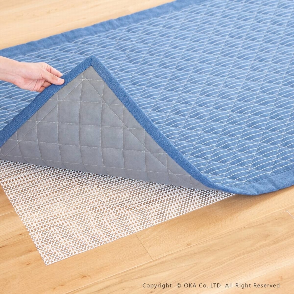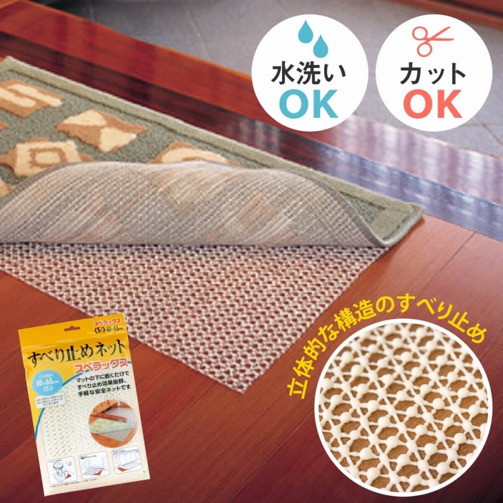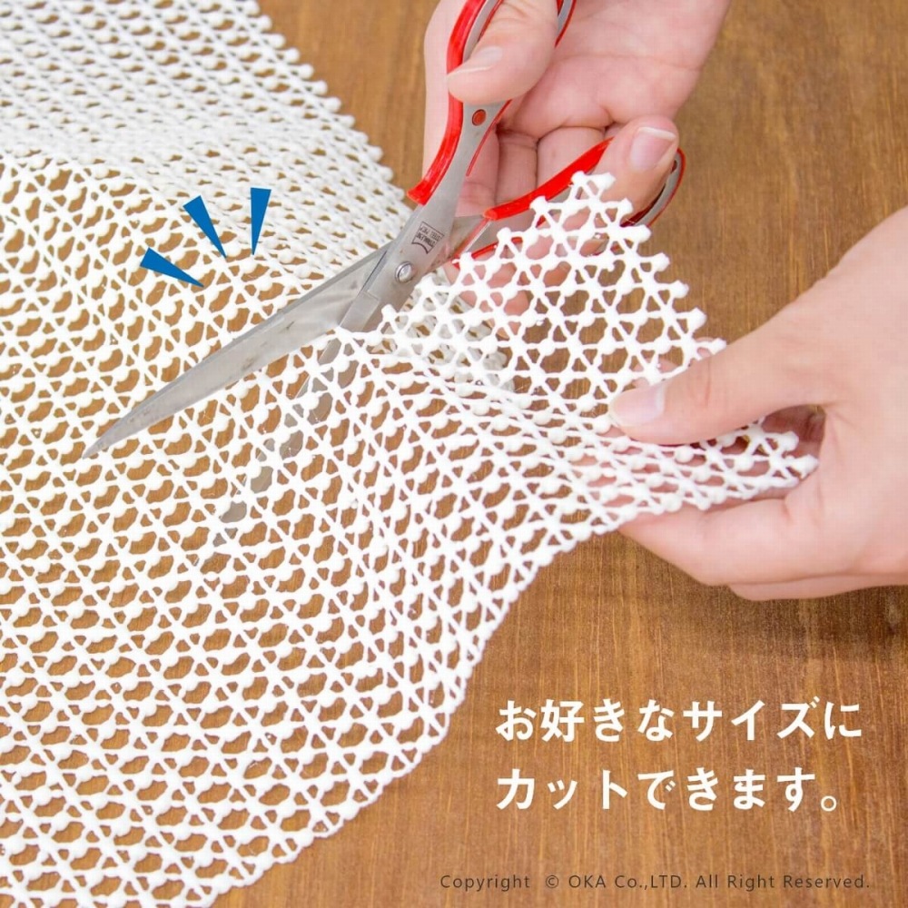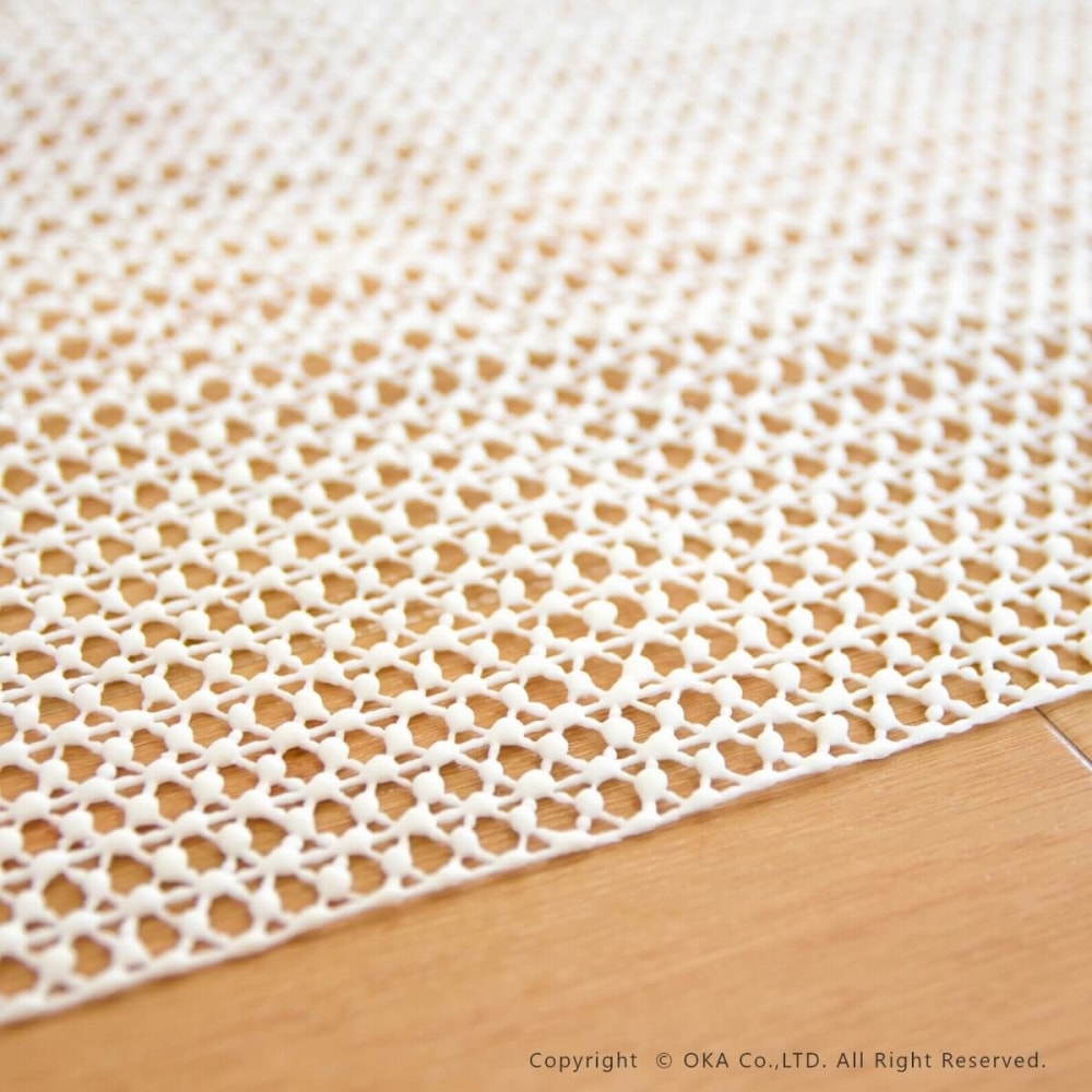 マットと床の間に敷くことによってズレや滑りを防止するすべり止めネットです。滑り止め加工されていないタオル地のマットや、人通りが多くてすぐにマットがずれてしまうような場面で活躍します。スペースに合わせてはさみで簡単にカット出来るので、いろんな場所にお使いいただけます。細かな網目が床とマットに吸着しズレを防止します。ネット自体が立体的な構造なのでどの方向の動きにも対応しており、ホコリや汚れで滑り止め効果が低下した際も水洗いして頂くことで効果が戻ります。玄関マットやラグの下に、手軽な安全ネットです。