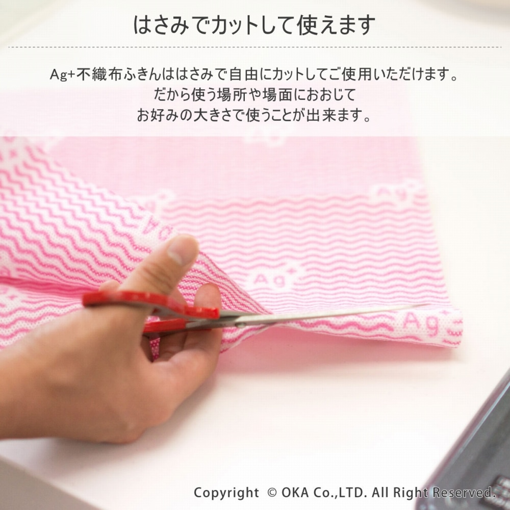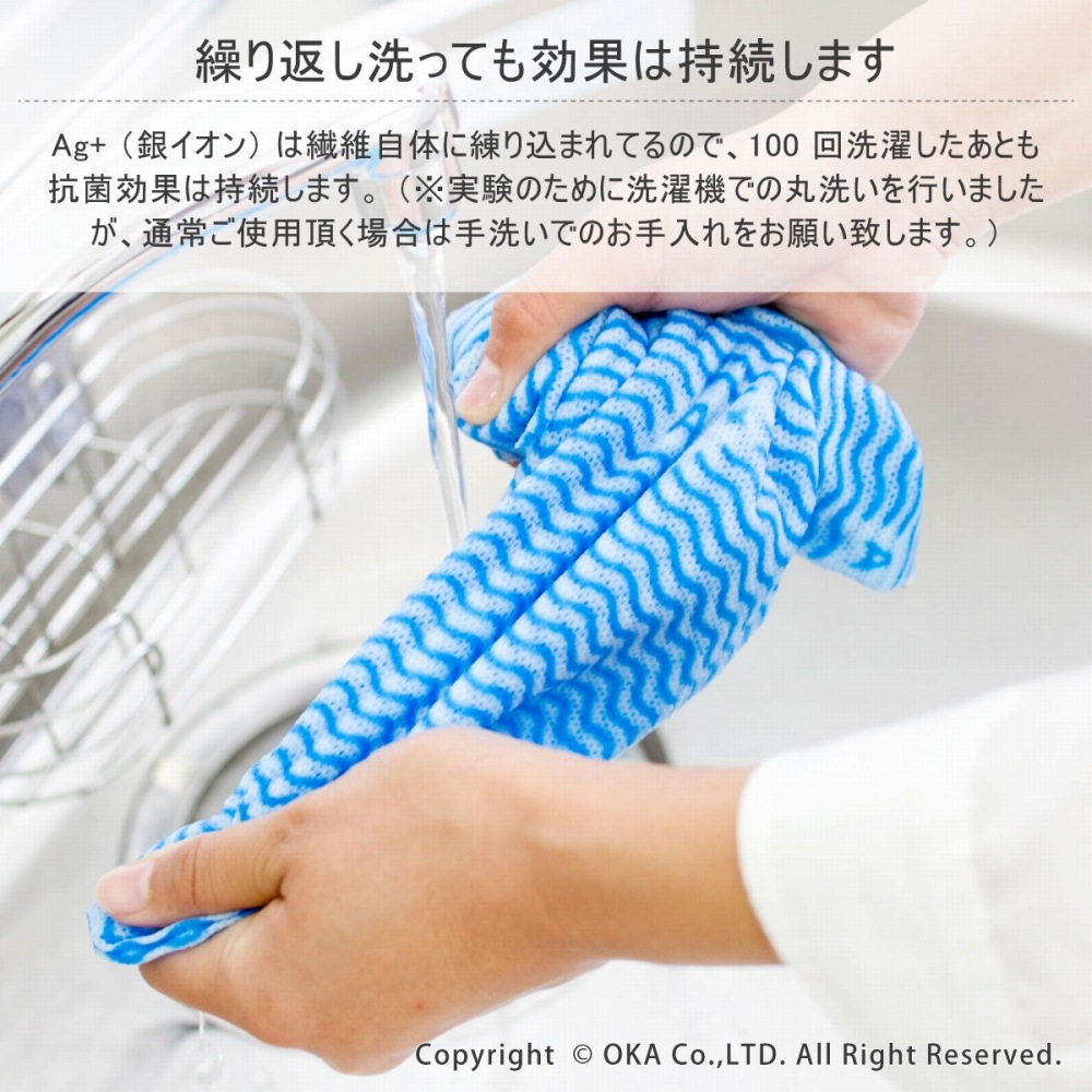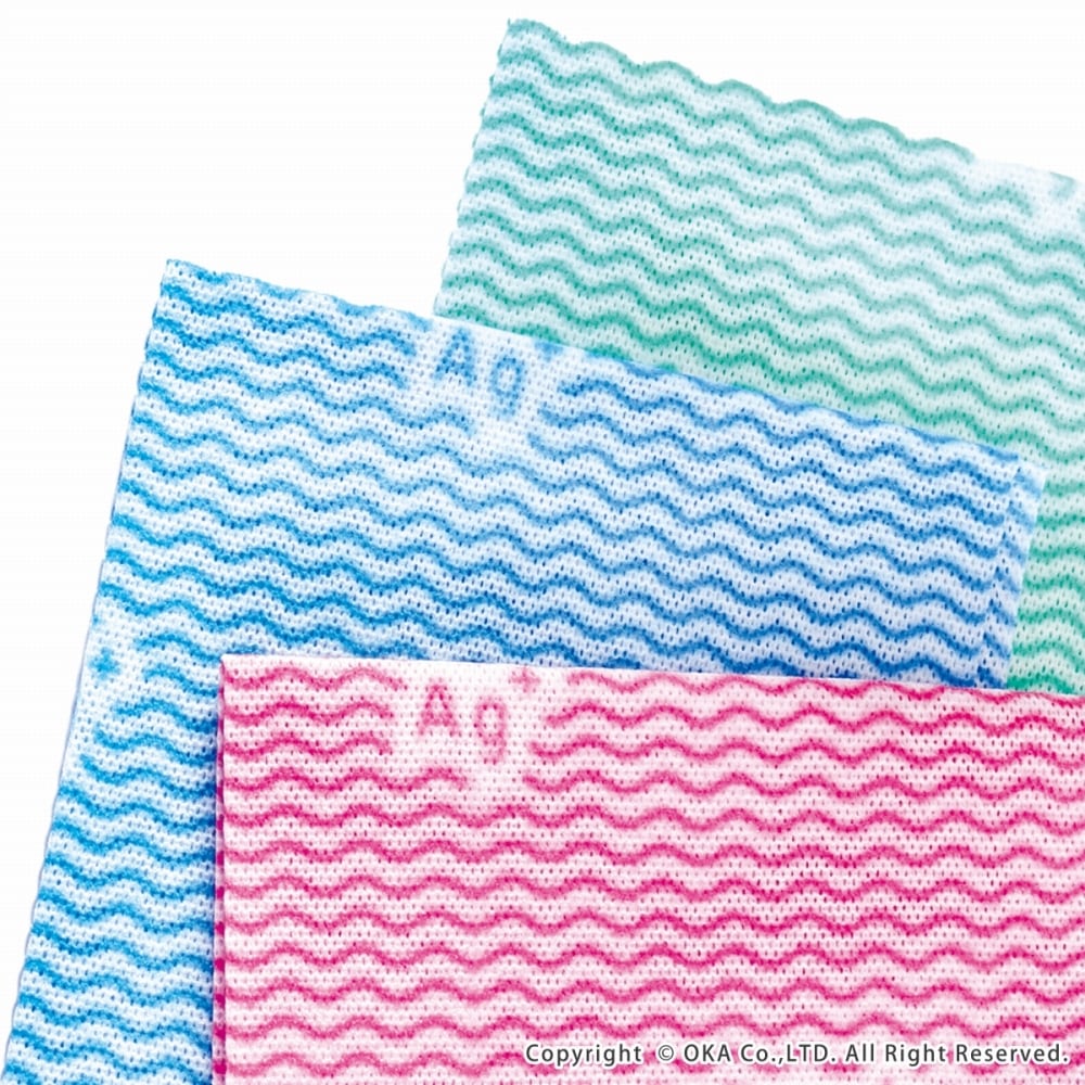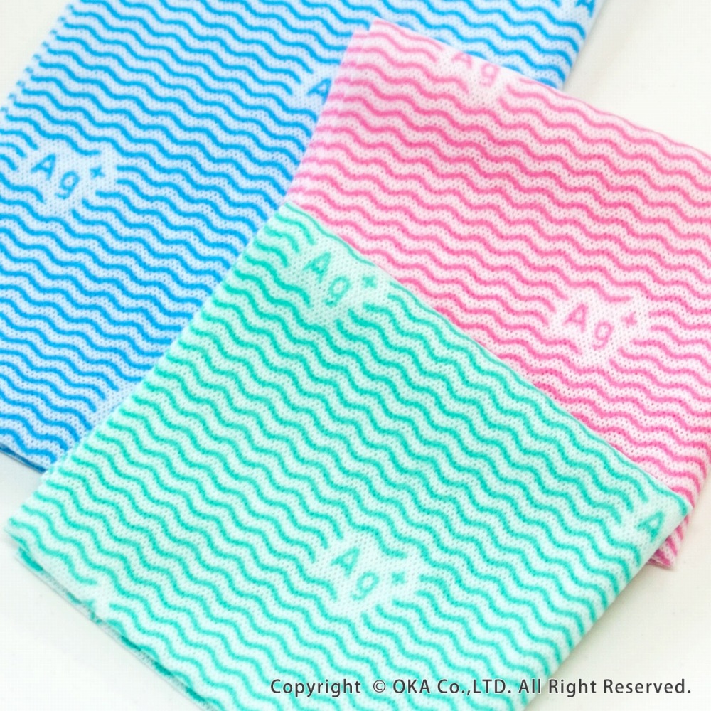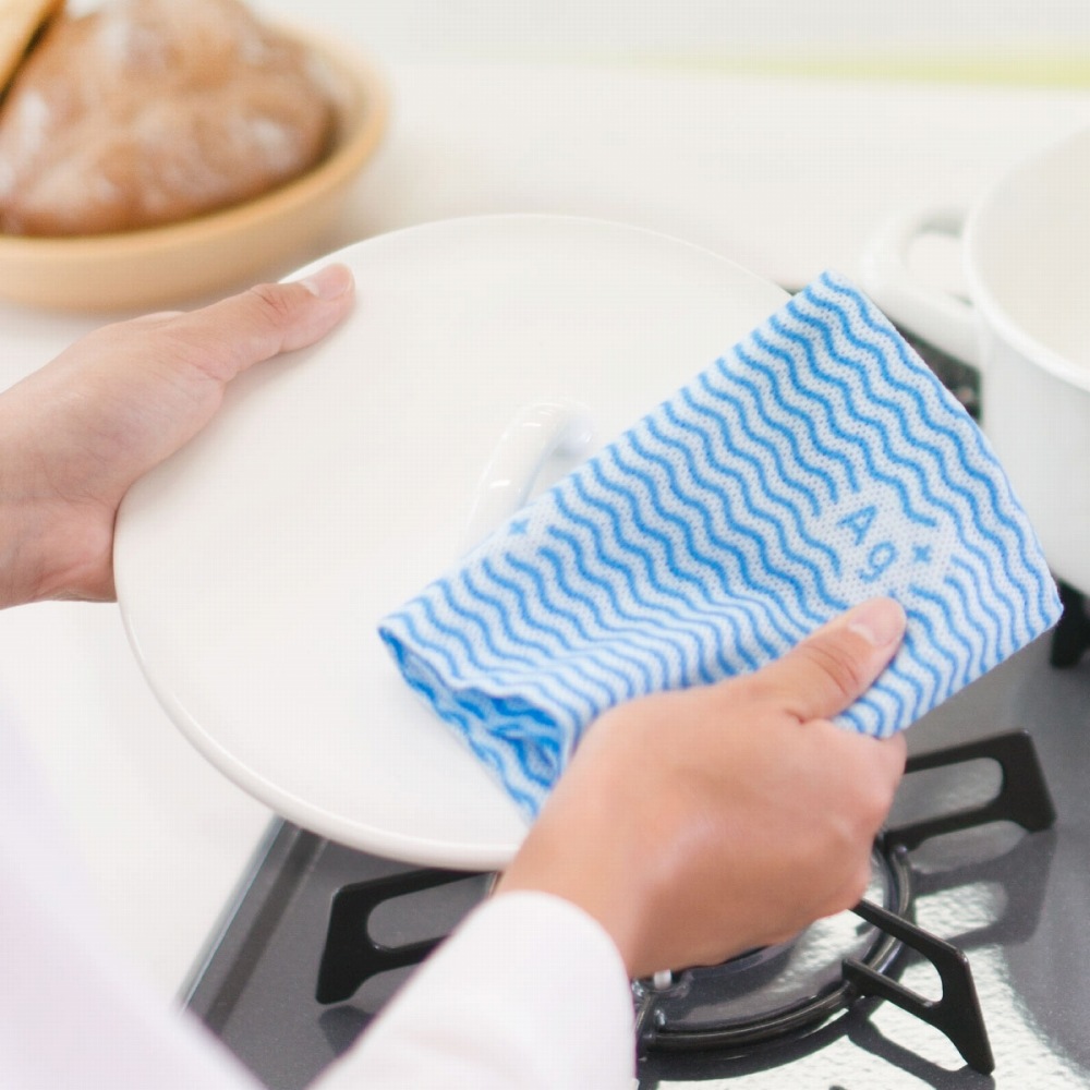 業務用でお馴染みの不織布ふきんに銀イオンを練り込みました。不織布なので乾きやすく、吸水性にも優れています。繊維自体に練り込まれたAg+(銀イオン)の抗菌効果は100回洗濯したあとにも持続します。テーブルや食器の水滴をあっという間に吸い取り、乾燥が早いので衛生的にお使いいただけます。毛羽が少ないのでグラスなどのお手入れにもぴったりです。使う場所や場面に応じて、ハサミでお好みの大きさに自由にカットできます。