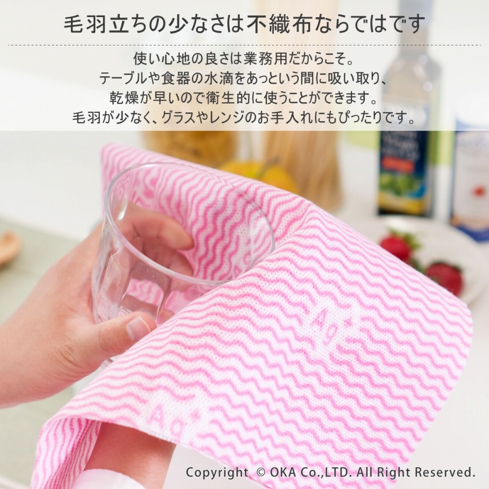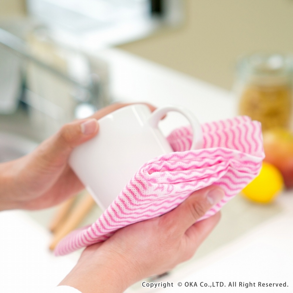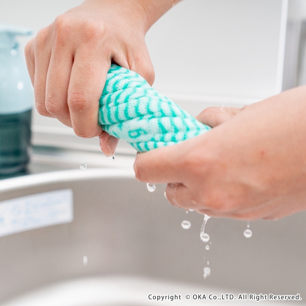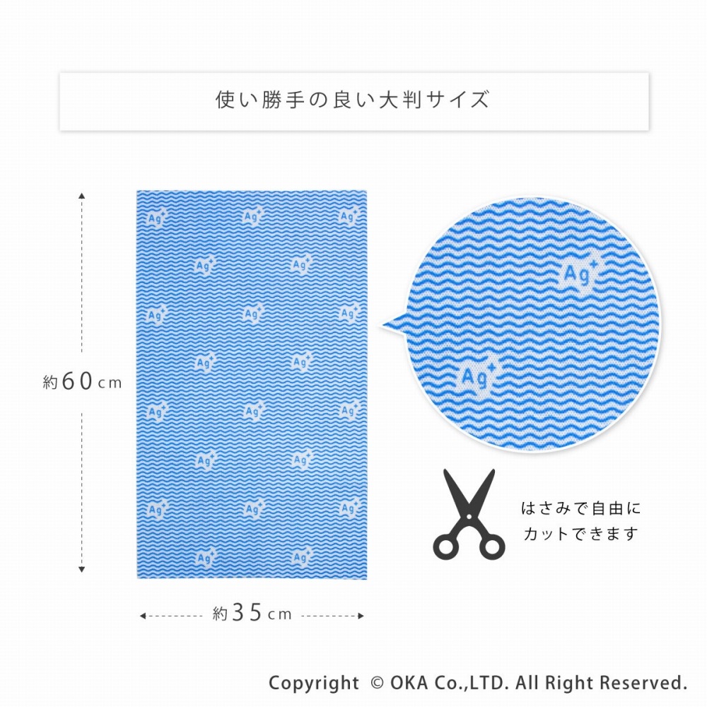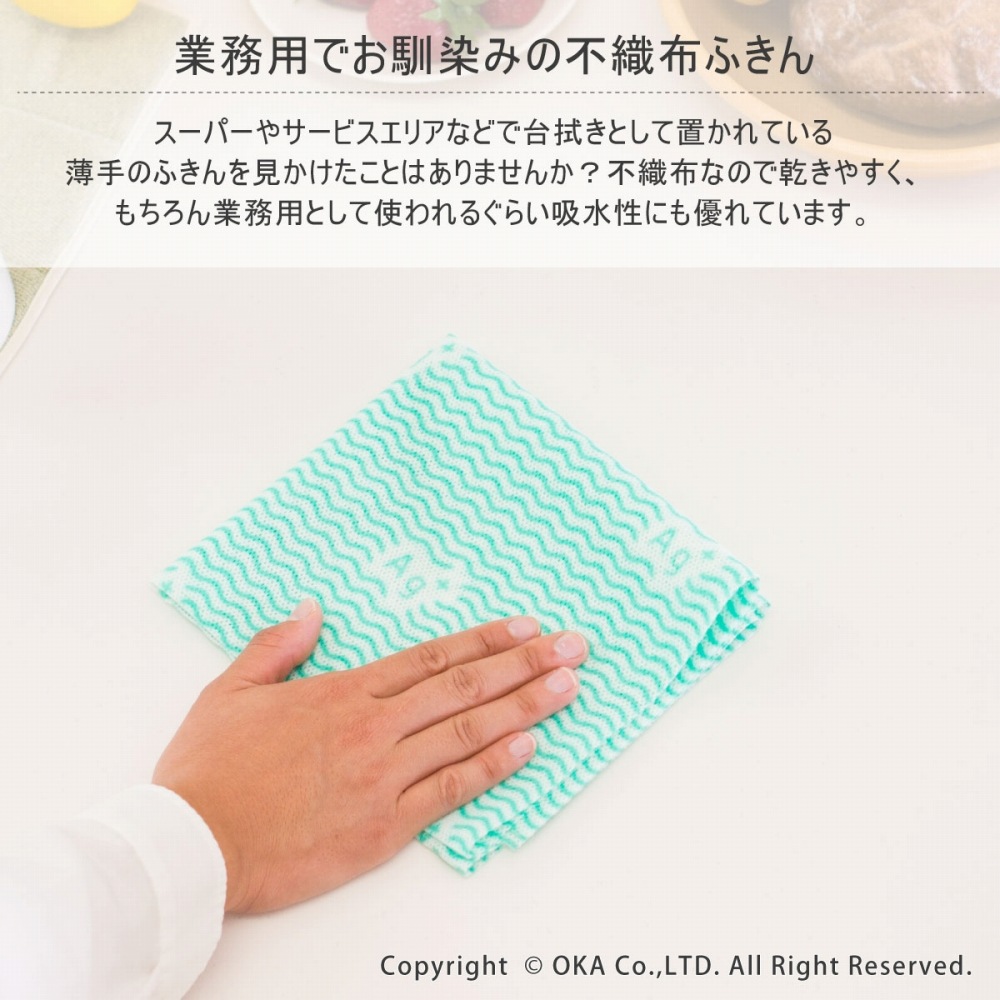業務用でお馴染みの不織布ふきんに銀イオンを練り込みました。不織布なので乾きやすく、吸水性にも優れています。繊維自体に練り込まれたAg+(銀イオン)の抗菌効果は100回洗濯したあとにも持続します。テーブルや食器の水滴をあっという間に吸い取り、乾燥が早いので衛生的にお使いいただけます。毛羽が少ないのでグラスなどのお手入れにもぴったりです。使う場所や場面に応じて、ハサミでお好みの大きさに自由にカットできます。
