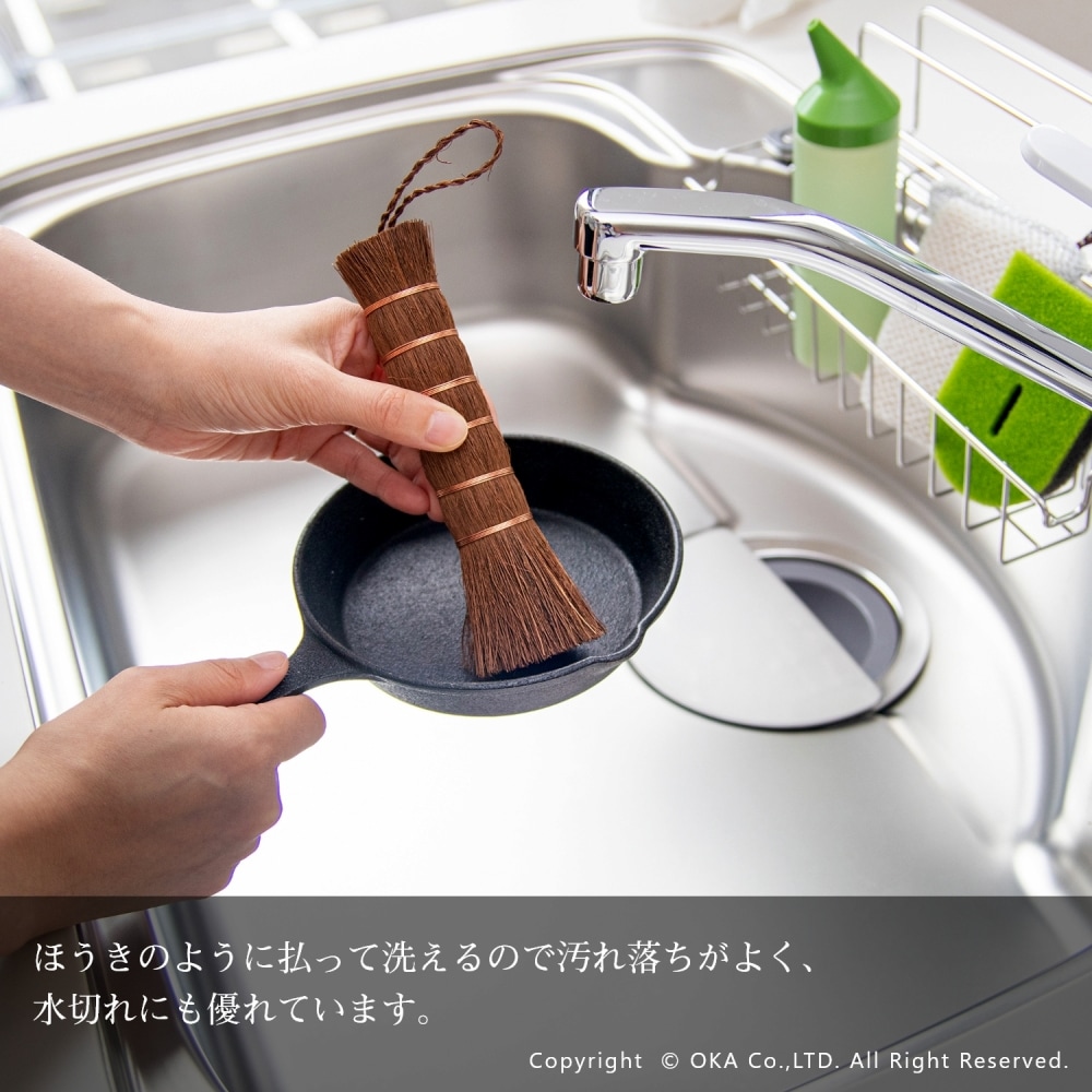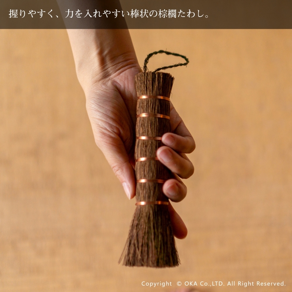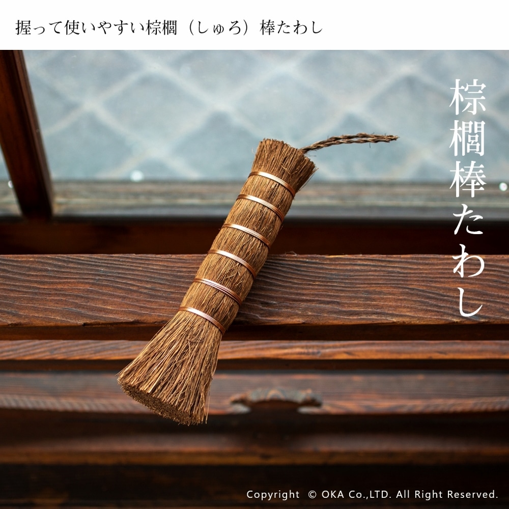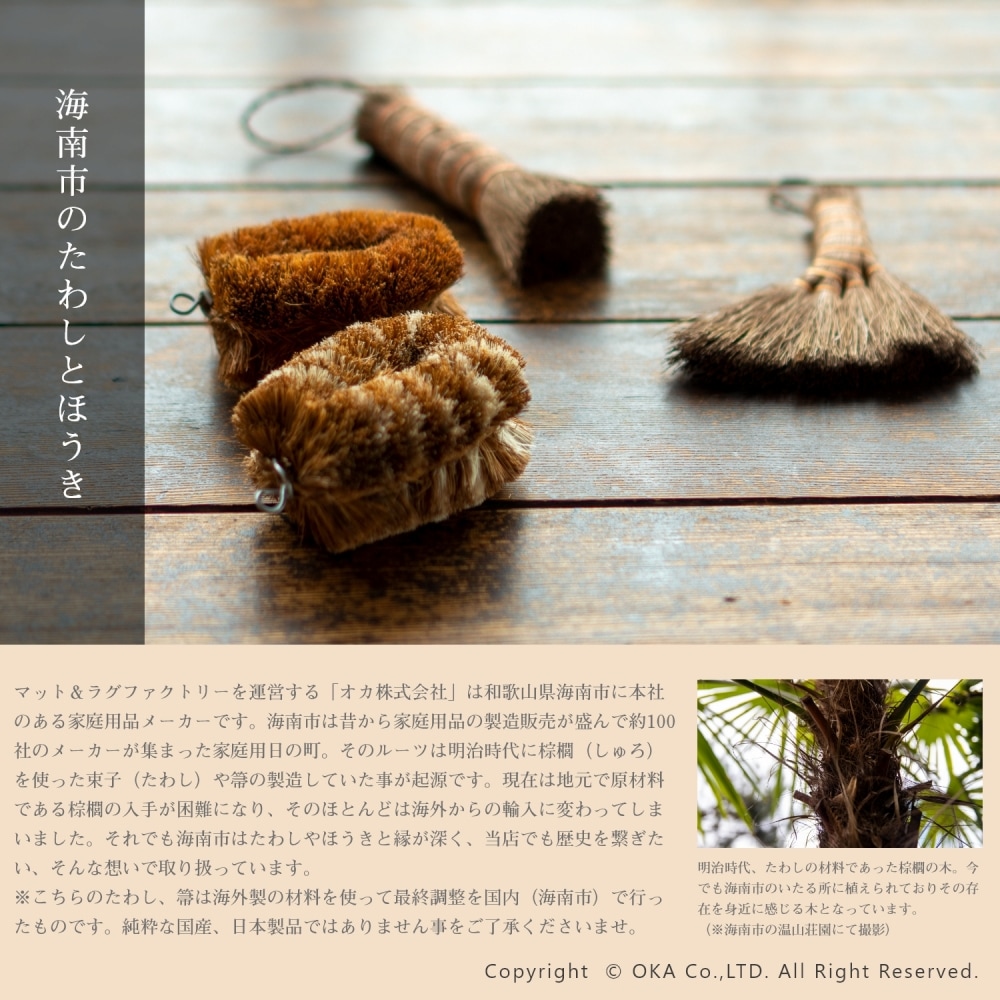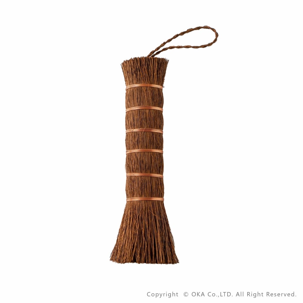 お掃除といえば、王道の束子(たわし)。握りやすく力を入れやすい棒状の棕櫚たわしです。ざるやせいろ、おろし金などのスポンジでは洗いにくい調理器具や鉄鍋のお手入れ、やかんの底洗い、食洗機に入れる前の予洗いにおすすめです。銅線が巻かれていて吊り下げ紐がついているので手に取りやすい場所においておけます。ほうきのように払って洗えるので汚れ落ちがよく水切れにも優れています。 当社オカ株式会社は和歌山県海南市に本社のある家庭用品メーカーです。海南市は昔から家庭用品の製造販売が盛んな地域でした。海南市はたわしやほうきの産地としても有名。当商品は海南市で最終調整をおこなっておりますが、原産国は国内ではございません。