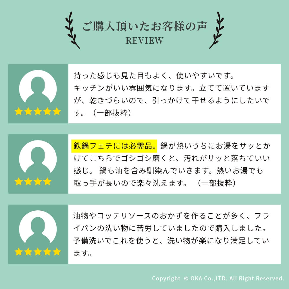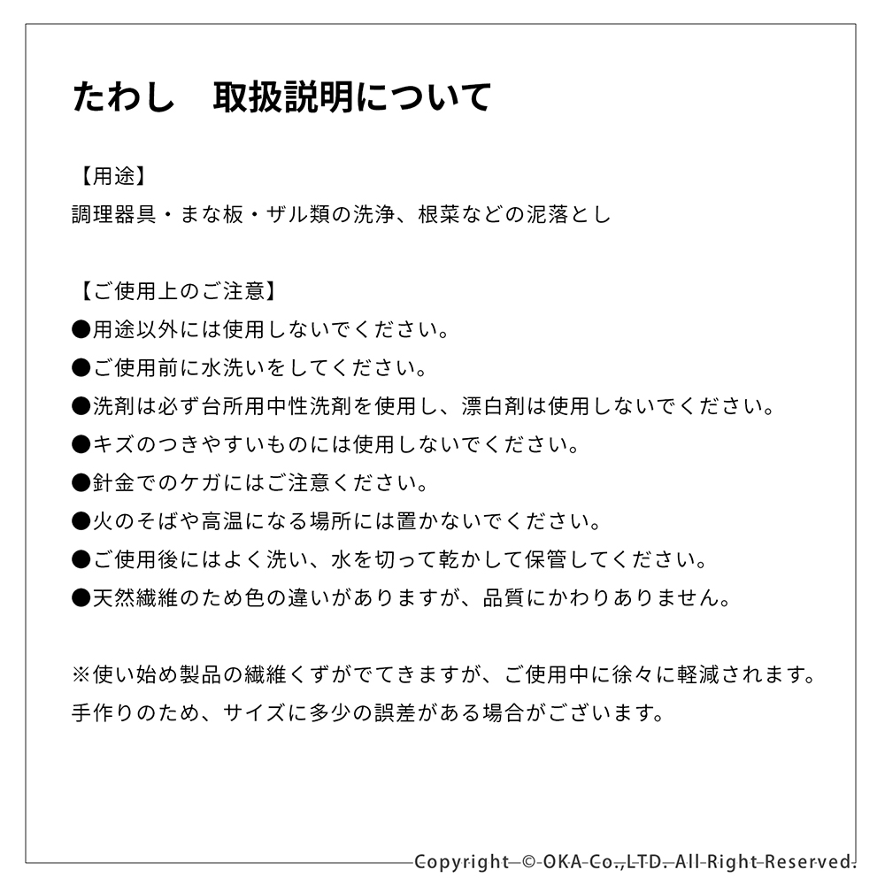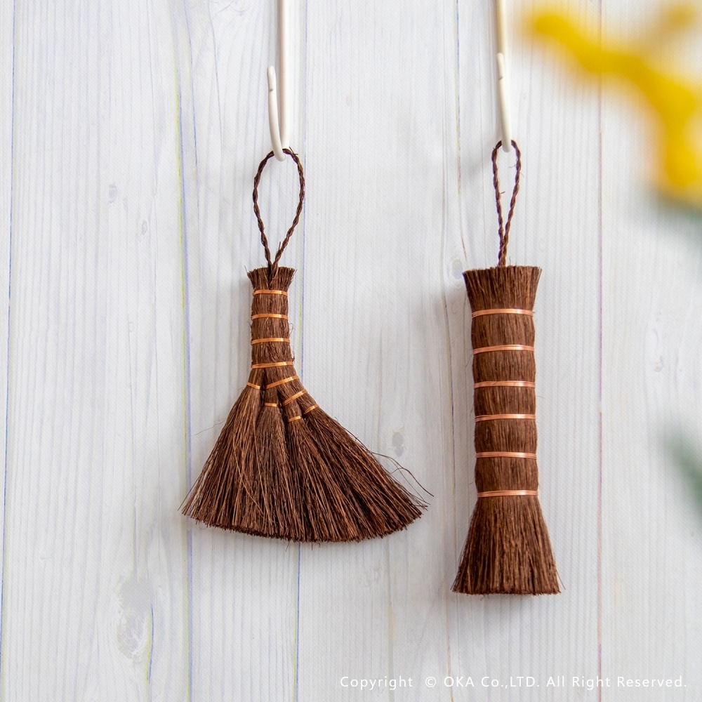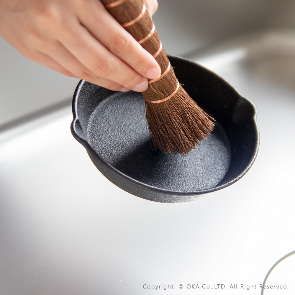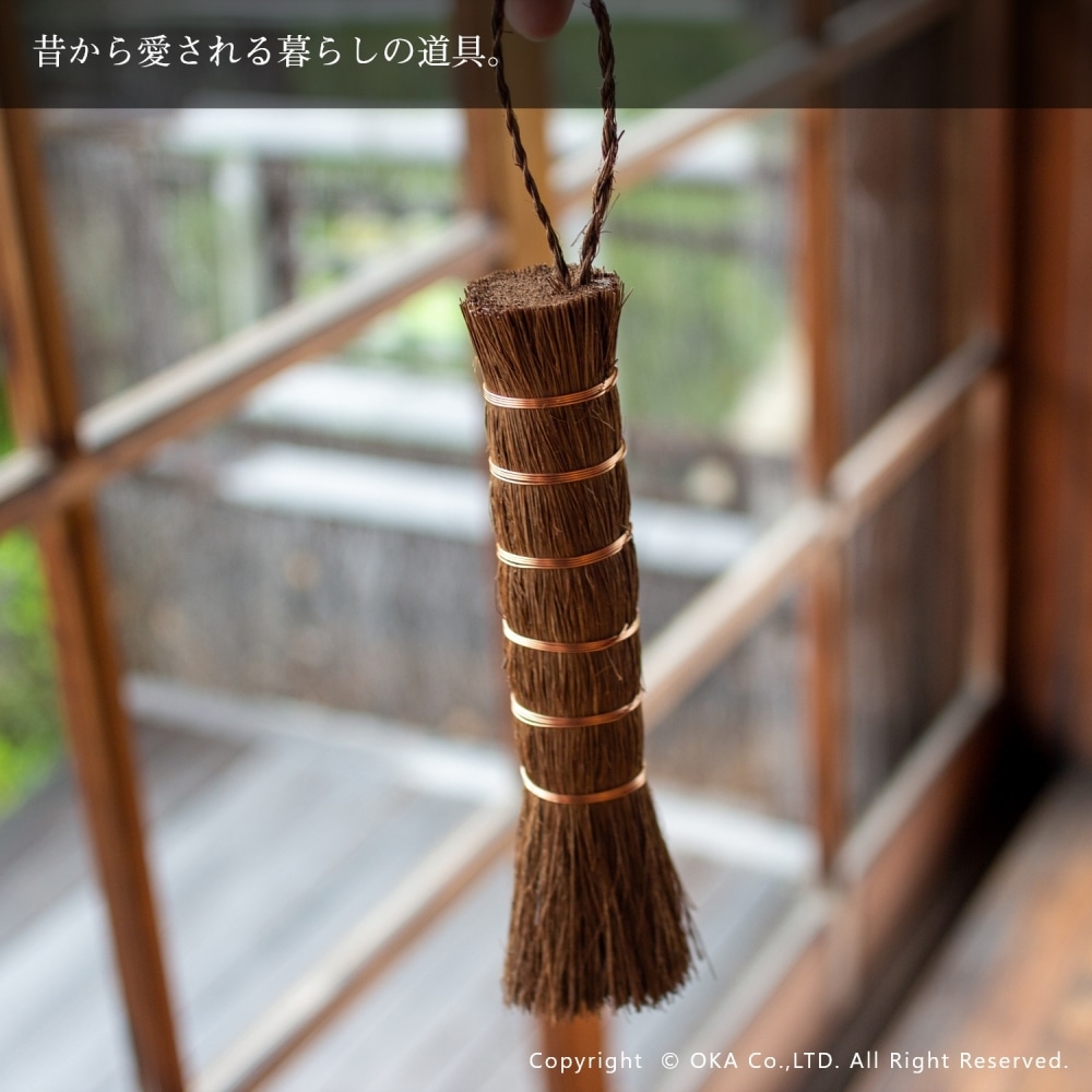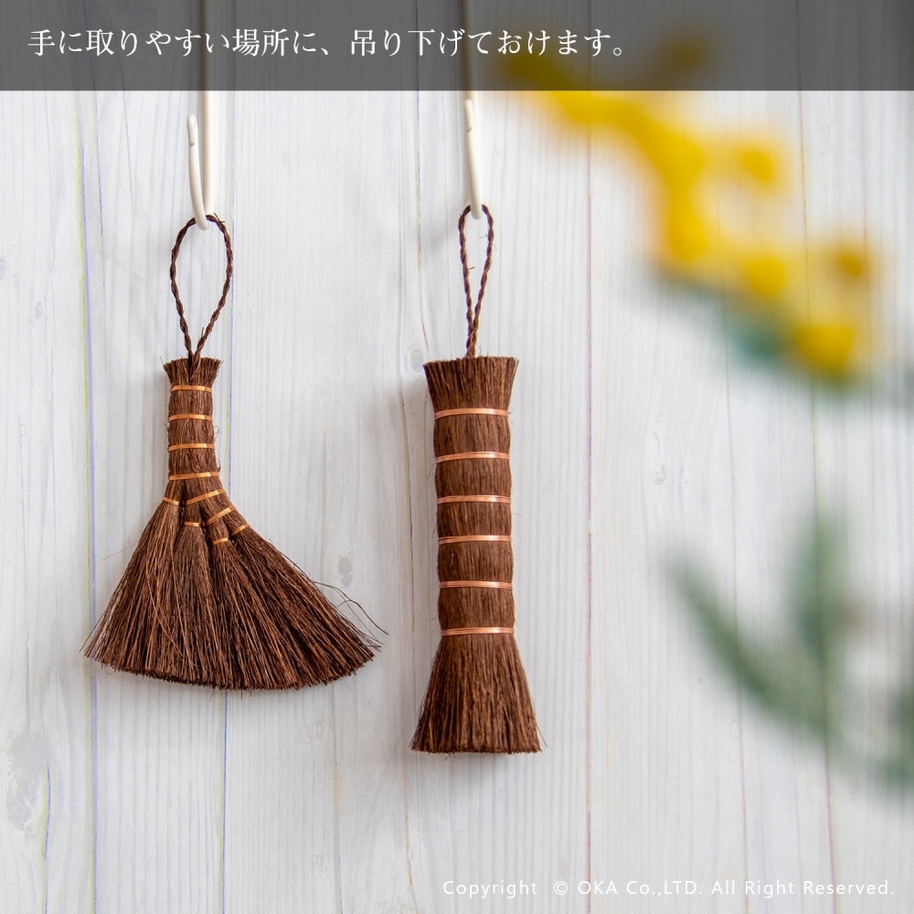 お掃除といえば、王道の束子(たわし)。握りやすく力を入れやすい棒状の棕櫚たわしです。ざるやせいろ、おろし金などのスポンジでは洗いにくい調理器具や鉄鍋のお手入れ、やかんの底洗い、食洗機に入れる前の予洗いにおすすめです。銅線が巻かれていて吊り下げ紐がついているので手に取りやすい場所においておけます。ほうきのように払って洗えるので汚れ落ちがよく水切れにも優れています。 当社オカ株式会社は和歌山県海南市に本社のある家庭用品メーカーです。海南市は昔から家庭用品の製造販売が盛んな地域でした。海南市はたわしやほうきの産地としても有名。当商品は海南市で最終調整をおこなっておりますが、原産国は国内ではございません。