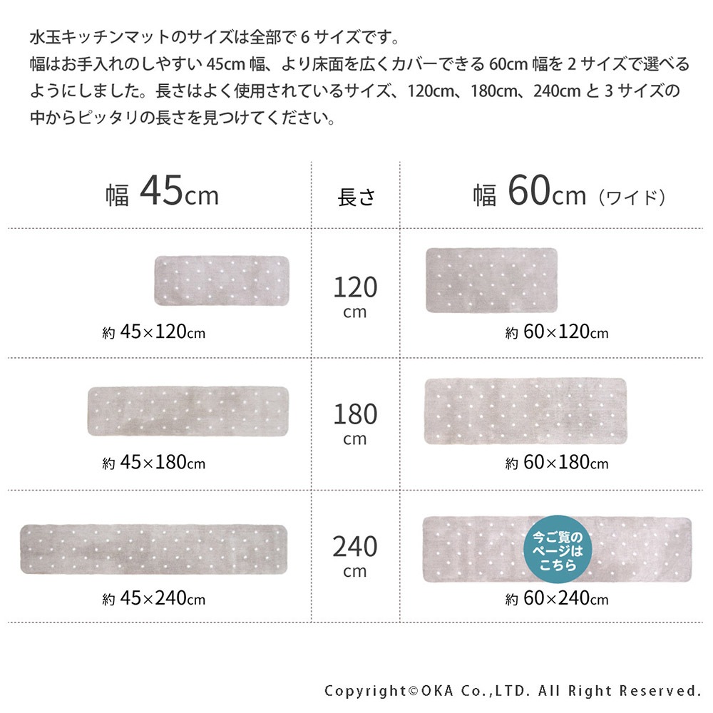 水玉キッチンマットのサイズは全部で6サイズです。 幅がお手入れのしやすい45cm幅、より床面を広くカバーできる60cm幅を2サイズで選べるようにしました。長さはよく使用されているサイズ、120cm、180cm、240cmと3サイズの中からピッタリの長さを見つけてください。それぞれのサイズをクリックすると詳細ページをご覧いただけます。