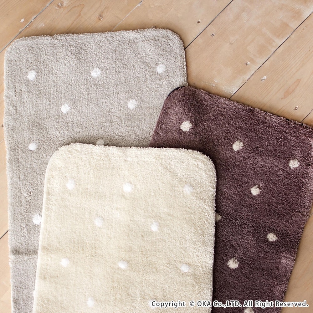 愛され続けている定番デザイン「水玉」をキッチンマットにした、マット&ラグファクトリーオリジナルのキッチンマットです。すべて1枚1枚丁寧にミシンで仕上げた手作りのキッチンマットです。1枚ずつミシンで縫製、仕上げることでどこかあたたかみが感じられるマットに。毛足の長さは少し長めに設定、しっかりと目が詰まったマットは弾力があり、クッション性も良好。 毎日の台所仕事も足元からしっかりとサポートします。ふかふかのキッチンマットはクッション性だけではなく、床から伝わる冷えも和らげてくれます。