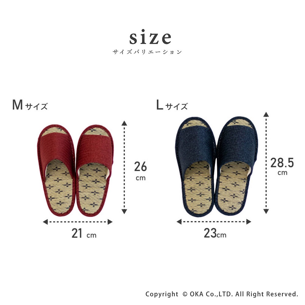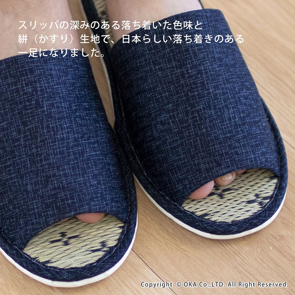 日本で愛され続けている「い草」で毎日がリラックス。良い香りで癒しの効果もあるい草。日本製の安心の品質スリッパです。スリッパの中敷きに使用しているのは「天然い草」です。い草は高温多湿の日本の風土にあった自然素材です。吸湿性、放湿性に優れ保温・断熱効果もあり年中快適に過ごすことができます。足の甲部分にはやさしいパイル生地を使用しています。スリッパの表生地には落ち着いた絣(かすり)生地を使用。日本らしい落ち着きのある一足になりました。サイズはお揃いで楽しめるMサイズとLサイズがございます。