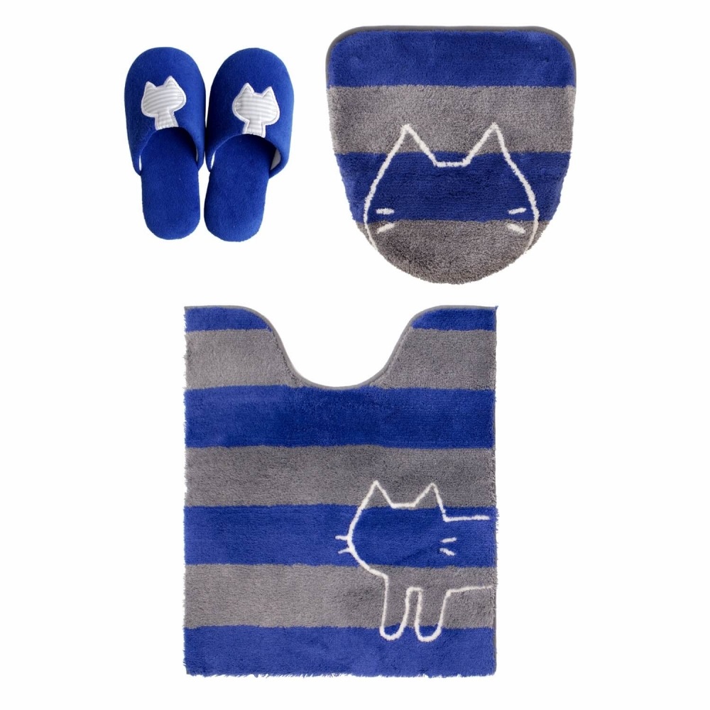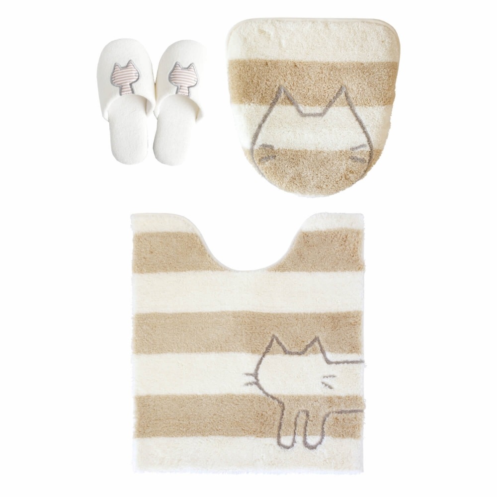うちねこトイレタリシリーズの3点セット。ふかふかマットにちょこんと猫が覗くほっこり可愛いトイレファブリックと洗えるスリッパでトイレ空間をコーディネート。
