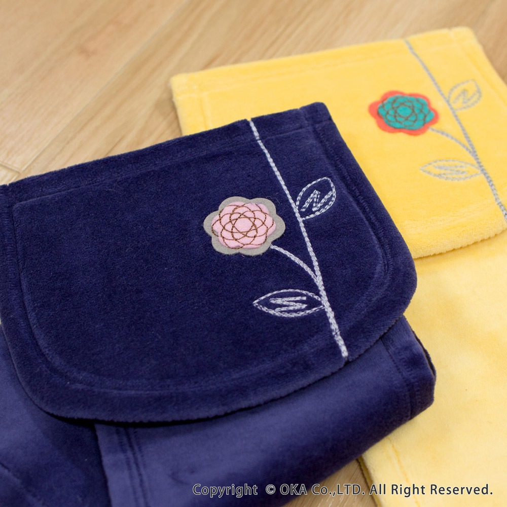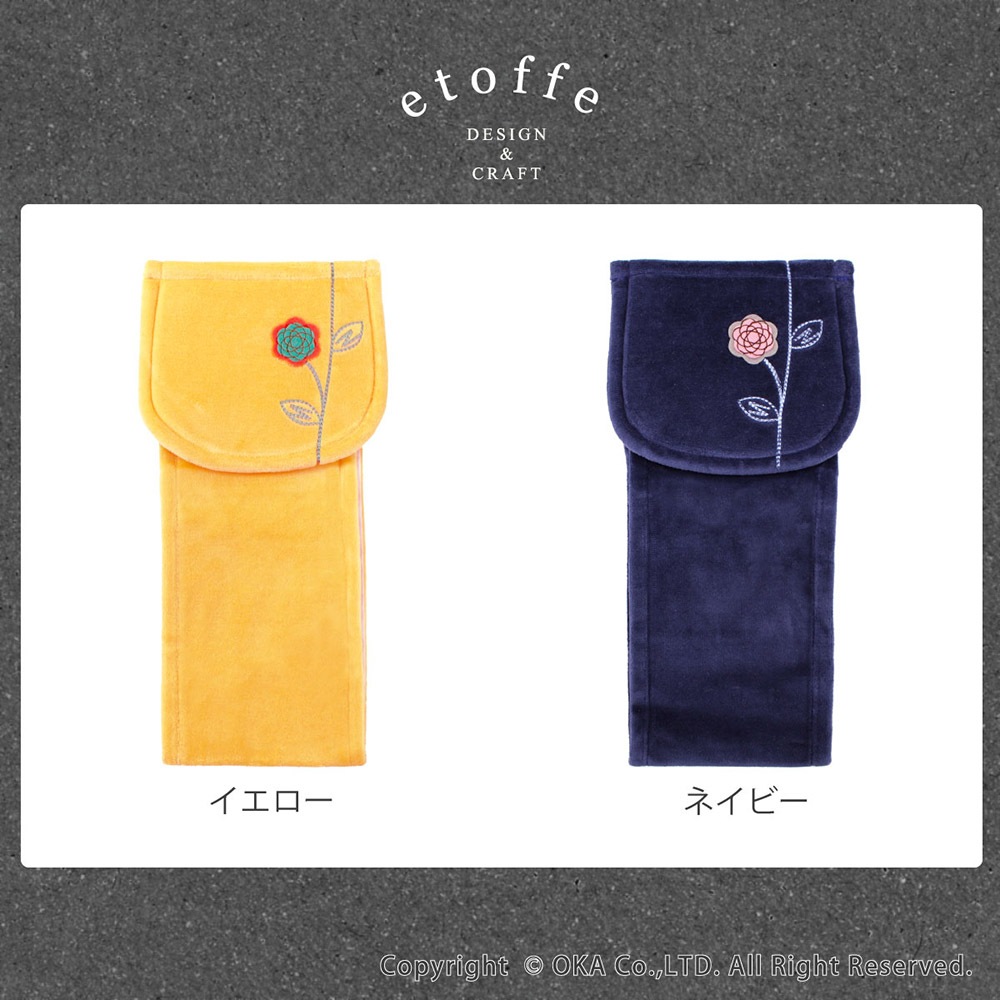 エトフのナチュラルさを忘れず、シンプルで少しモダンな北欧スタイルを提案します。ベースカラーは北欧の夜空をイメージした透明感のある濃紺と、待ちわびた春に咲く花を表現したあたたかでみずみずしいイエローをセレクト。エトフの特徴でもある2枚重ねにした刺繍モチーフの切り絵のお花は、前回のエトフよりも繊細な表現を目指し、色のコントラストにもこだわりました。ホルダーカバーにもマットや小物とお揃いのお花を刺繍し、カバーをベルベット風のやわらかな素材にすることで、使い心地のいいホルダーカバーになりました。