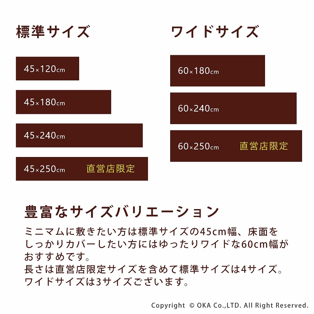 ミニマムに敷きたい方には標準サイズの45cm幅、床面をしっかりカバーしたい方にはゆったりワイドな60cm幅がおすすめです。