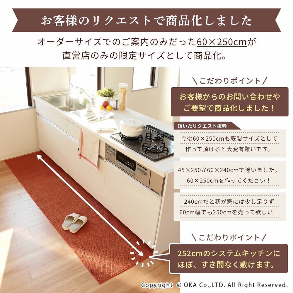システムキッチンの種類によっては最下部の引き出しと床面との隙間がわずか9mmというキッチンもありますが、厚さ6mmのキッチンマットならマットが隙間に挟まったり、ひっかかってマットがズレるという事なくスムーズに使って頂けます。