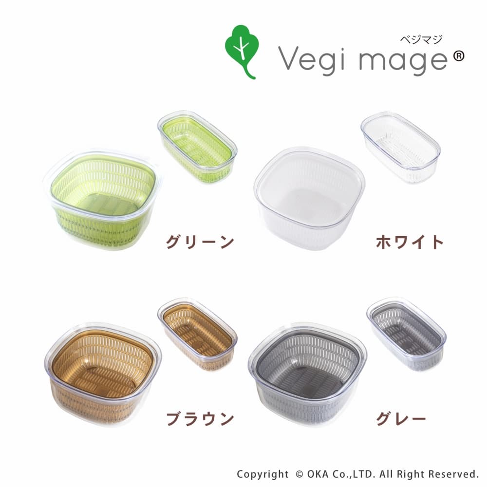 野菜を保存できるフタ付きの水切りざる、Vegi mage (ベジマジ)「あらう」。野菜をマネージメントする、新プロダクトシリーズのひとつ。今までよりらくに、おいしく野菜を食べて健康な生活を。毎日食べる野菜をもっとおいしく、楽しく食べるには?野菜をマネージメントしよう!という発想から「ベジマジ」シリーズが生まれました。手軽に食べたい生野菜のレタスやプチトマトなどを洗って水を切りそのまま保存できる保存容器です。フタと本体は透明にこだわり中身や鮮度が冷蔵庫に入ったままでもすぐにわかるようになっています。ざるは水が切れやすい構造で保存中に野菜から落ちる水分も切ります。容器はそのまま食卓にも出せるデザインになっています。