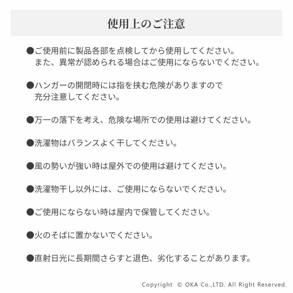 - ●ご使用前に製品各部を点検してから使用してください。また、異常が認められる場合はご使用にならないでください。●ハンガーの開閉時には指を挟む危険がありますので充分注意してください。●万一の落下を考え、危険な場所での使用は避けてください。●洗濯物はバランスよく干してください。●風の勢いが強い時は屋外での使用は避けてください。●洗濯物干し以外には、ご使用にならないでください。●ご使用にならない時は屋内で保管してください。●火のそばに置かないでください。●直射日光に長期間さらすと退色、劣化することがあります。