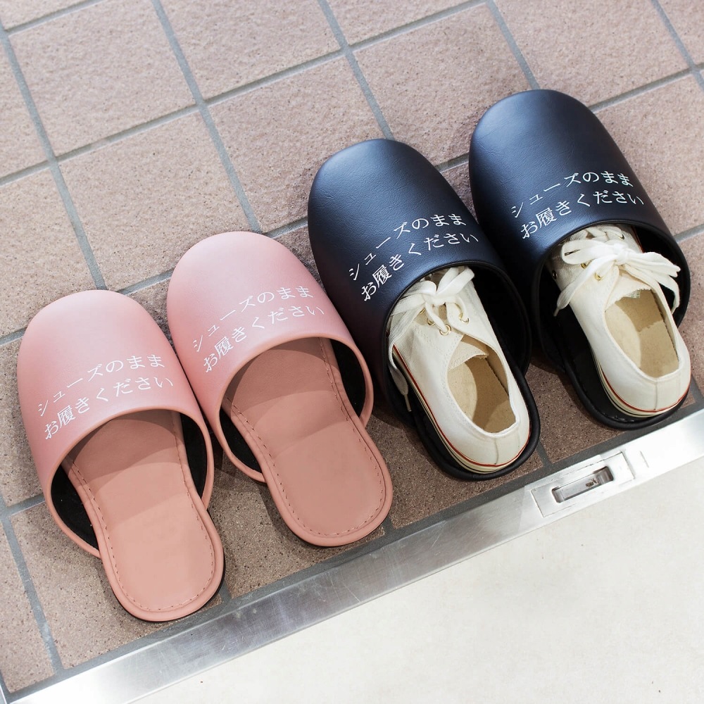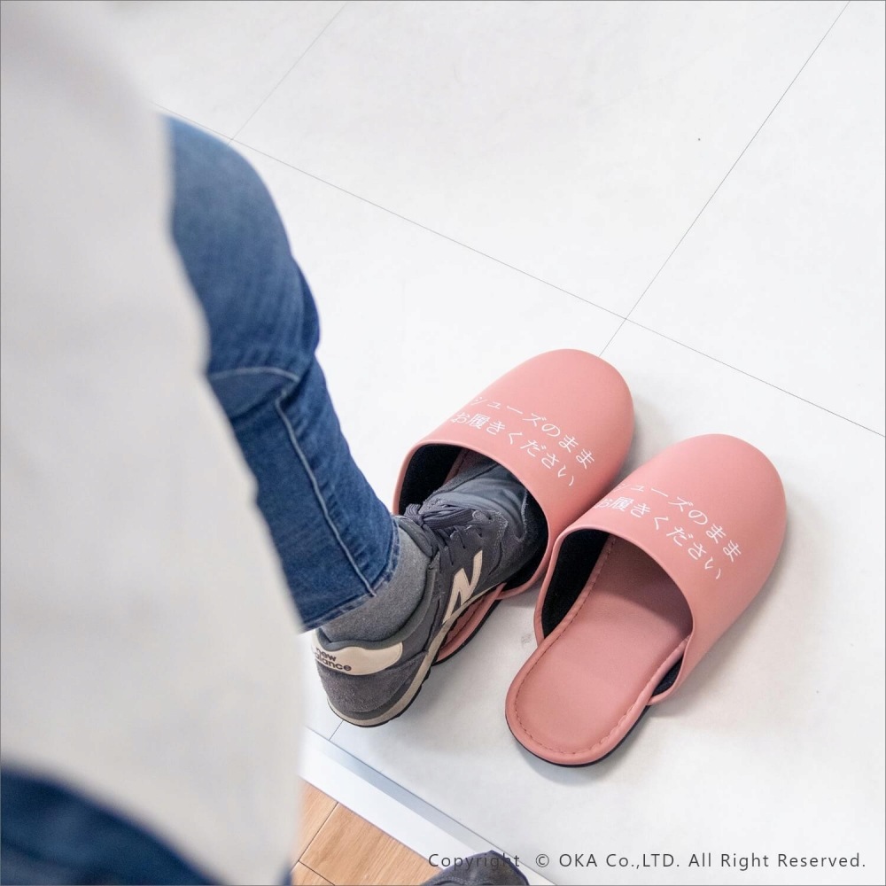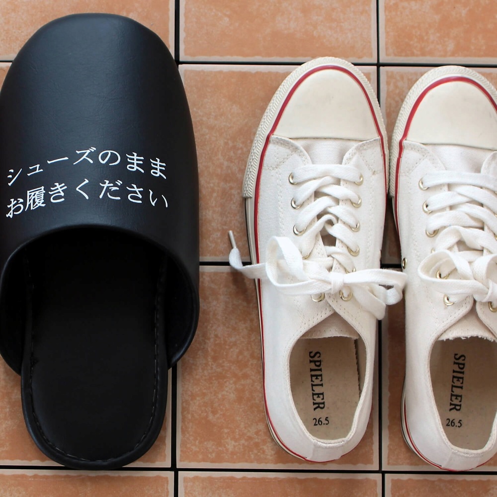 - ●シューズそのままスリッパは床面の靴の汚れを軽減するための仮履き用スリッパです。長距離の歩行や長時間の利用を目的とはしておりません。 ●ヒールが高いものや細身のパンプスの場合、スリッパと靴が密着できず危険です。スニーカーなどの、かかとの無いもの、もしくは低めの靴でご利用ください。 ●滑りやすい場所を歩く場合や、傾斜の上がり下りでのご使用は危険ですので手すり・壁などにつかまって十分に注意して歩いてください。 ●転倒防止のため、スリッパを履いたまま飛び跳ねたり、あ知ったり、激しい運動はしないでください。 ●汚れた場合は、固く絞った布で水拭き、もしくは乾拭きしてください。 ●シンナー・ベンジン等は使用しないでください。変色の原因になります。