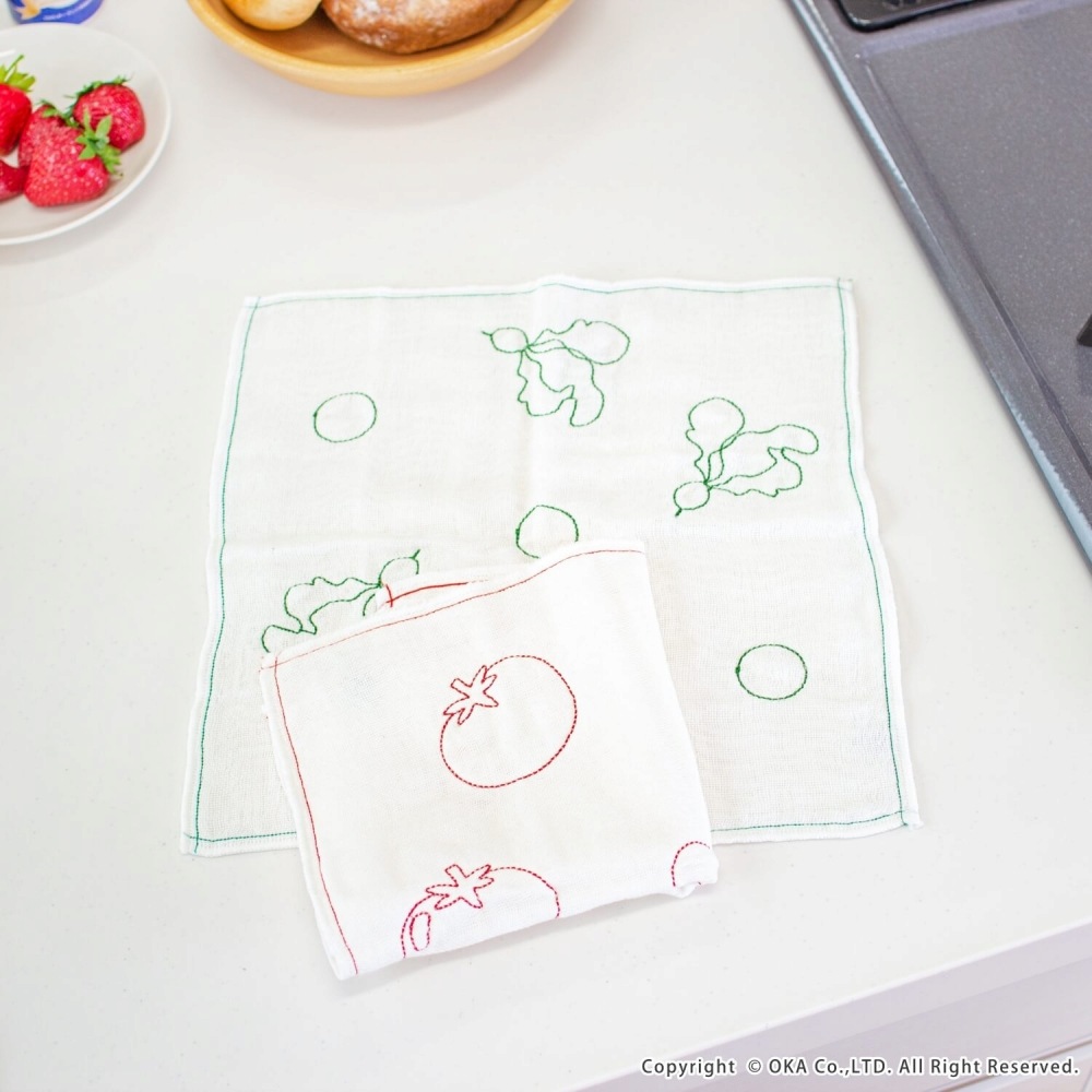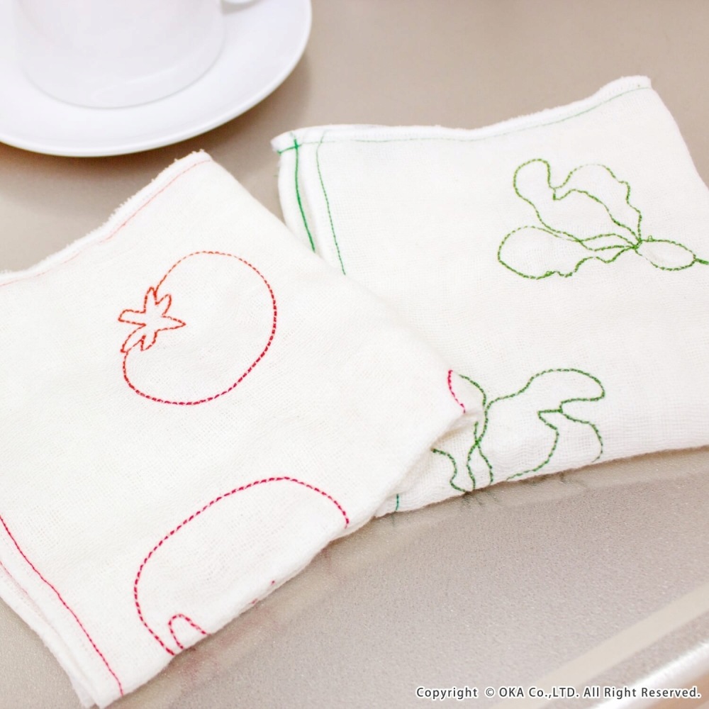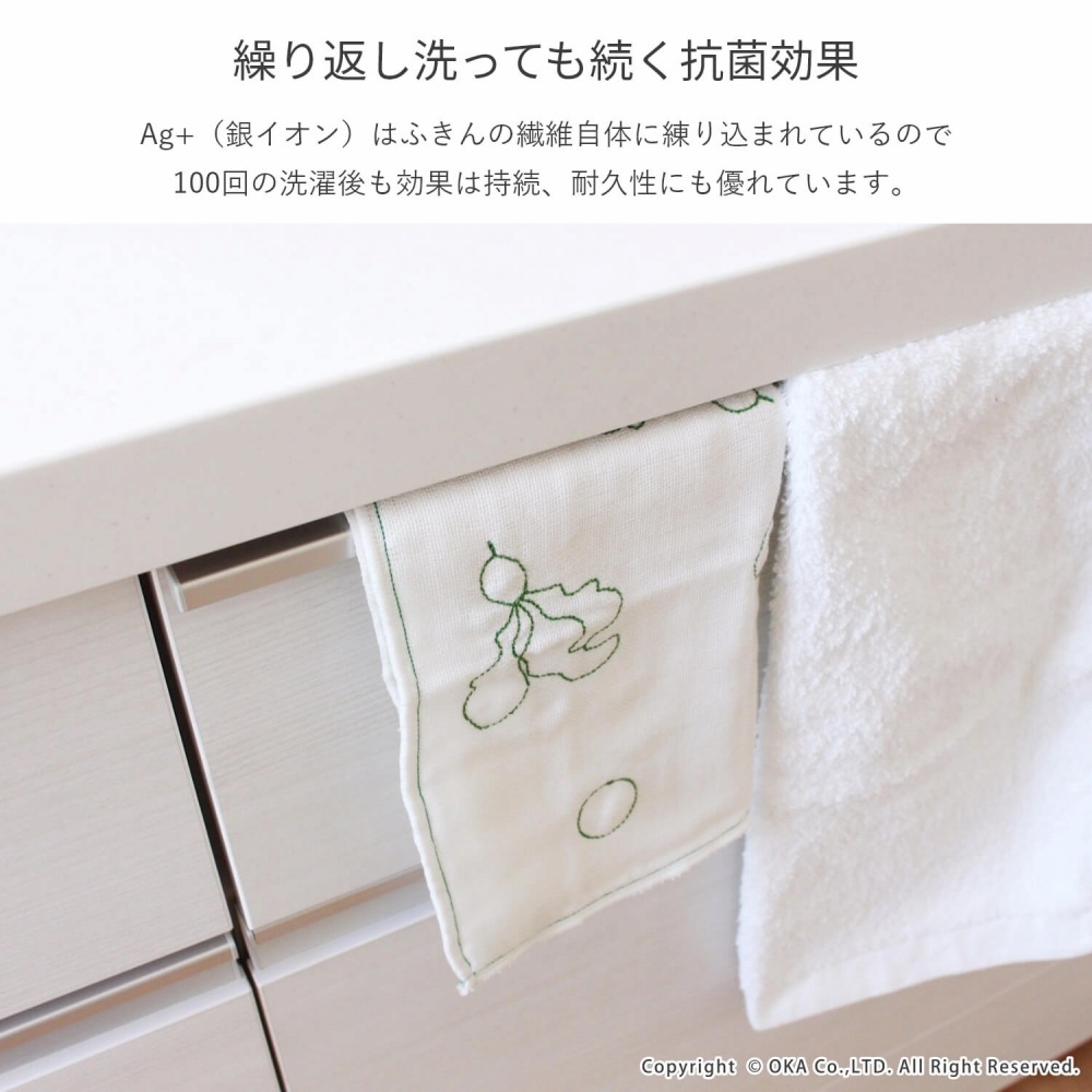 手になじむ使いやすさ。変わらない台所の定番「綿かや織りふきん」に、おしゃれな刺繍入りが仲間入り。真っ白なふきんにトマトやラディッシュの刺繍がアクセント。毎日使ってもくたびれにくく長く使えるかや織りふきん。ふきんに表裏同じ縫い目で縫うことでより丈夫になる「運針」を兼ねて野菜の刺繍を施しました。ふきんの繊維には、Ag+(銀イオン)を練りこんだものを使用しています。この銀イオンが、イヤなニオイの原因となる雑菌を<直接抗菌>+<光触媒抗菌>のW抗菌により雑菌の成育を抑え、イヤなニオイを抑えます。