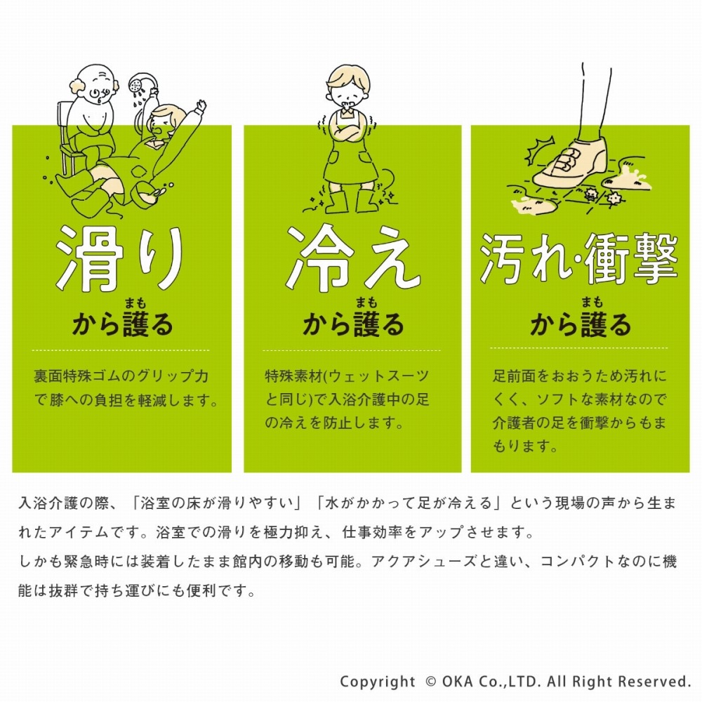 特殊ゴムのグリップ力とソフトな特殊素材で動きやすく、滑りやすい入浴介護中の介護者の足を護る。