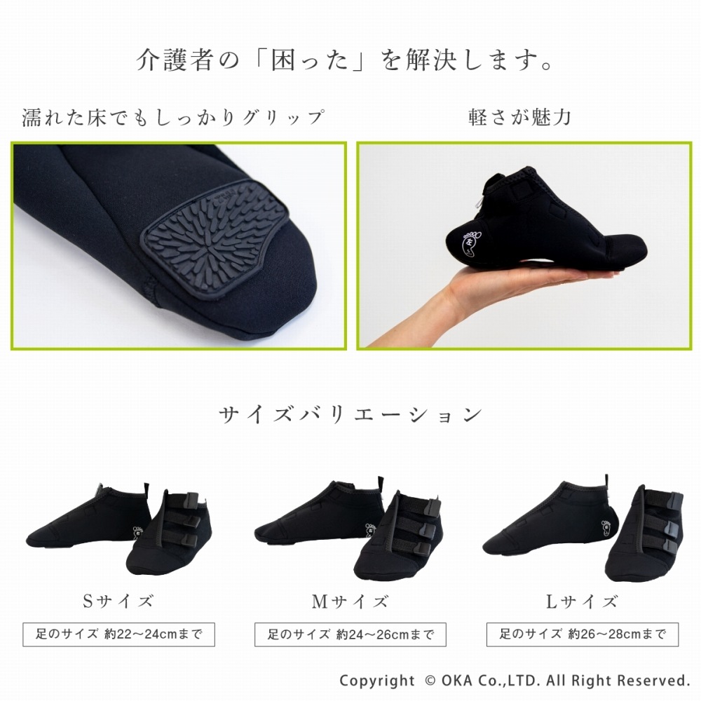 入浴介護の際「浴室の床が滑りやすい」「水がかかって足が冷える」という現場の声から開発。浴室での滑りを極力抑え、仕事効率をアップさせます。コンパクトに丸めることができるソフトな素材を使用し、かさばらず持ち運びが簡単。着脱しやすいマジックテープで煩わしさが軽減されます。サイズも3サイズからお選びいただけるので足にフィットしやすく安全にご使用いただけます。※完全防水ではありません。