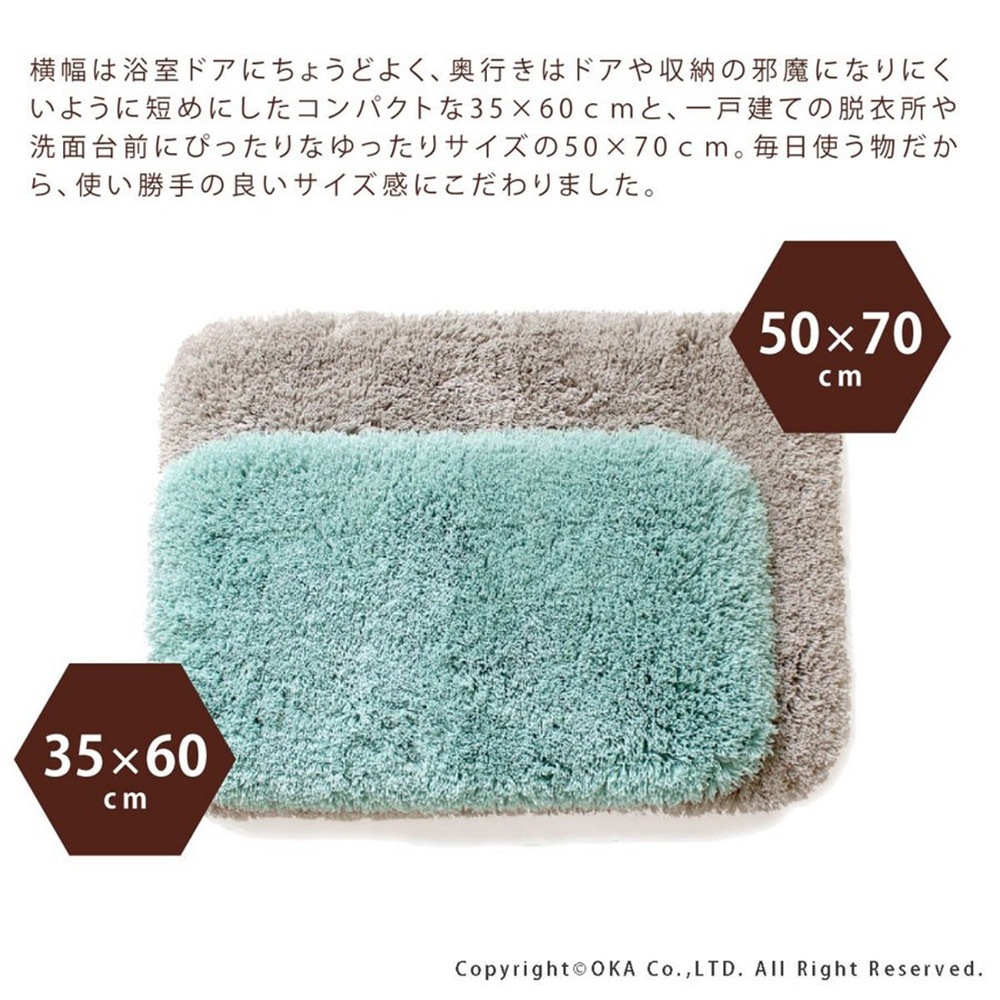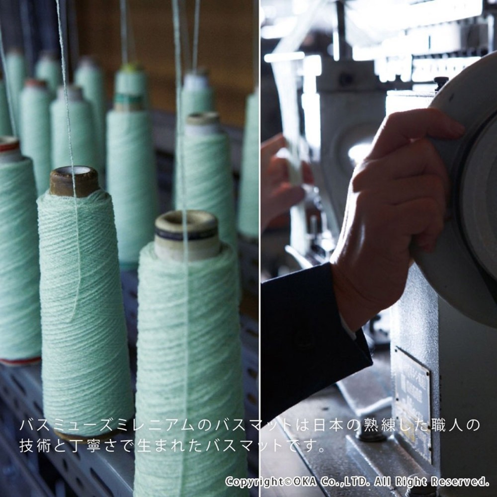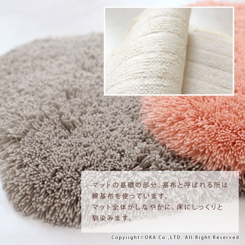 歴代最長の40mmを誇るふかふかの長い毛足と、密度のベストバランスでリッチな踏み心地を実現しました。吸水・速乾性に優れた特殊吸水素材「乾度良好」を使用しているので、二人目、三人目のお風呂上がりもびしょびしょしません。毛足が長く、水分に接する面積が多いので、さらに吸水力がアップしています。長い毛足に指先まで包み込まれる安心感があります。マットの基礎の部分、基布と呼ばれる所は綿基布を使っています。マット全体がしなやかに、床にしっくりと馴染みます。日本の熟練した職人の技術と丁寧さで生まれたバスマットです。