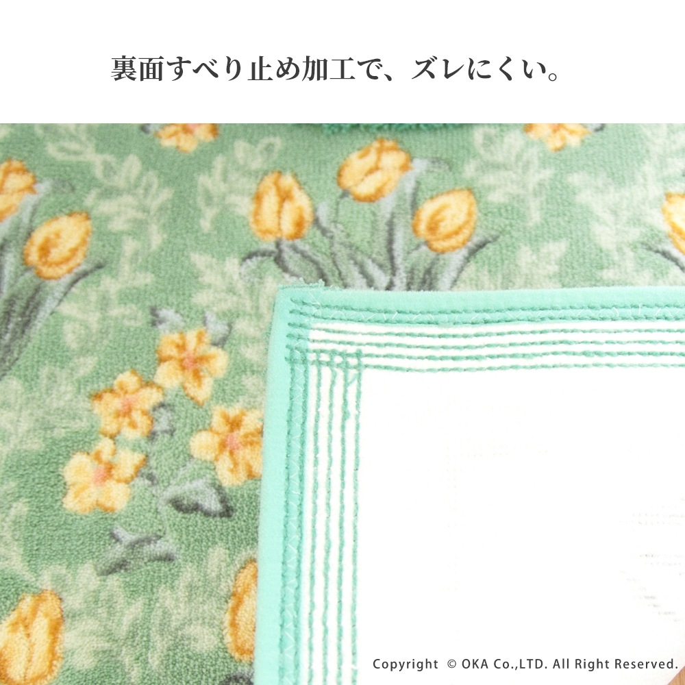 流れるような曲線の柄が特徴的なアール・ヌーボのデザインを取り入れたトイレシリーズ「ロイヤルコレクション アーツ」。フェミニン過ぎず、花柄とオーナメントの地模様がどこかエレガントさを演出。日本製プリントで、細かい柄の表現と凸凹を出すカービングと美しい発色ができ、上質で価値観のあるトイレマットに。ブランドネームの刺繍と縁周りの長めな毛足のデザインがより高級感のある印象にしてくれます。裏面にはすべり止め加工付きでズレにくく、洗濯ネットに入れて丸洗い可能なので、衛生的にお使いいただけます。カラーバリエーションには、エレガントなピンク、植物モチーフを引き立てるグリーン、トレンドカラーのグレーで花の色とベースの色合いがとても美しいです。