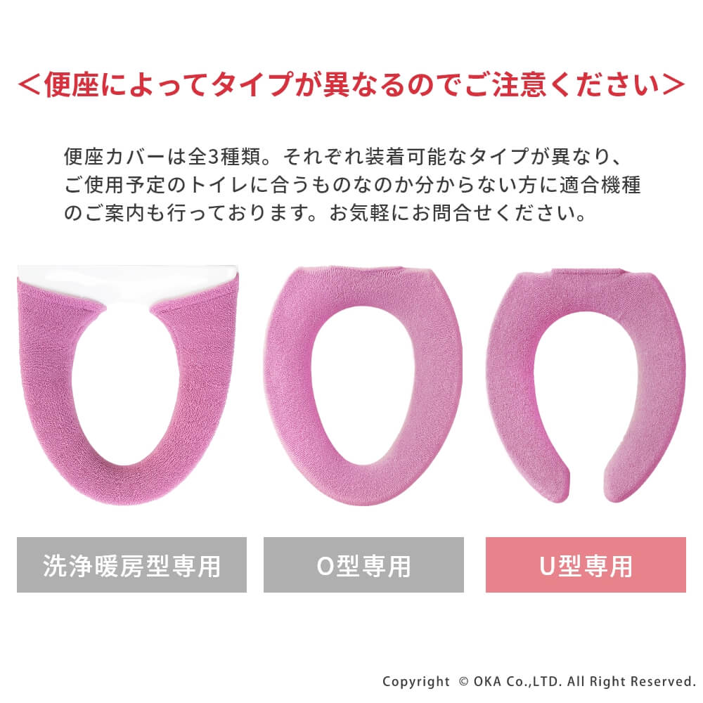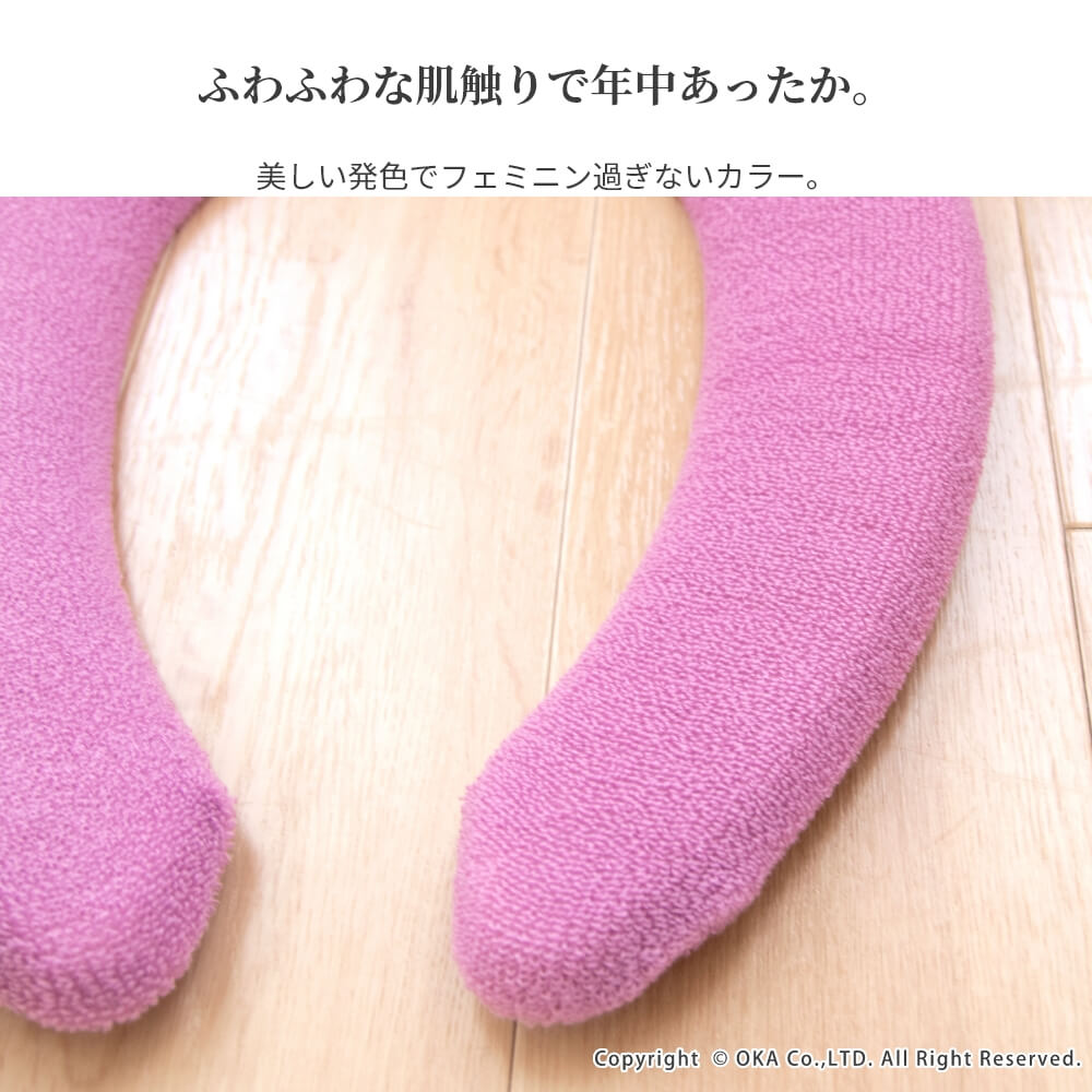 上品な雰囲気で高級感のあるトイレシリーズ「ロイヤルコレクション アーツ」でお揃いにでき、伸びの良い生地でふんわりやわらかい肌触りのU型専用便座カバー。ホックでとめるタイプでズレにくく、洗濯ネットに入れて丸洗い可能なので、ご自宅の洗濯機でお手入れができるので衛生的です。フェミニン過ぎない美しい発色のピンク、グリーン、グレーの3色。