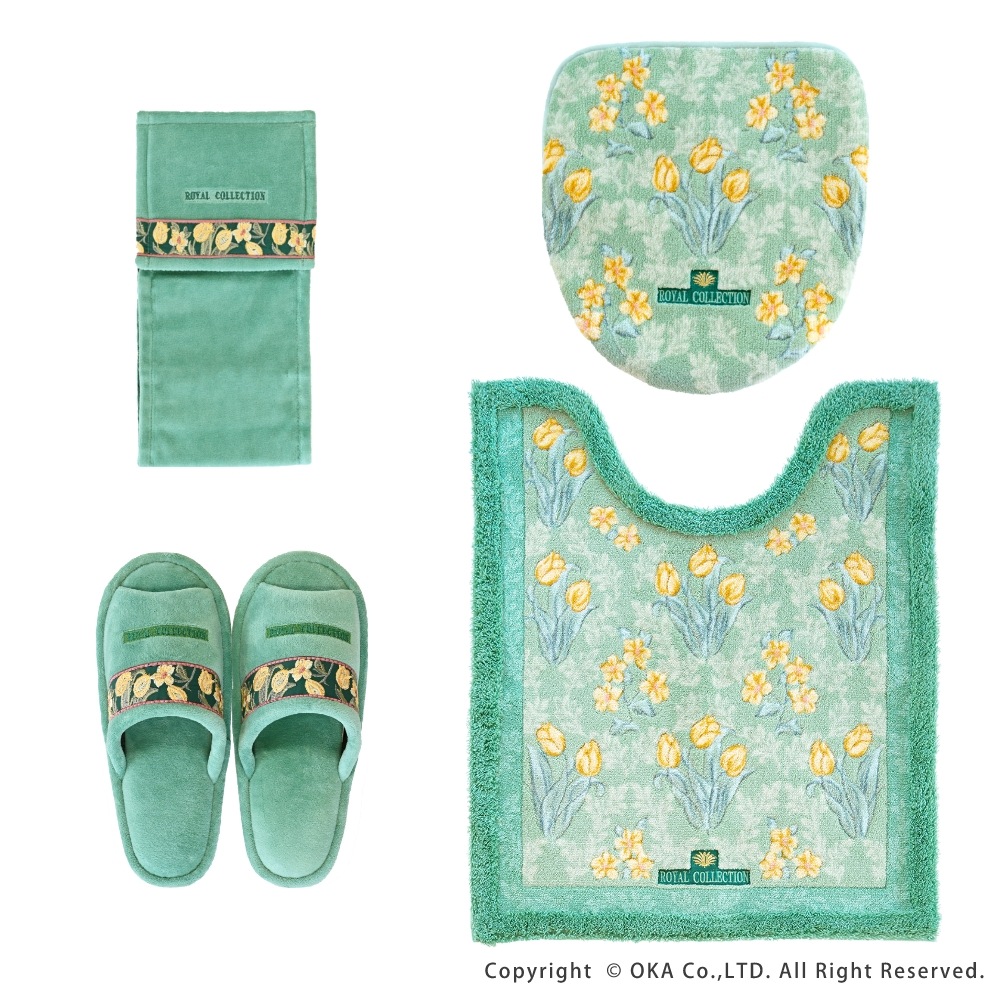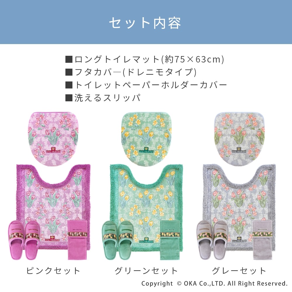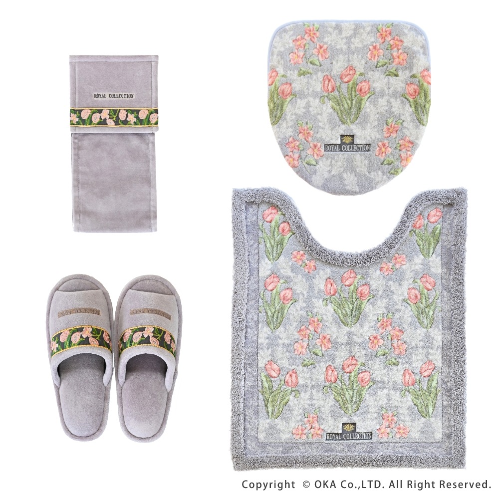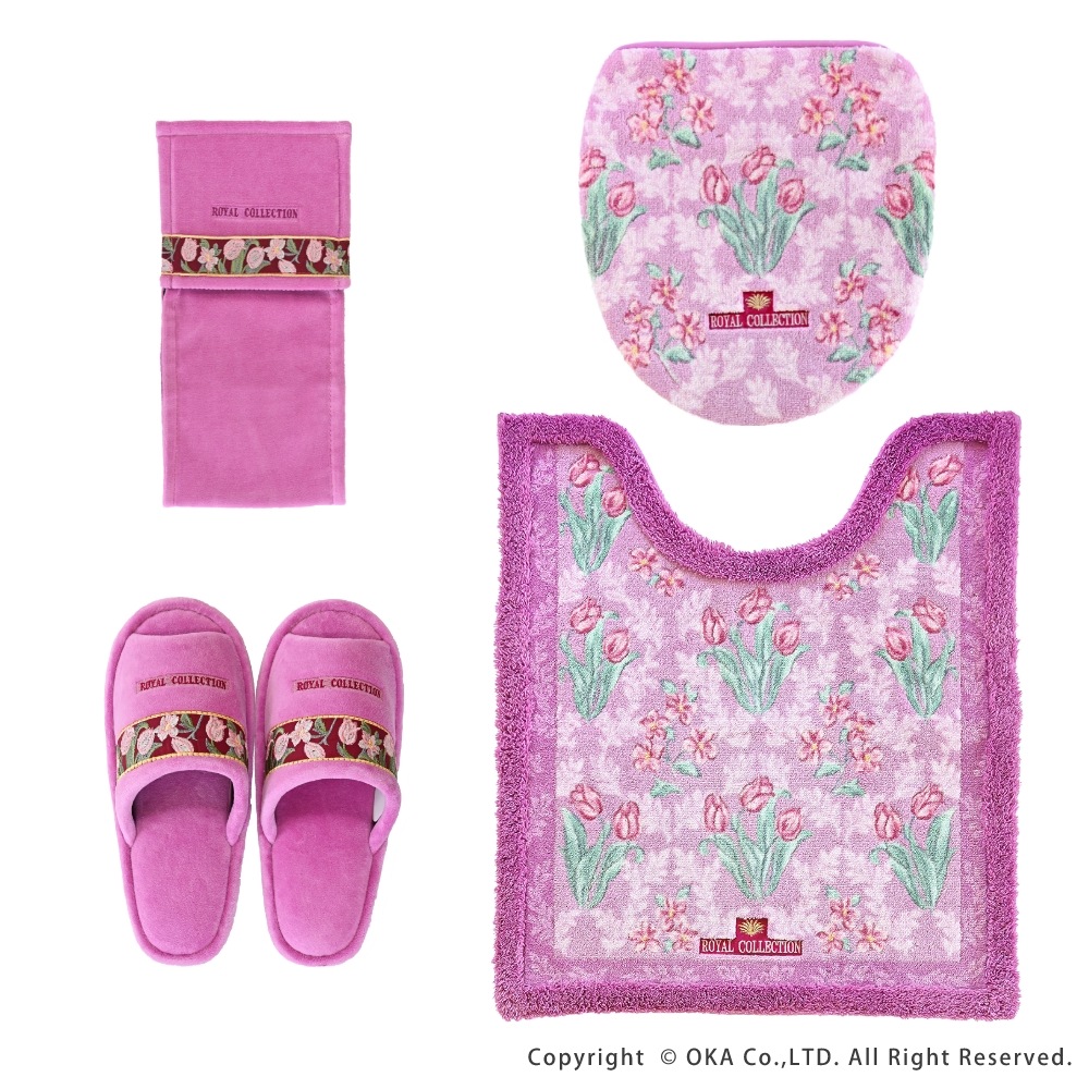 ロイヤルコレクション アーツ トイレタリシリーズの4点セット。流れるような曲線の柄が特徴的なアール・ヌーボのデザインを取り入れたトイレシリーズ。フェミニン過ぎず、花柄とオーナメントの地模様がどこかエレガントさを演出。ブランドネームの刺繍デザインがより高級感のある印象にしてくれます。カラーバリエーションには、エレガントなピンク、植物モチーフを引き立てるグリーン、トレンドカラーのグレーで花の色とベースの色合いがとても美しいです。