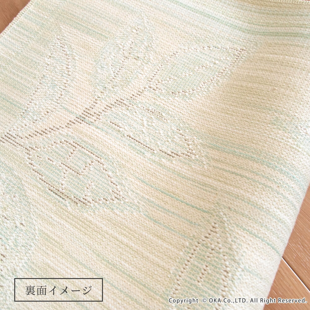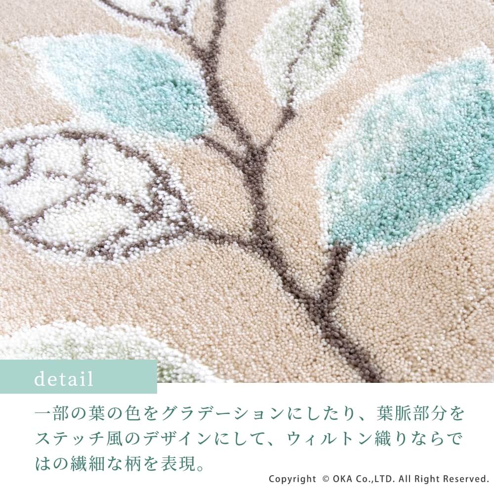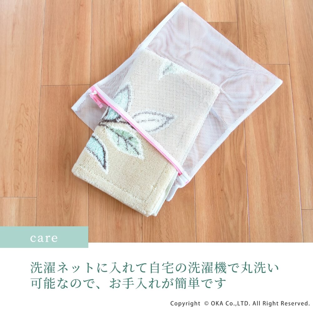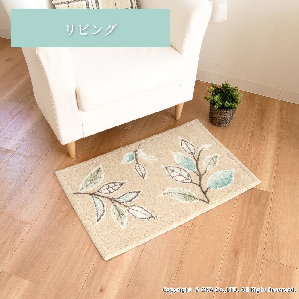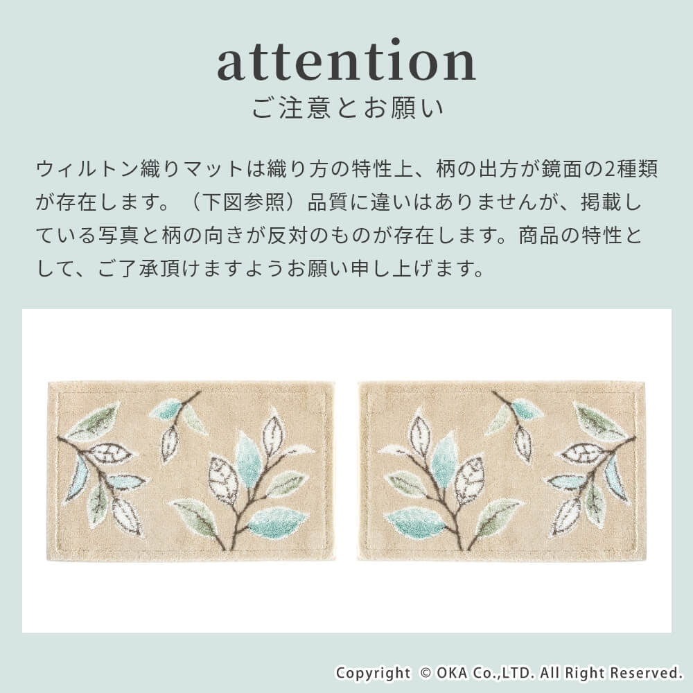 優しい色合いとステッチ風に描かれた植物柄が、癒しを与えてくれる洗える玄関マット「ステッチリーフ」。国内自社製造でお届けする日本デザイン+日本製のウィルトン織りマットです。一目ひとめ、しっかり丁寧に織り込まれたウィルトン織りは耐久性に優れ、復元力にも優れているので、洗濯を繰り返してもへたれにくくなっています。マットの細部の縫製まで手を抜かない日本製で毛羽立ちが少ないのが特徴です。 扱いやすく薄手でしっかりしたウィルトン織りのマットですので、玄関だけでなく、ベットサイドやソファ前などのインテリアとしてもお使いいただけます。 裏面の四隅には吸着シートがついているので、人がよく行き来する玄関だからこそ役立ち、掃除機をかけてもめくり上がりにくいのが嬉しいポイントです。風水においても、玄関に植物を取り入れると良いと言われています。生花や植物はお手入れが大変ですが、マットなら簡単に植物を取り入れられるのでおすすめです!