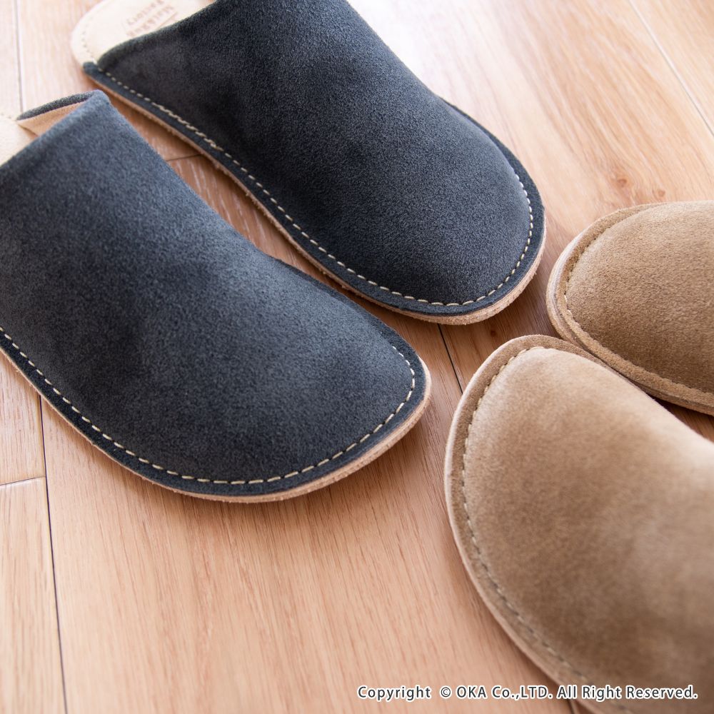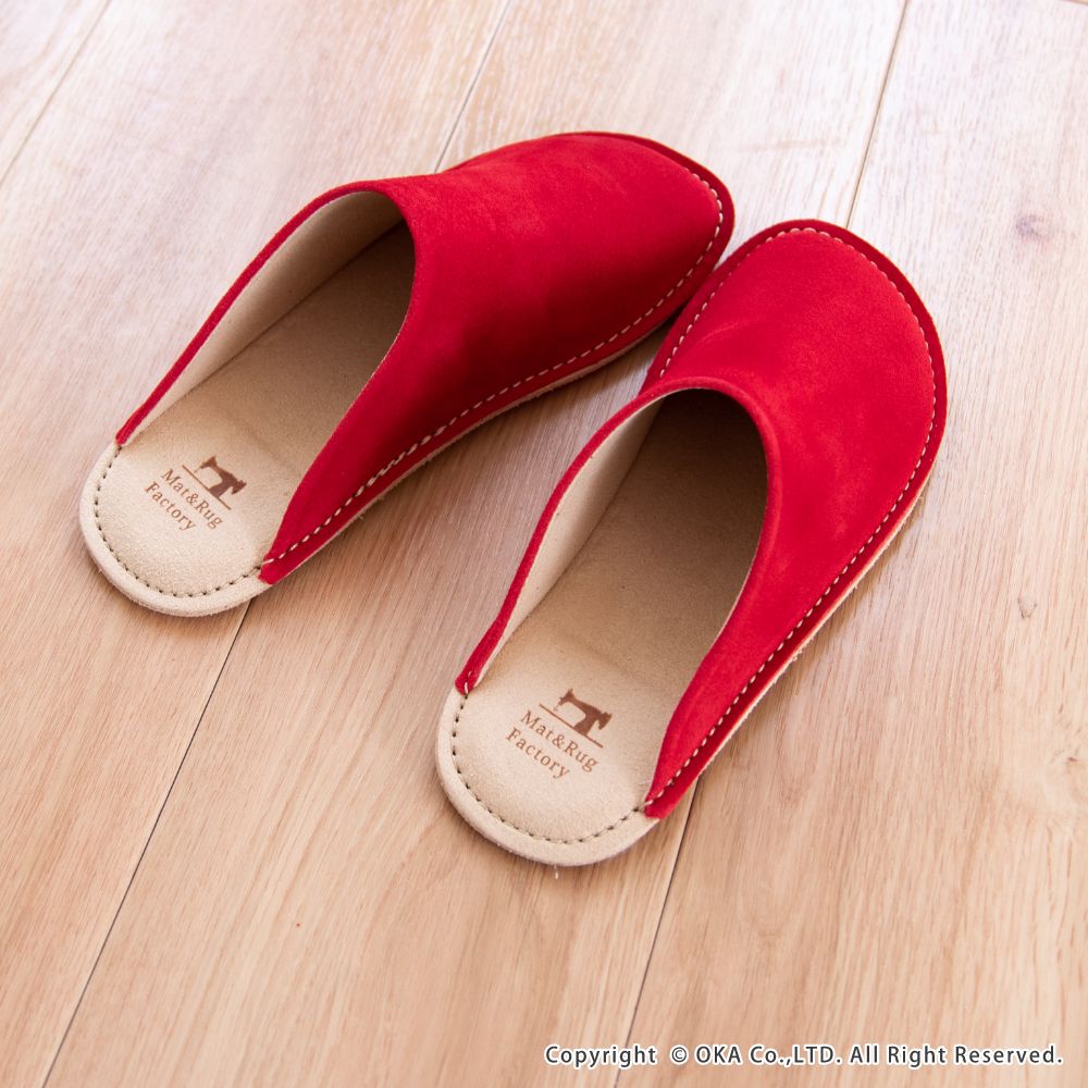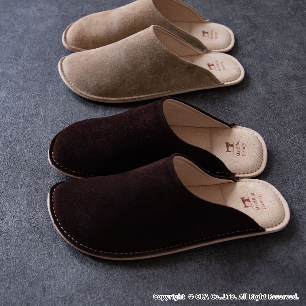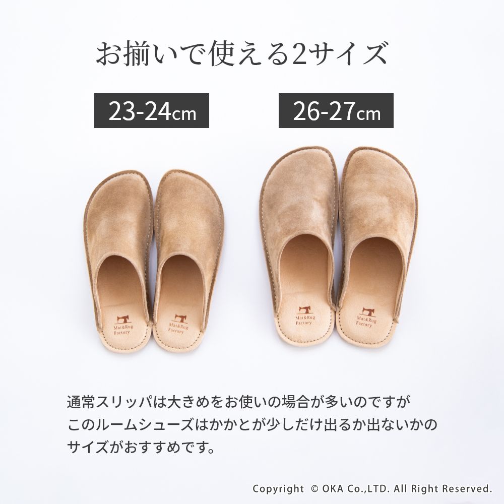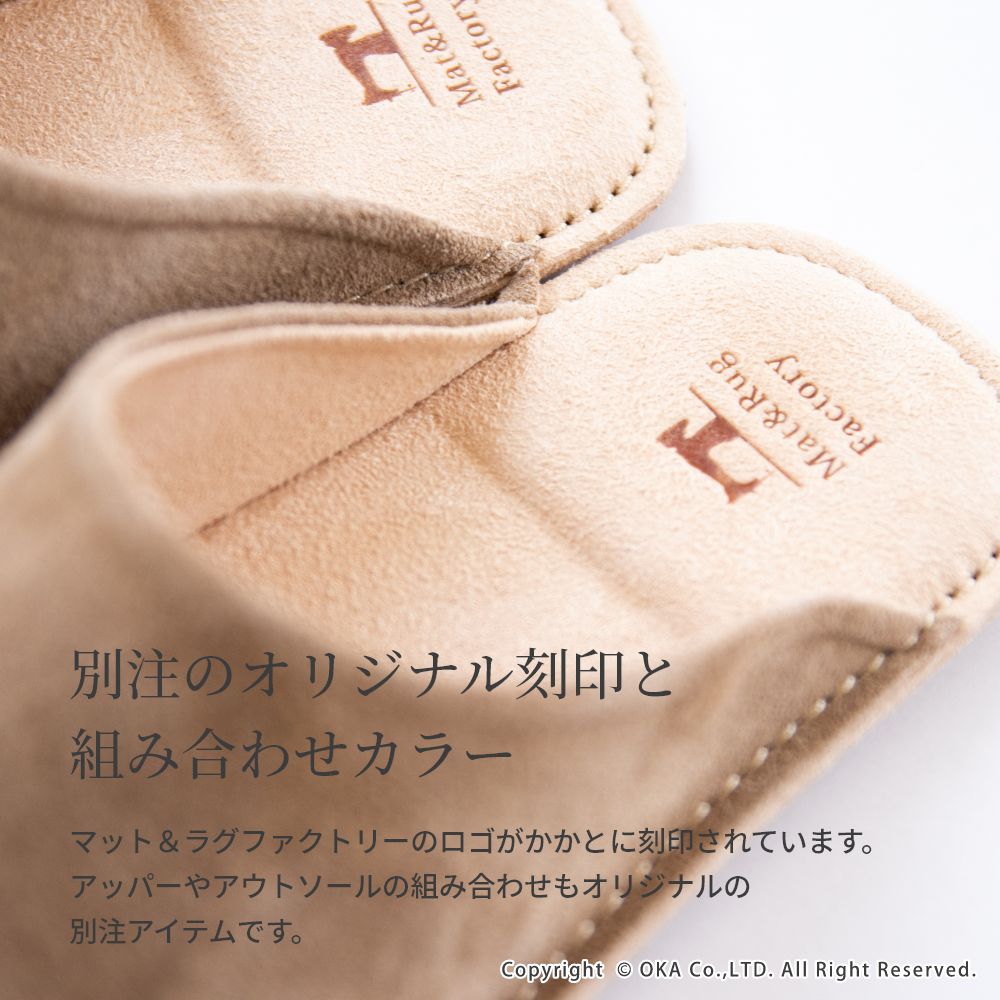老舗手造りサンダルメーカーの卓越した技術で作り上げた履き心地にこだわったスリッパです。靴のように木型を使い、時間と手間をかけて成形する作業をすることで履き始めから足にフィットするルームシューズが完成。アッパーは天然皮革で履くほどに味わい深く。インソールとライニング・ソールは脱げにくく滑りにくさを重視したシルキーな人工皮革を起毛させて使用しています。通常スリッパは大きめをお使いの場合が多いのですがこのルームシューズはかかとが少しだけ出るか出ないかのサイズがおすすめです。マット&ラグファクトリーのロゴがかかとに刻印されています。アッパーやアウトソールの組み合わせもオリジナルの別注アイテムです。