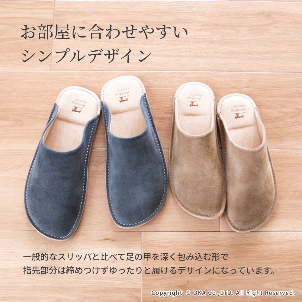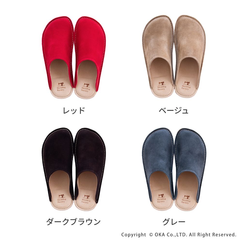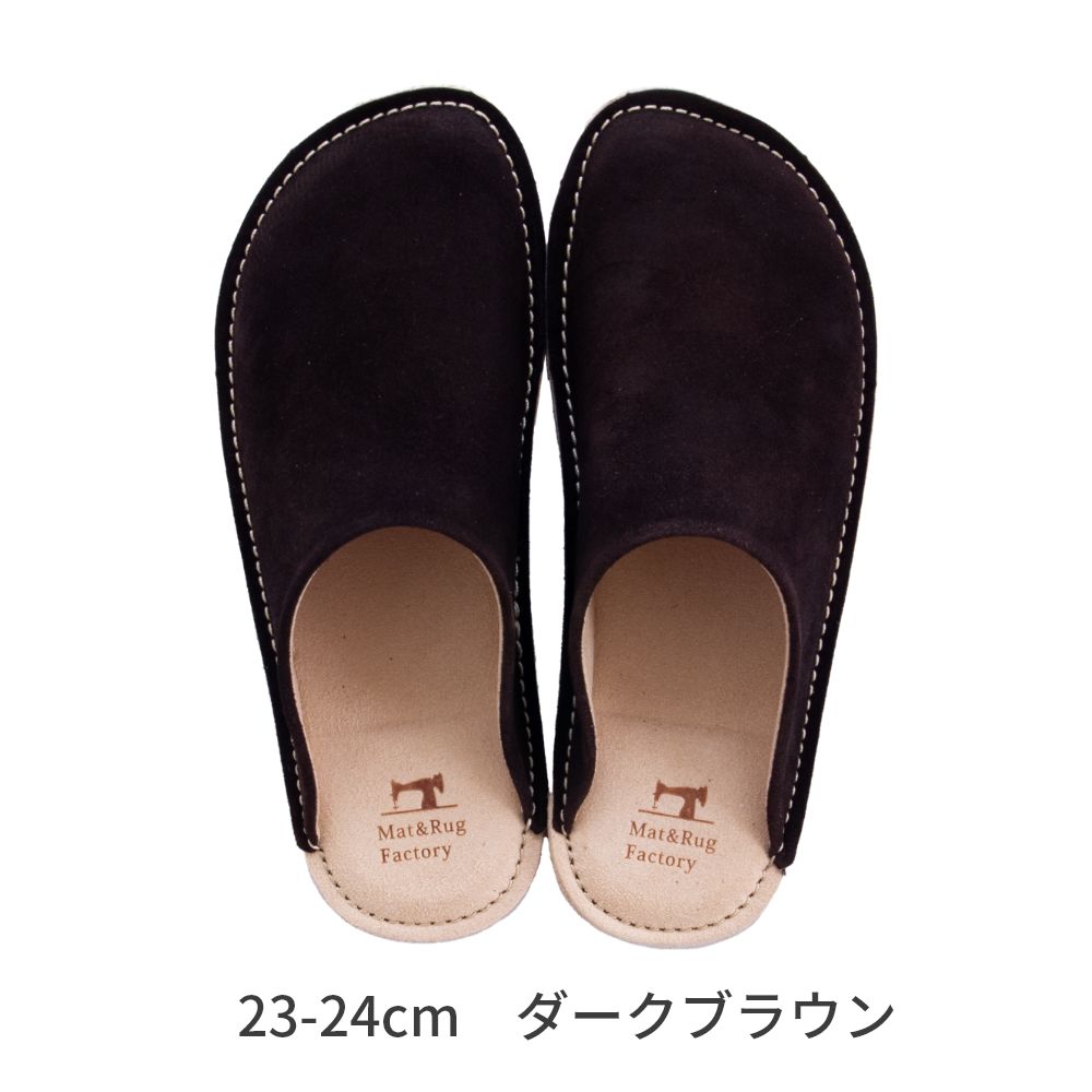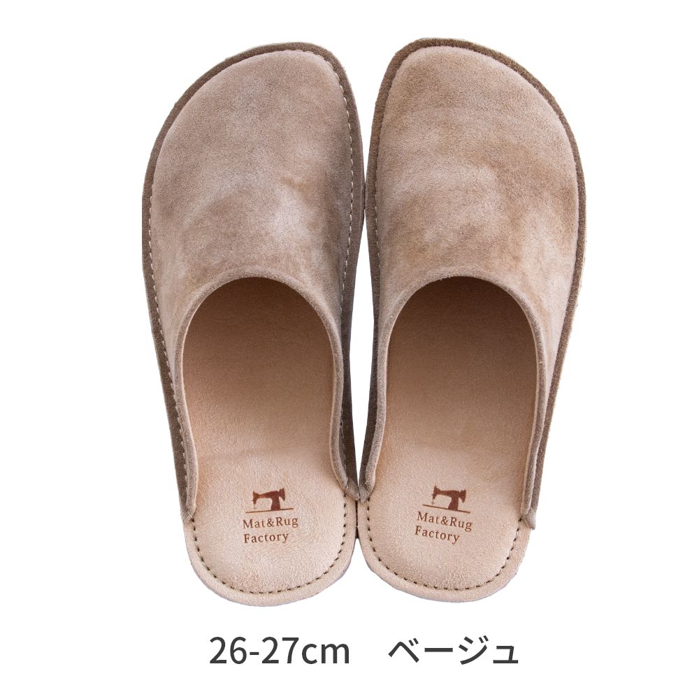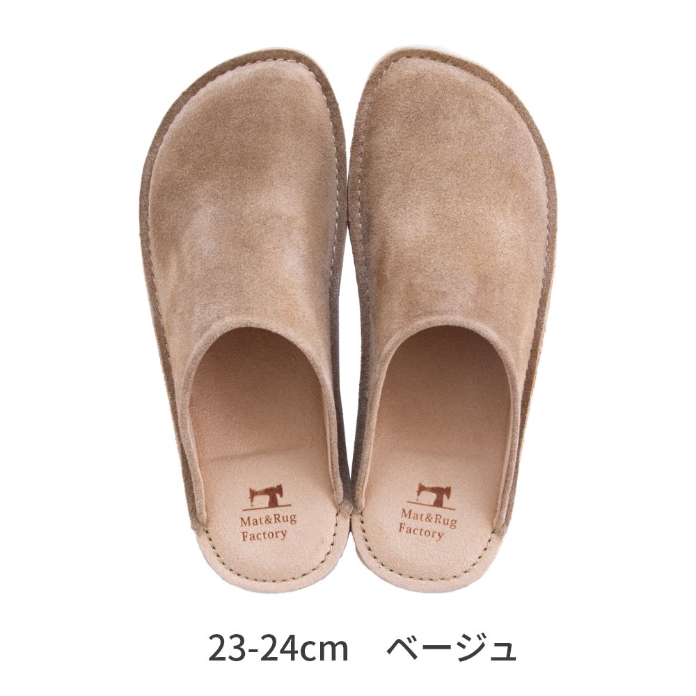 老舗手造りサンダルメーカーの卓越した技術で作り上げた履き心地にこだわったスリッパです。靴のように木型を使い、時間と手間をかけて成形する作業をすることで履き始めから足にフィットするルームシューズが完成。アッパーは天然皮革で履くほどに味わい深く。インソールとライニング・ソールは脱げにくく滑りにくさを重視したシルキーな人工皮革を起毛させて使用しています。通常スリッパは大きめをお使いの場合が多いのですがこのルームシューズはかかとが少しだけ出るか出ないかのサイズがおすすめです。マット&ラグファクトリーのロゴがかかとに刻印されています。アッパーやアウトソールの組み合わせもオリジナルの別注アイテムです。