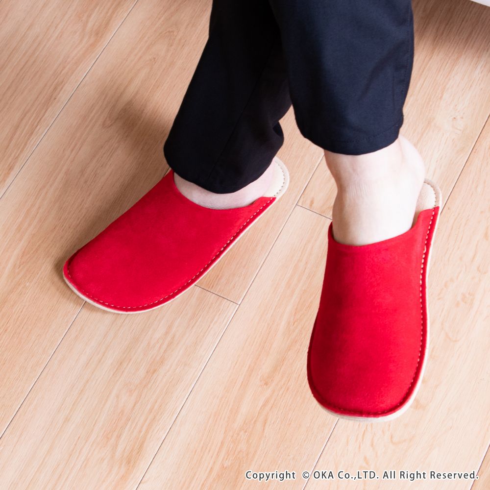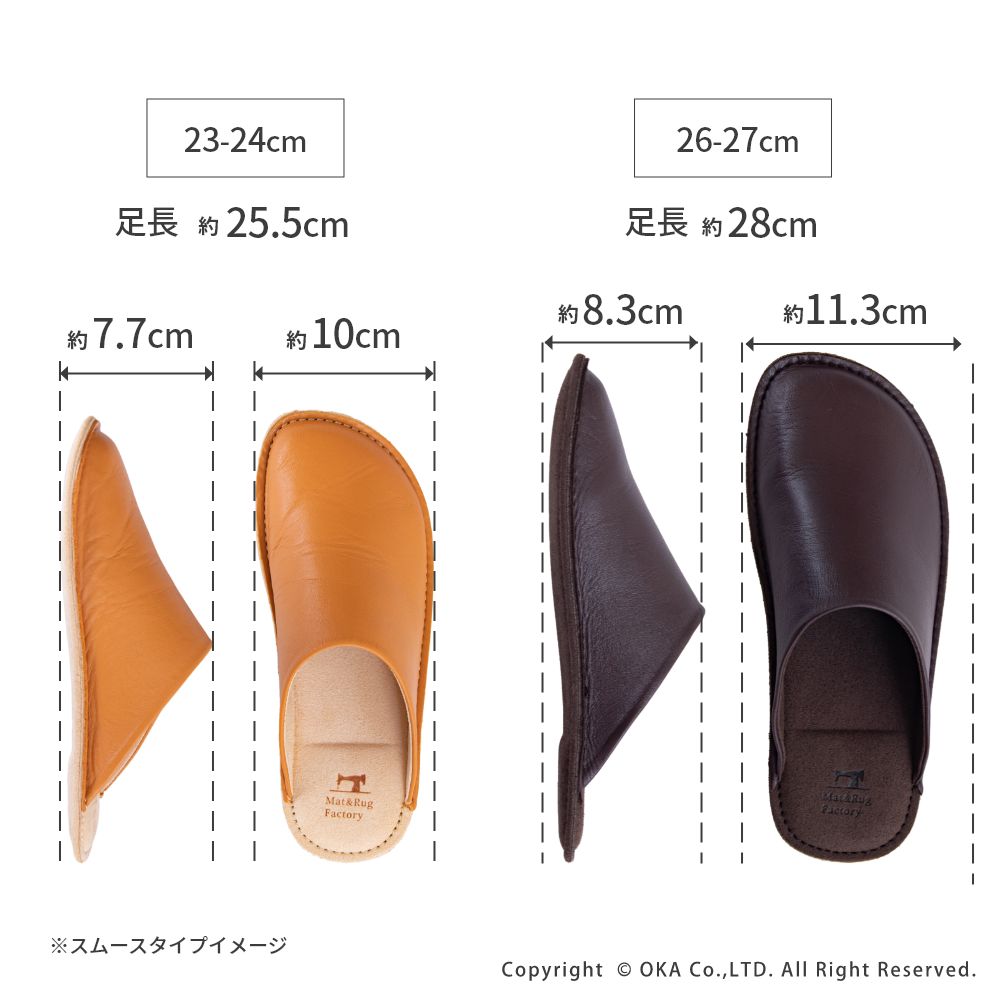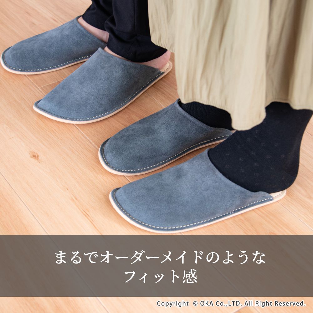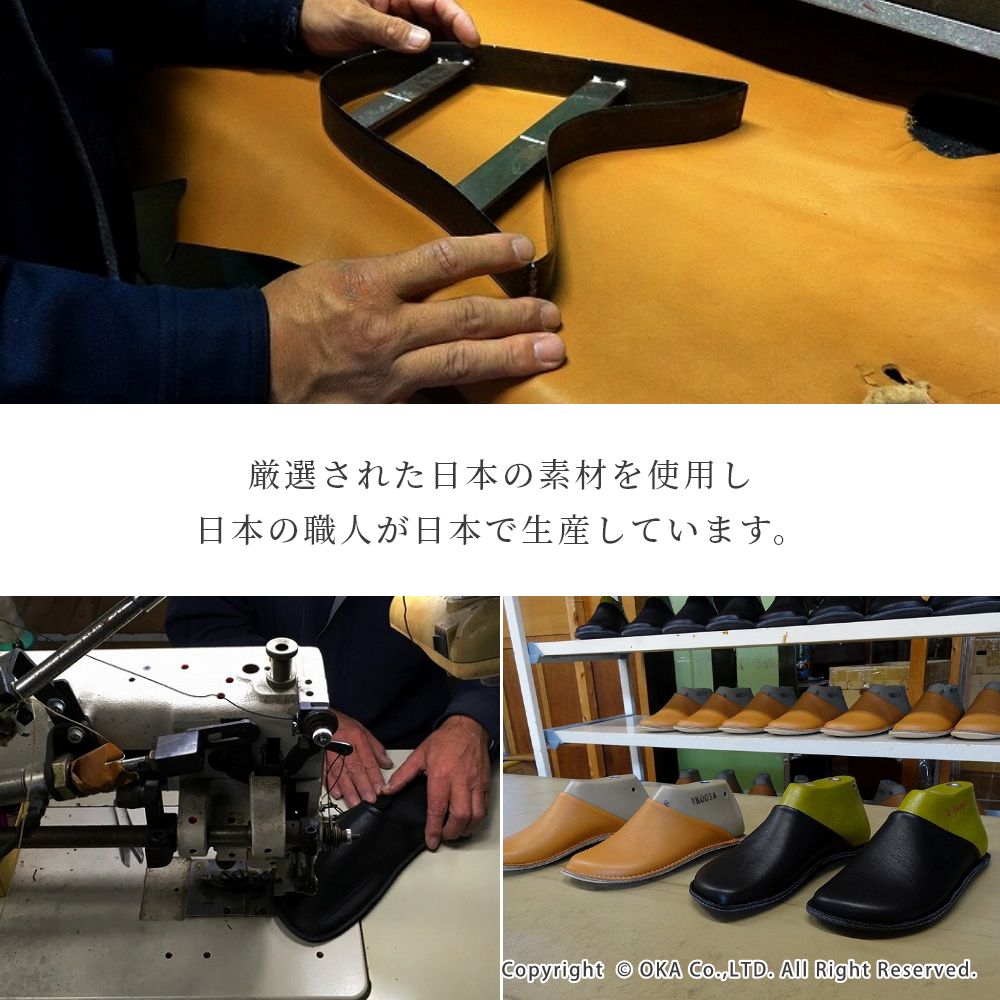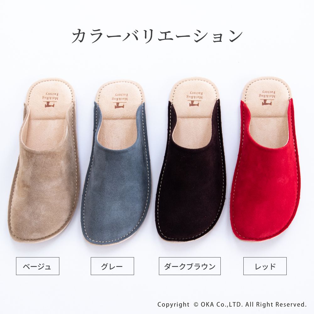 老舗手造りサンダルメーカーの卓越した技術で作り上げた履き心地にこだわったスリッパです。靴のように木型を使い、時間と手間をかけて成形する作業をすることで履き始めから足にフィットするルームシューズが完成。アッパーは天然皮革で履くほどに味わい深く。インソールとライニング・ソールは脱げにくく滑りにくさを重視したシルキーな人工皮革を起毛させて使用しています。通常スリッパは大きめをお使いの場合が多いのですがこのルームシューズはかかとが少しだけ出るか出ないかのサイズがおすすめです。マット&ラグファクトリーのロゴがかかとに刻印されています。アッパーやアウトソールの組み合わせもオリジナルの別注アイテムです。