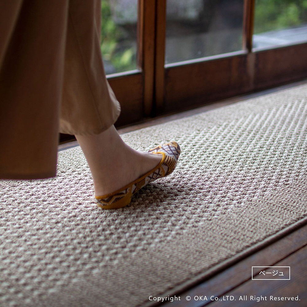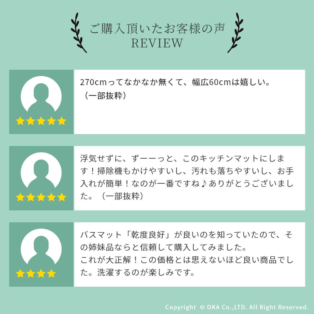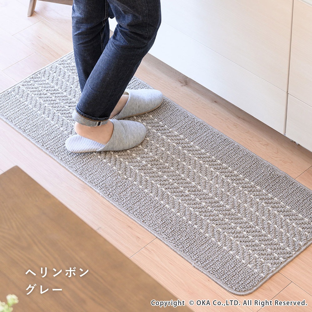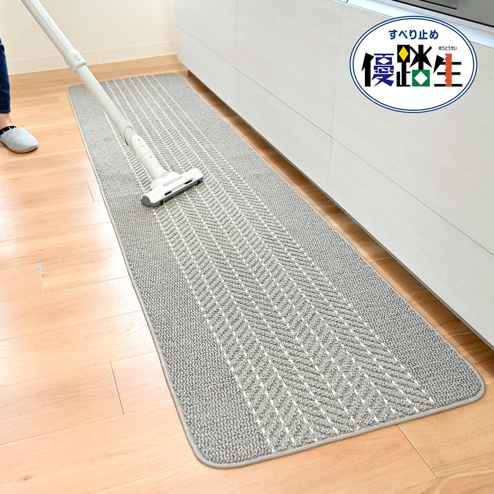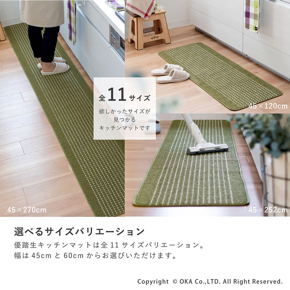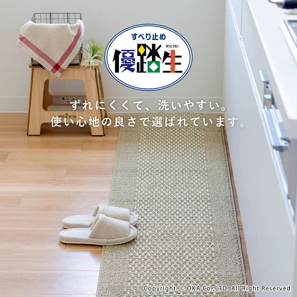 汚れが落ちやすく洗濯後の乾きも早い使いやすいキッチンマットです。優踏生シリーズで好評の、裏ゴムは当社従来品比5倍もの耐久性。すべり止め加工は動きまわるキッチンでもズレにくく快適です。またクッション性も十分にありますが薄手なのでシステムキッチンの引き出しに引っかかりにくく毛羽立ちが少ないので日頃のお手入れも簡単です。